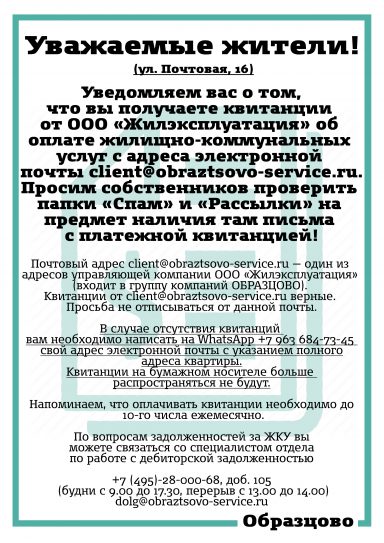 Вниманию жителей дома № 16 по ул. Почтовая!