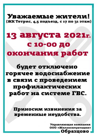 19 августа 2021 г. с 09.00 до 12.00 будет прекращена подача холодного и горячего водоснабжения в домев связи с проведением...