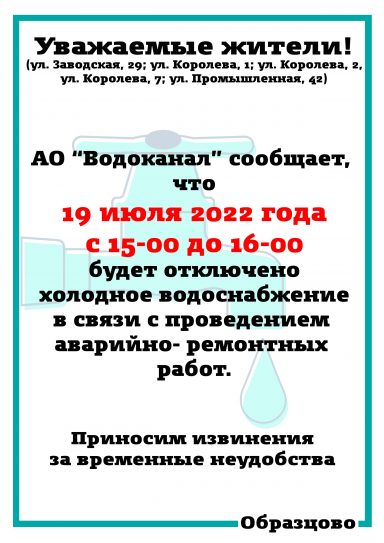 Внимание! АО «Водоканал» информирует об аварийном отключении ХВС!