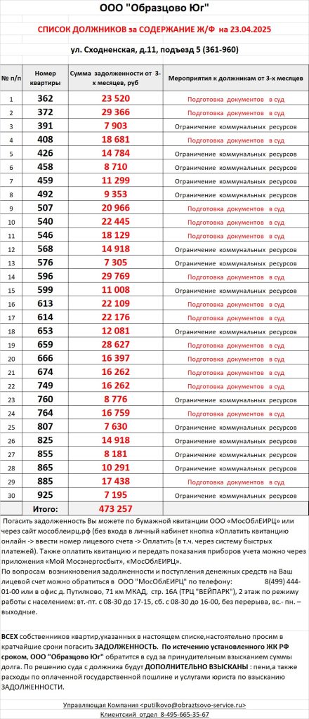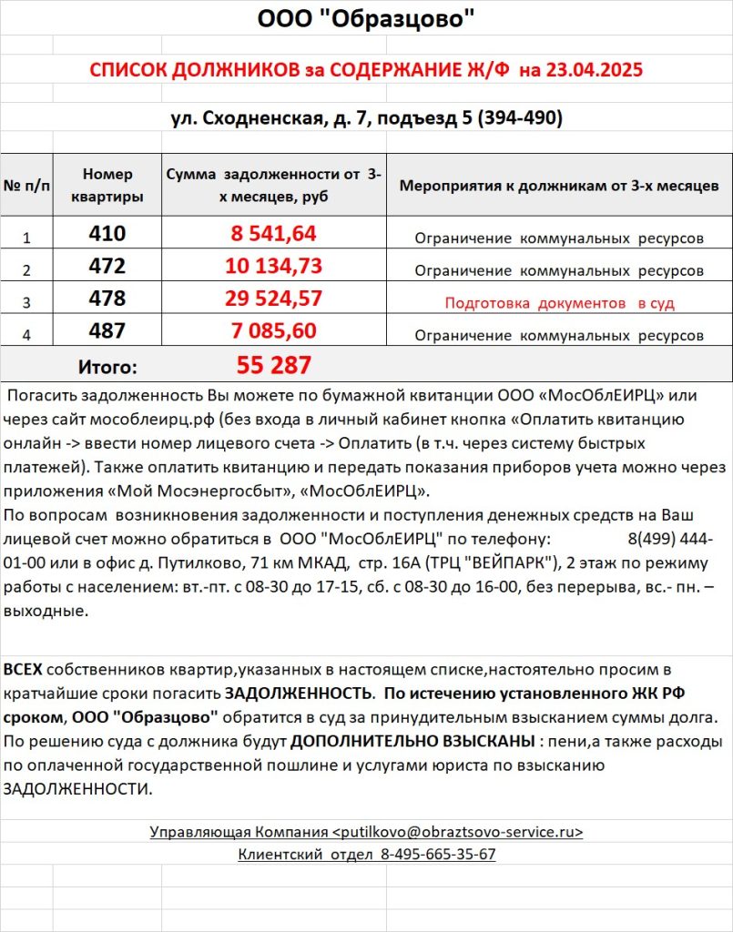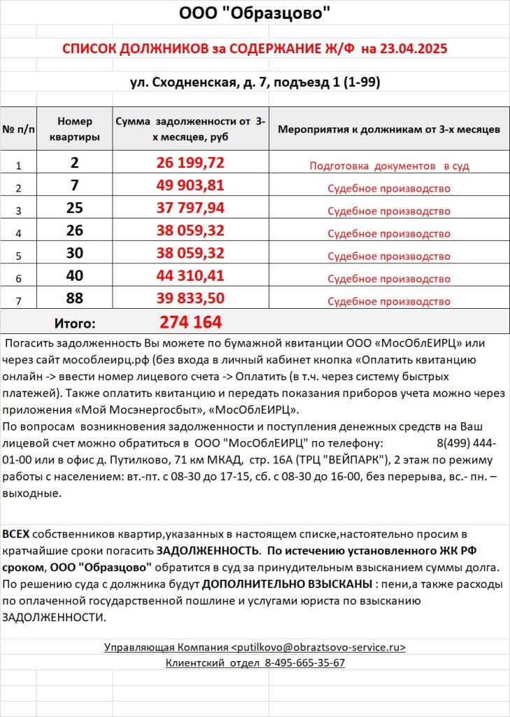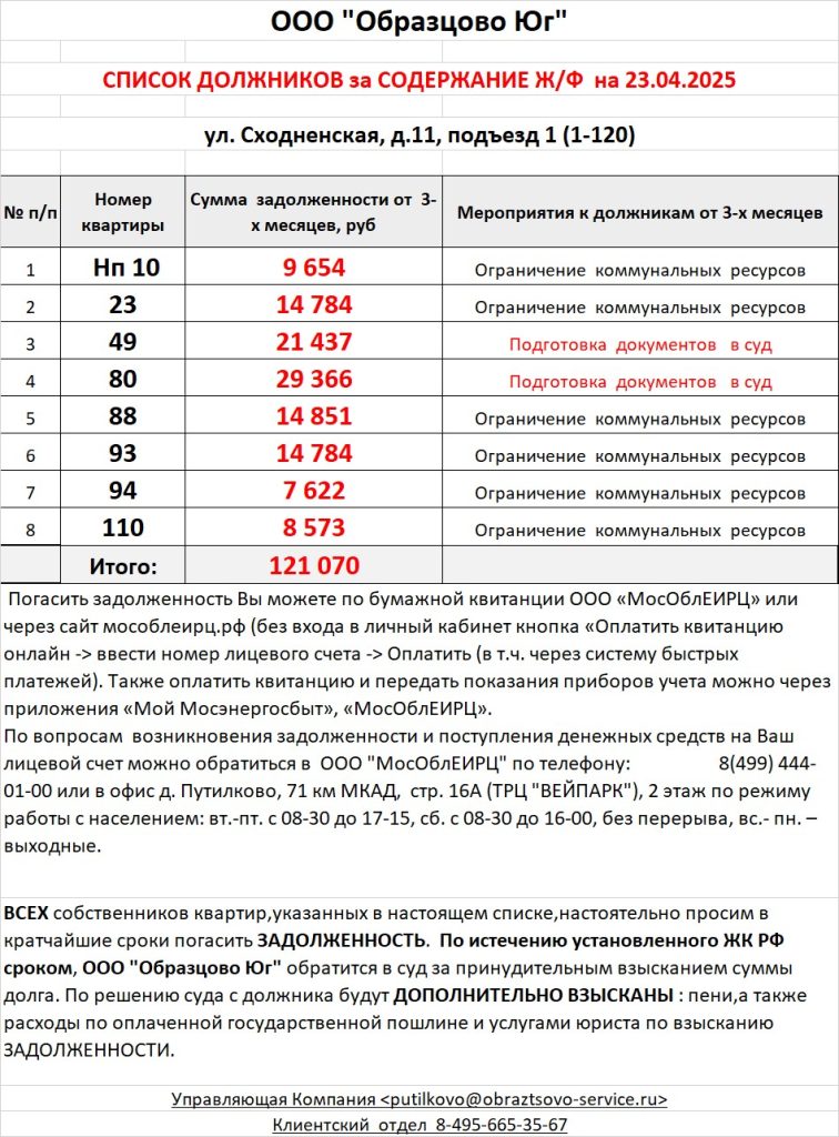 Список должников по коммунальным платежам ул. Сходненская, 25