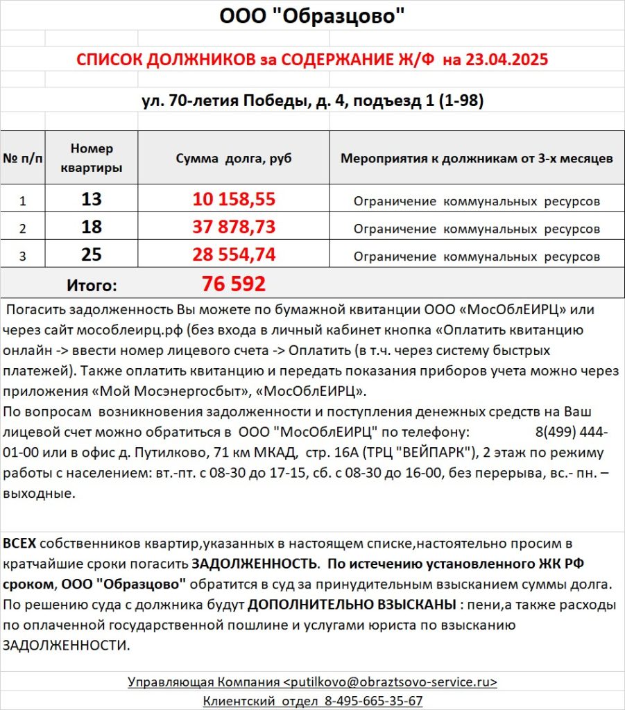 Список должников по коммунальным платежам ул. 70-летия Победы, 4