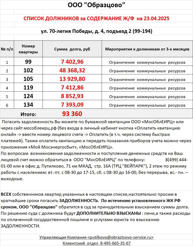 По вопросам имеющейся дебиторской задолженности и начислениям просим обращаться в МособлЕИРЦ, ТЦ «ВЭЙ Парк», 2 этаж.