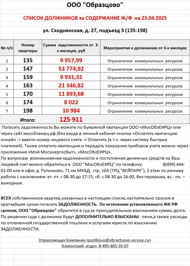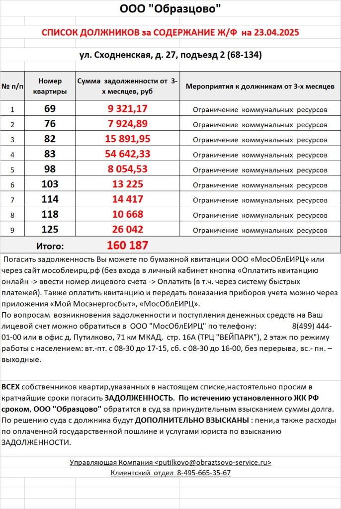 Список должников по коммунальным платежам ул. Сходненская, 27