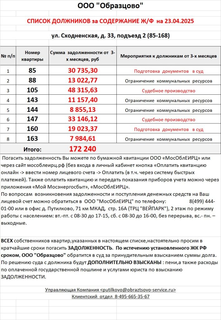 Список должников по коммунальным платежам ул. Сходненская, 33