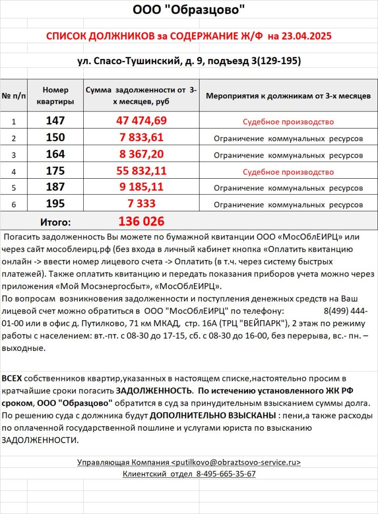 Список должников по коммунальным платежам Спасо-Тушинский бульвар, 9