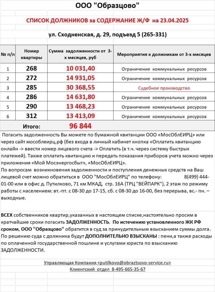 Список должников по коммунальным платежам ул. Сходненская, 29