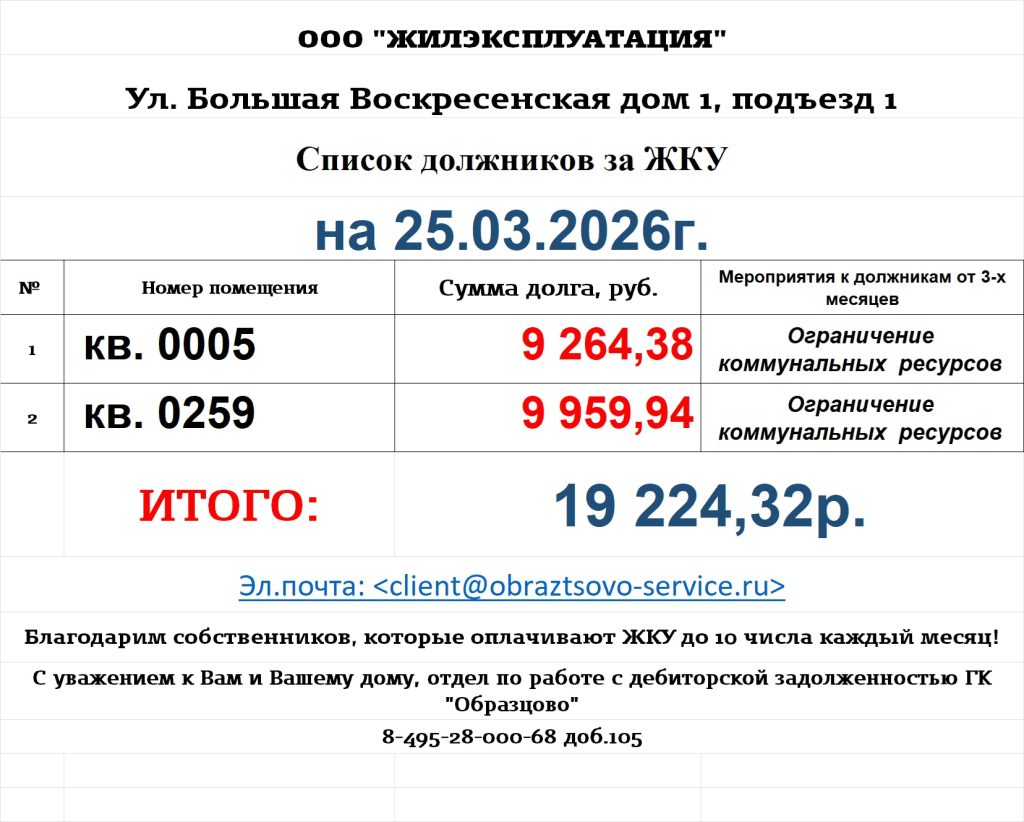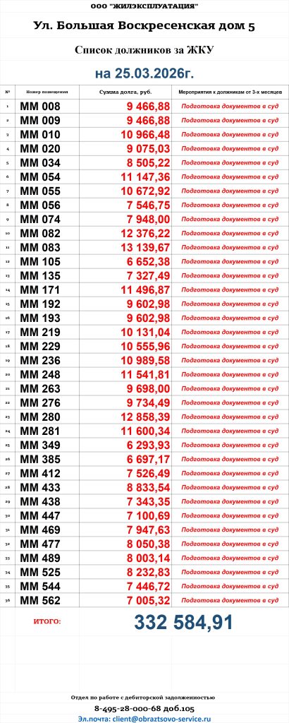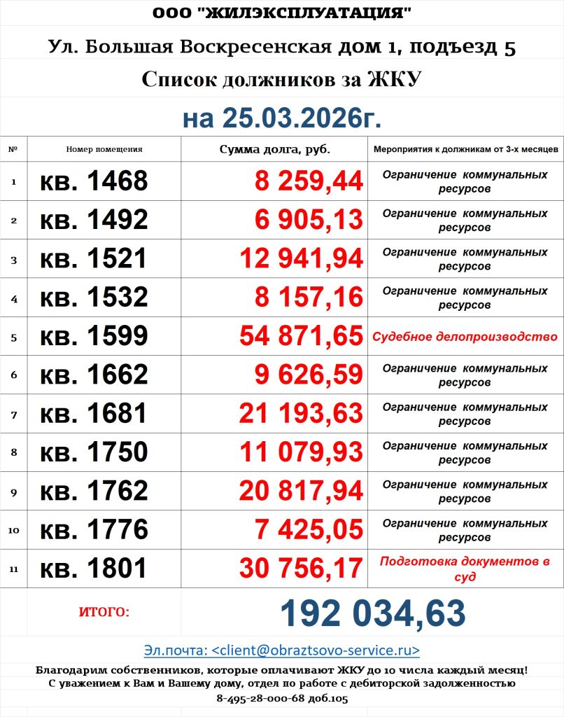 Список должников по коммунальным платежам ЖК Тетрис (ул. Большая Воскресенская, 1, 5)