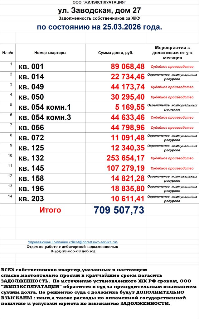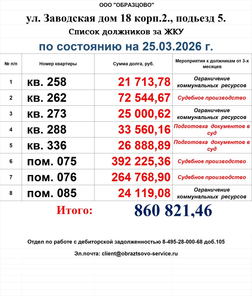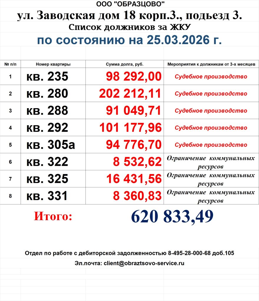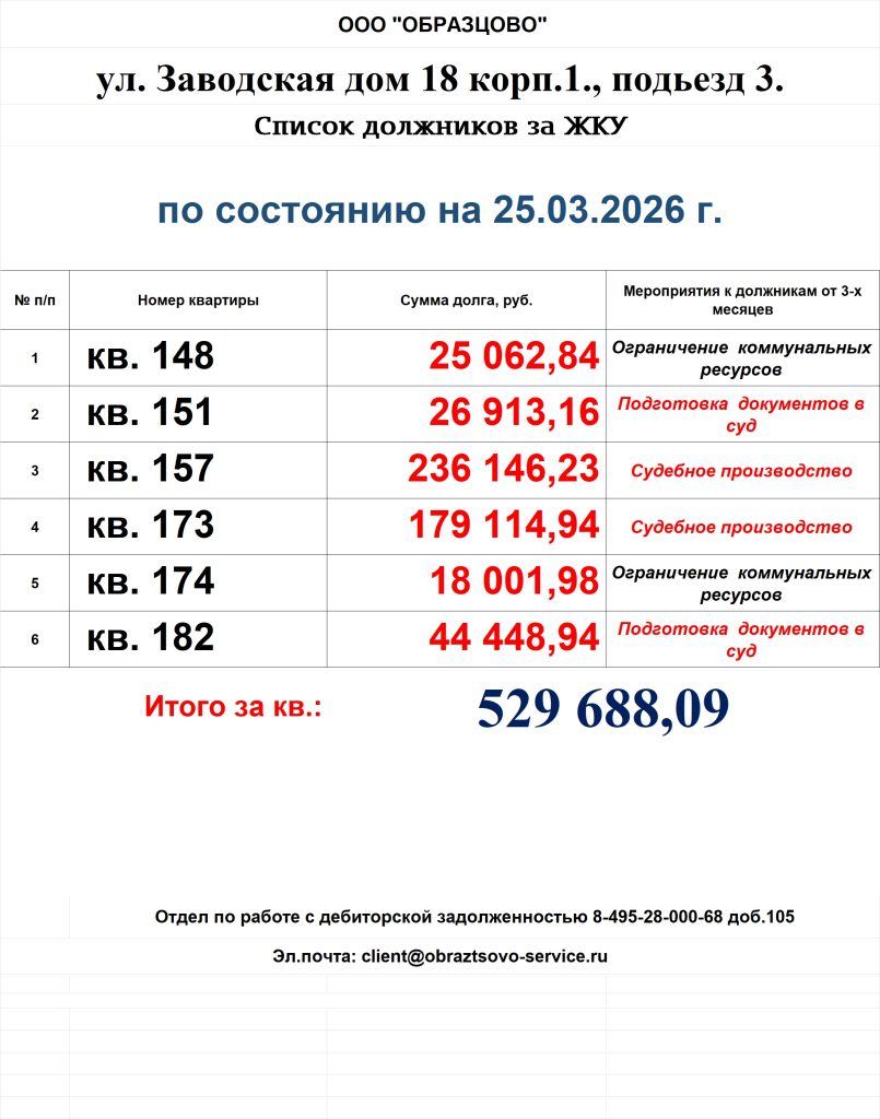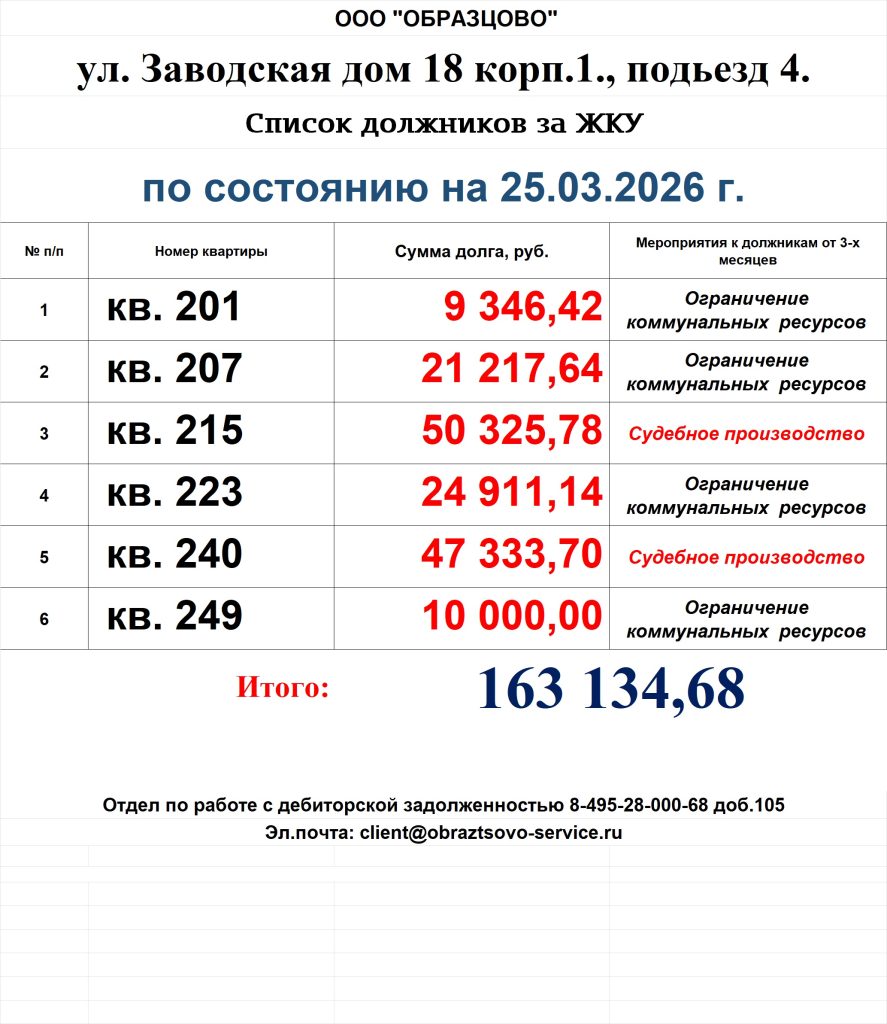 Список должников по коммунальным платежам ЖК Южный (ул. Заводская, 18к1, 18к2, 18к3)