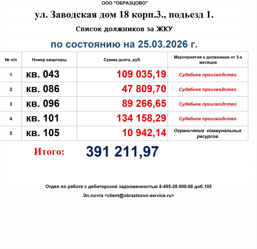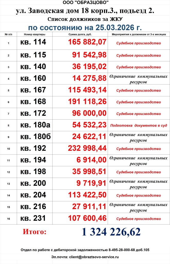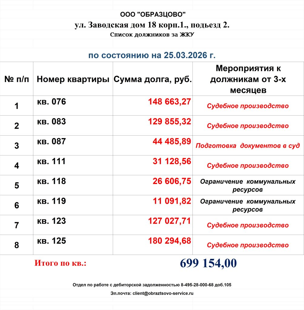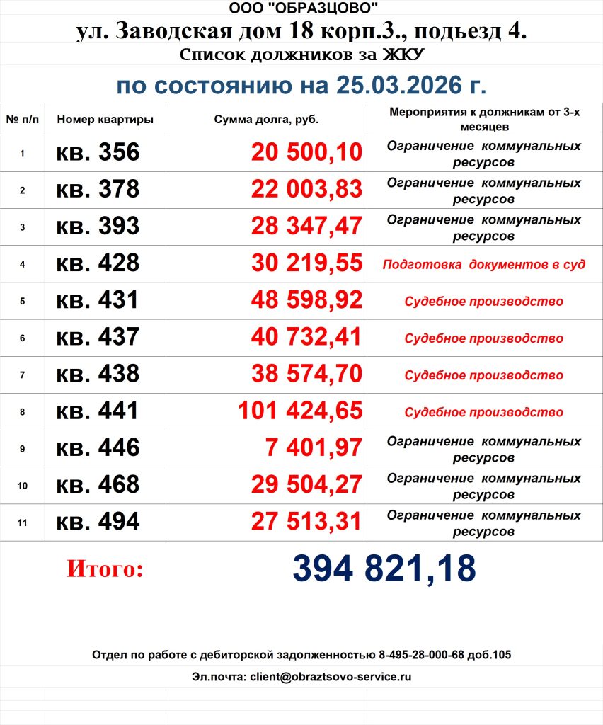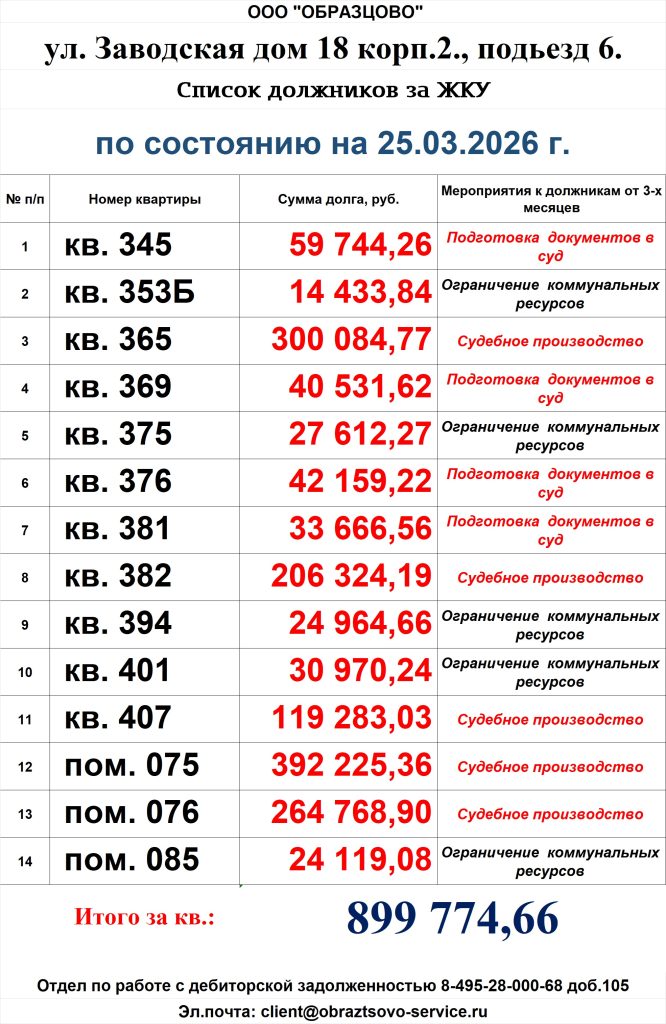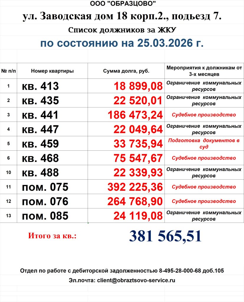 Список должников по коммунальным платежам ЖК Южный (ул. Заводская, 18к1, 18к2, 18к3)