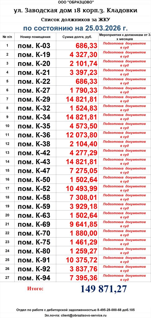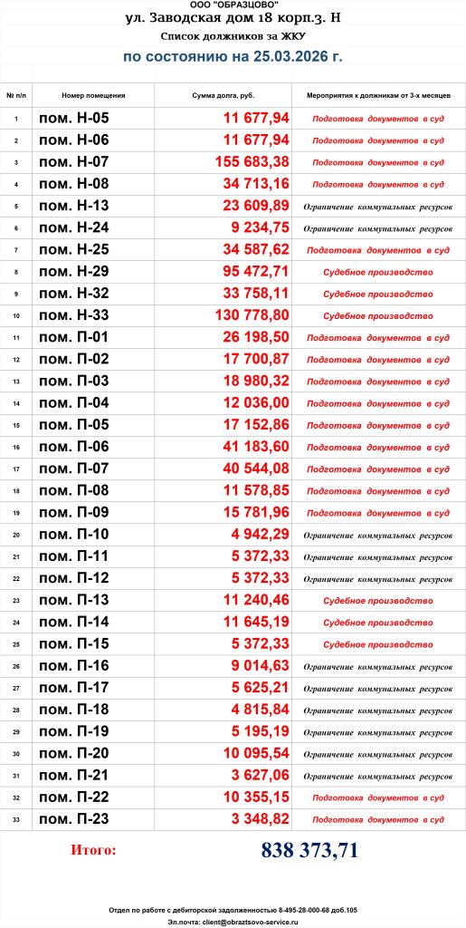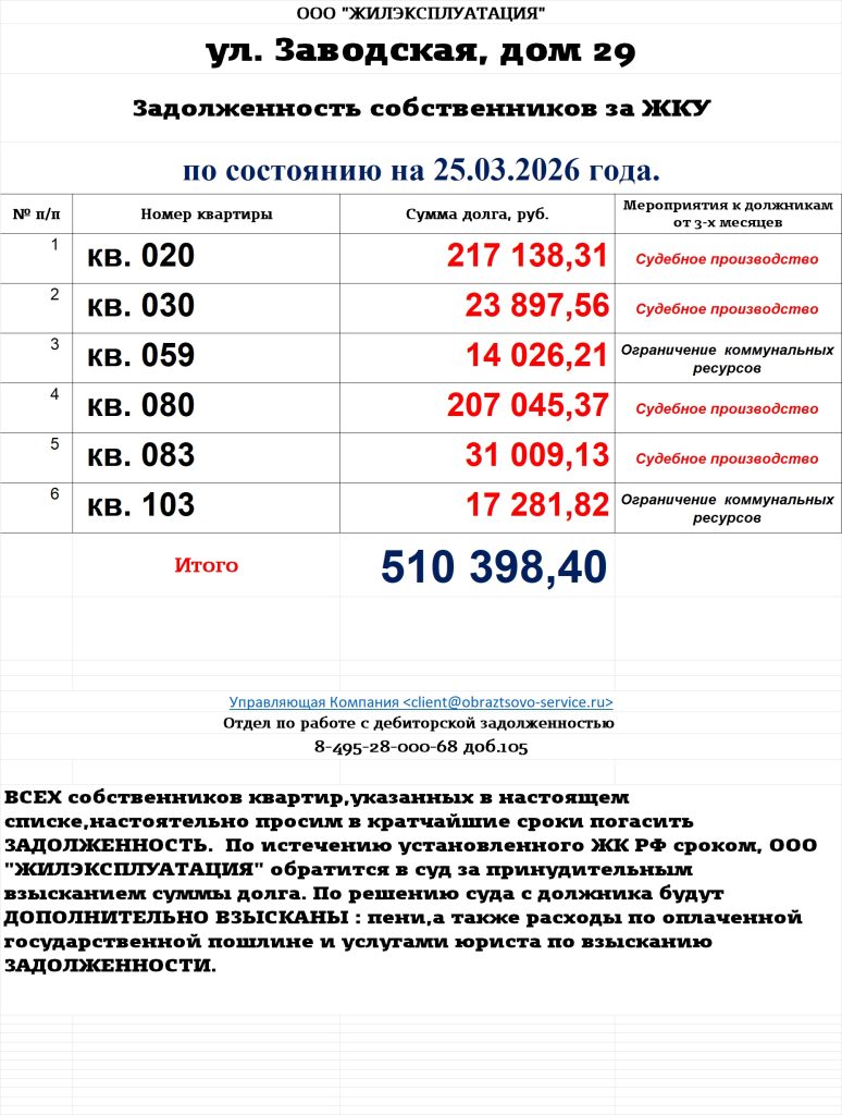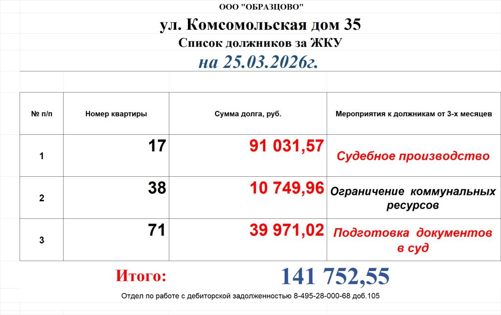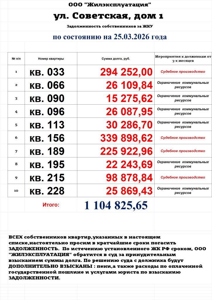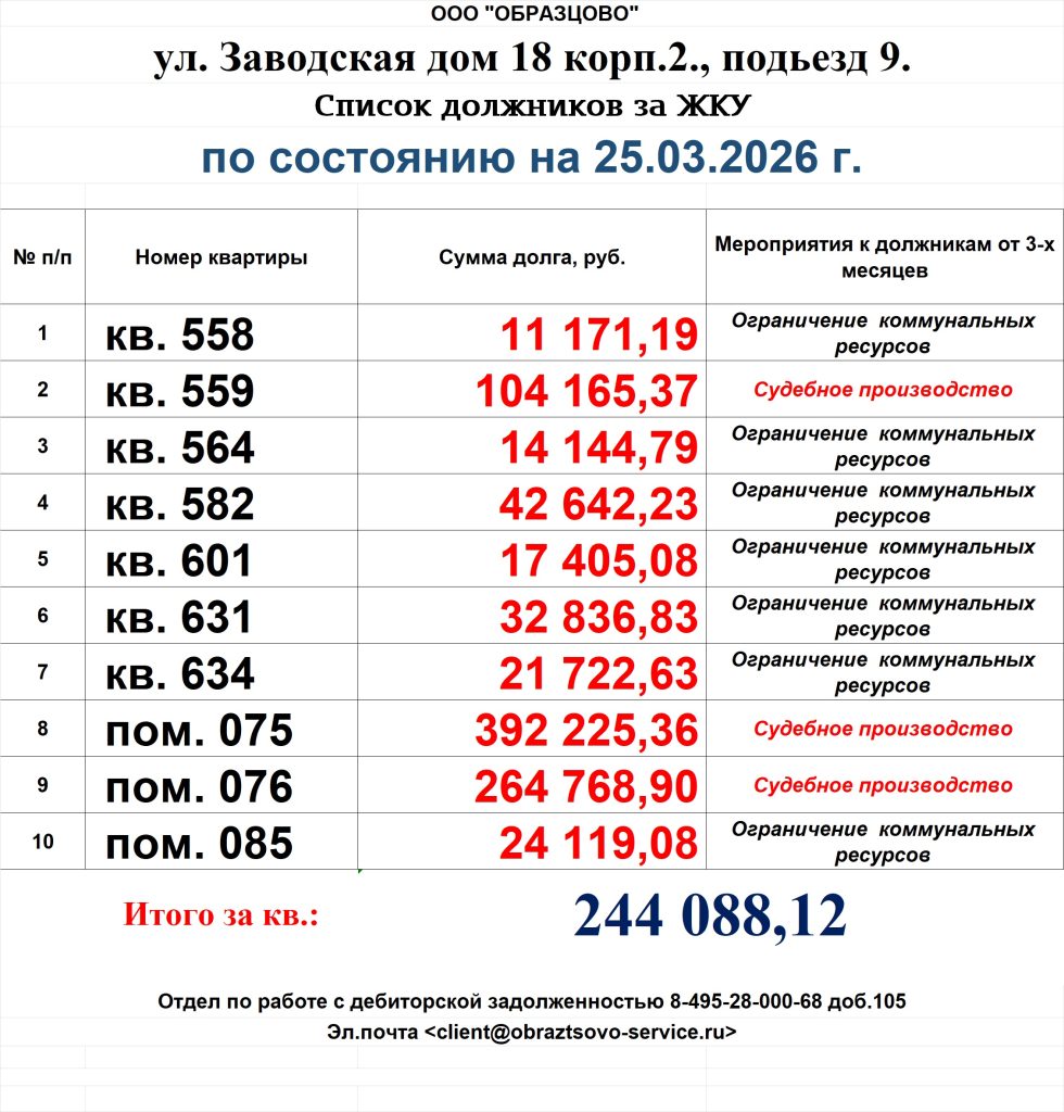 Список должников по коммунальным платежам ЖК Южный (ул. Заводская, 18к1, 18к2, 18к3)