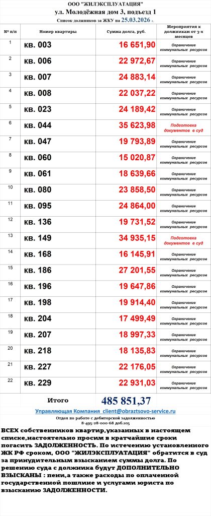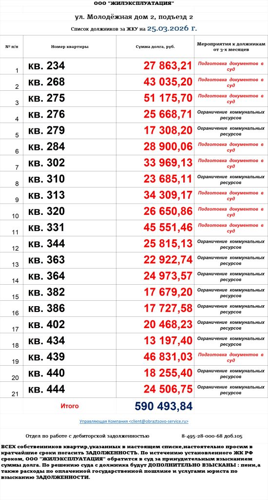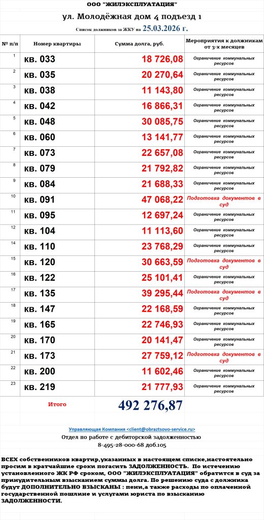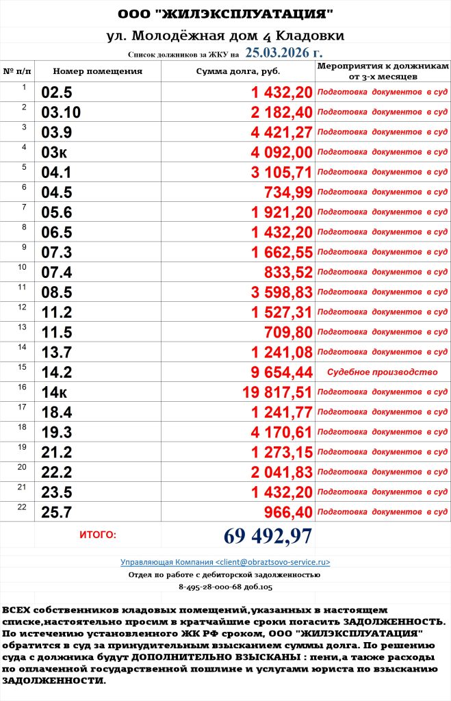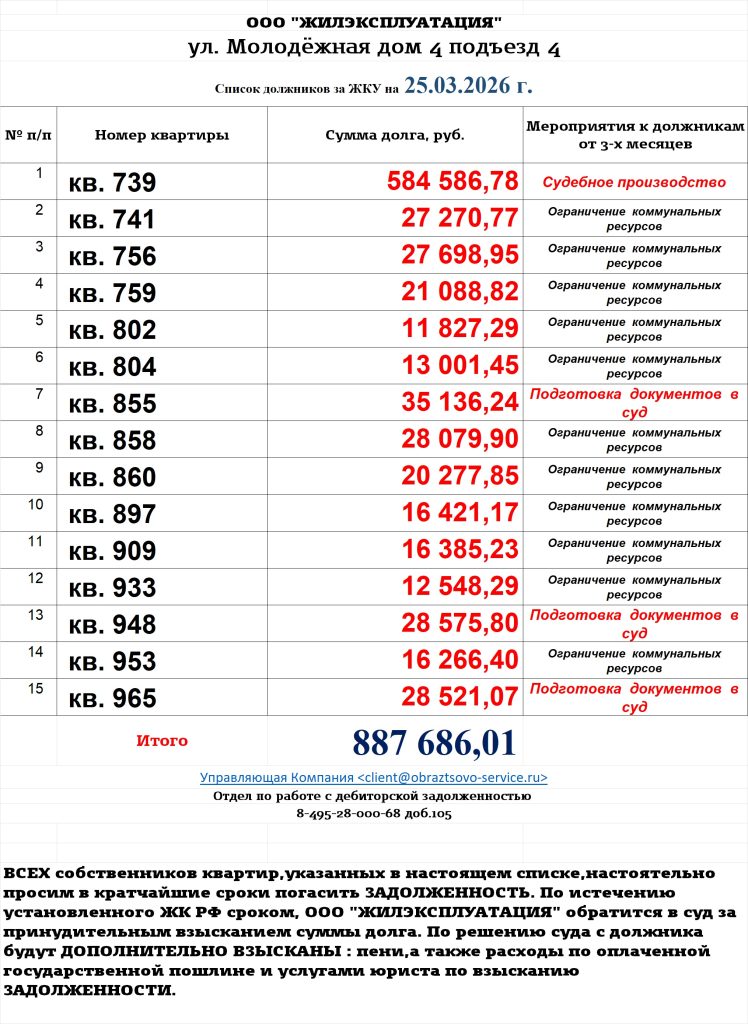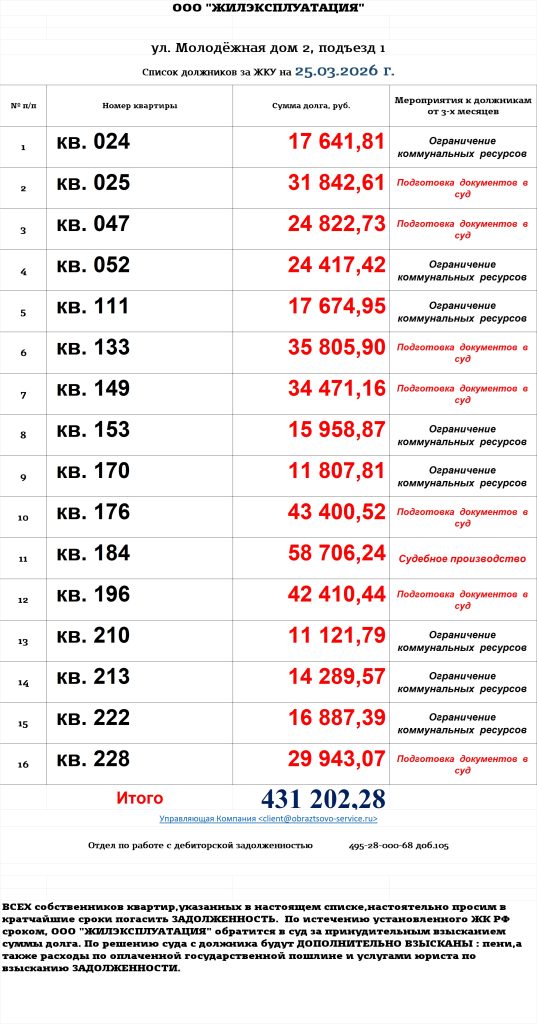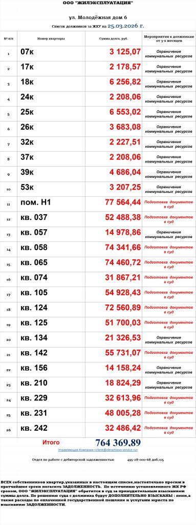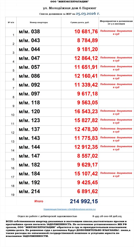 Список должников по коммунальным платежам ЖК Молодежный (ул. Почтовая,16; ул. Молодежная, 2, 3, 4, 5, 6)