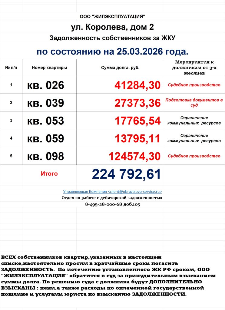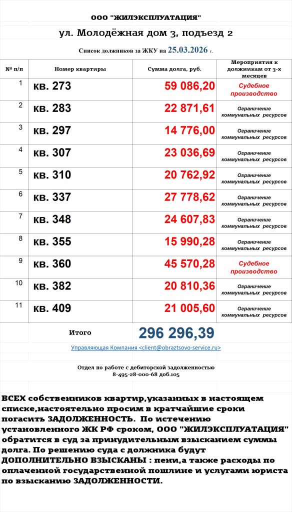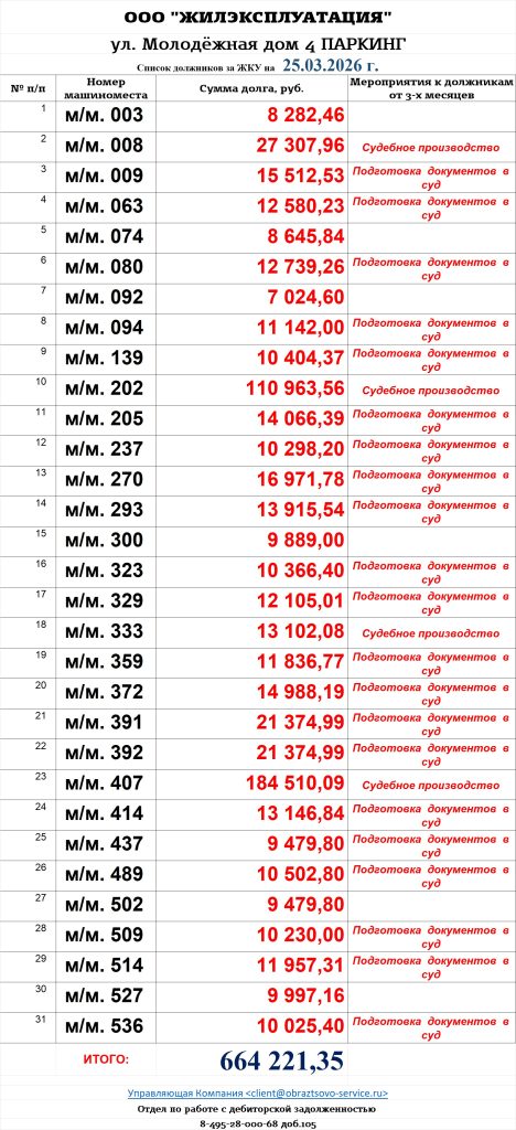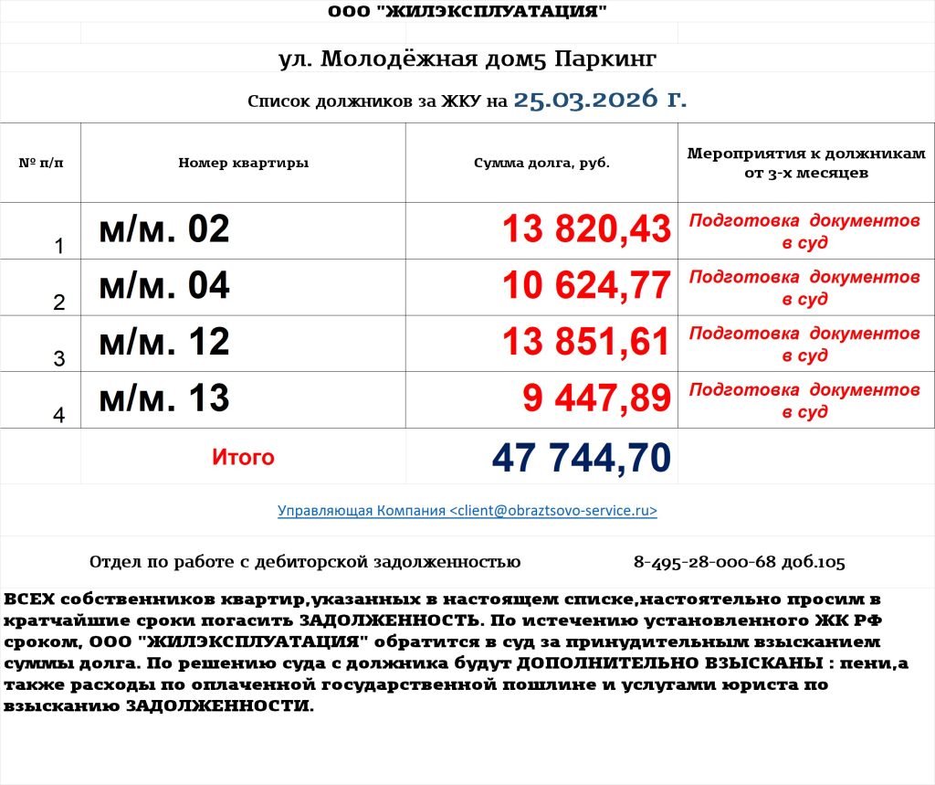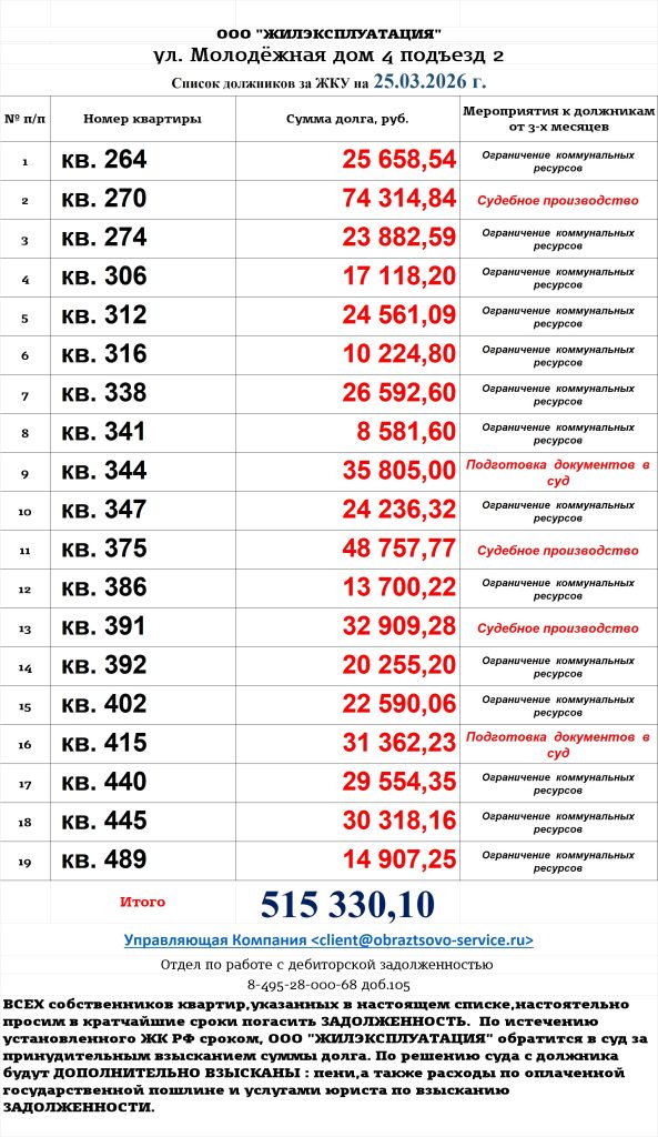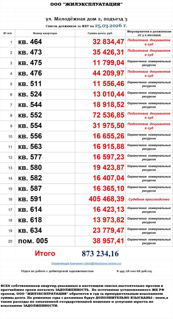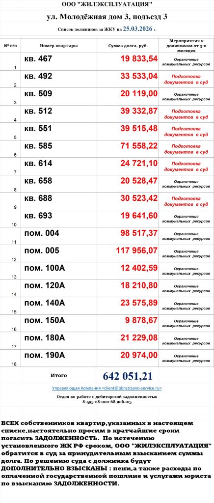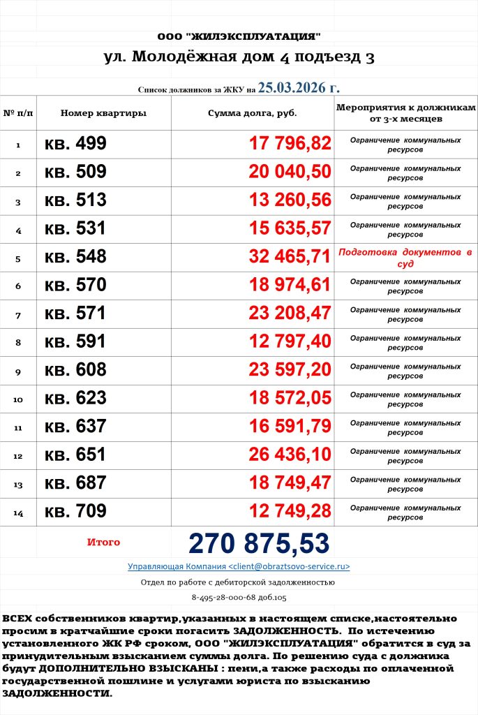 Список должников по коммунальным платежам ЖК Молодежный (ул. Почтовая,16; ул. Молодежная, 2, 3, 4, 5, 6)