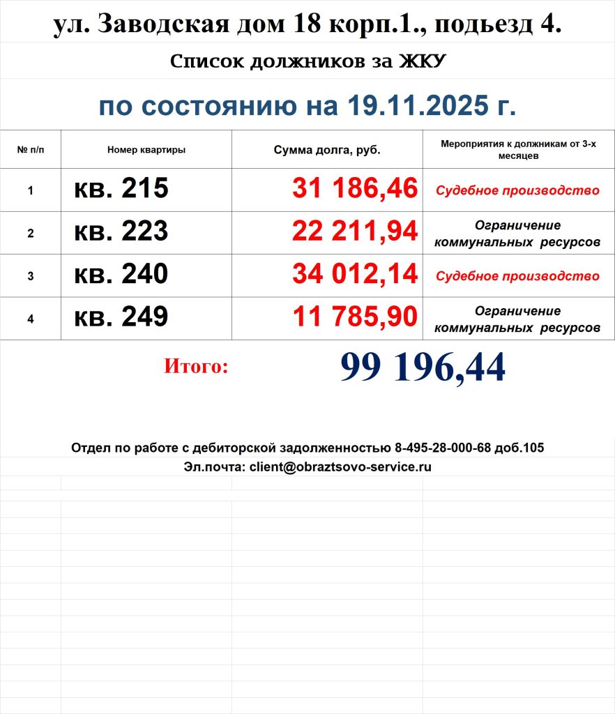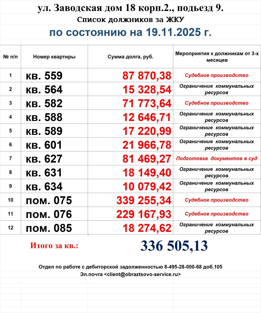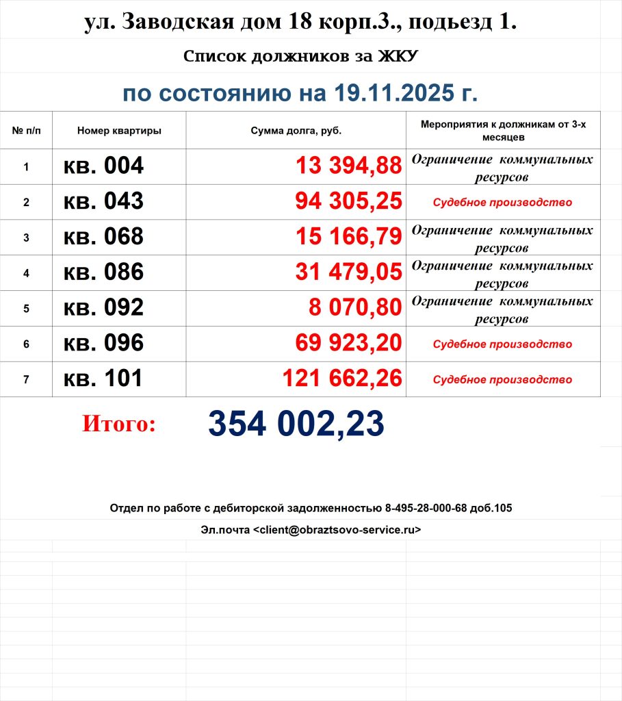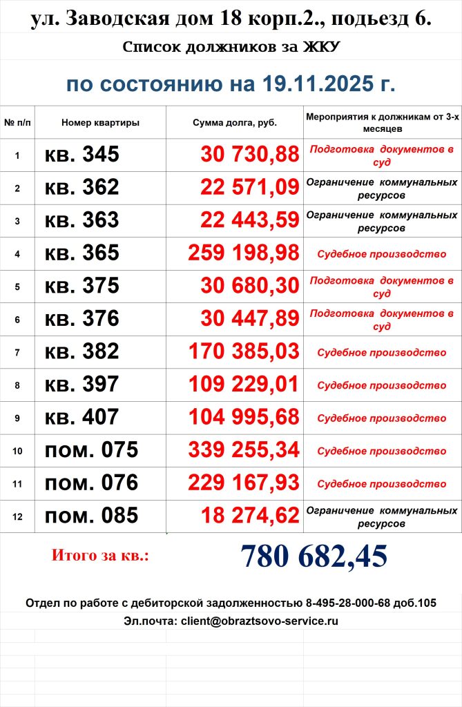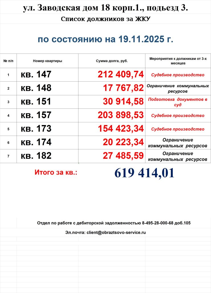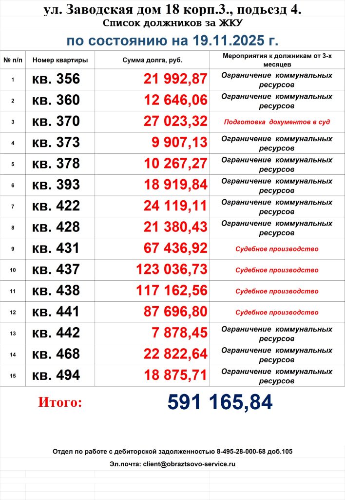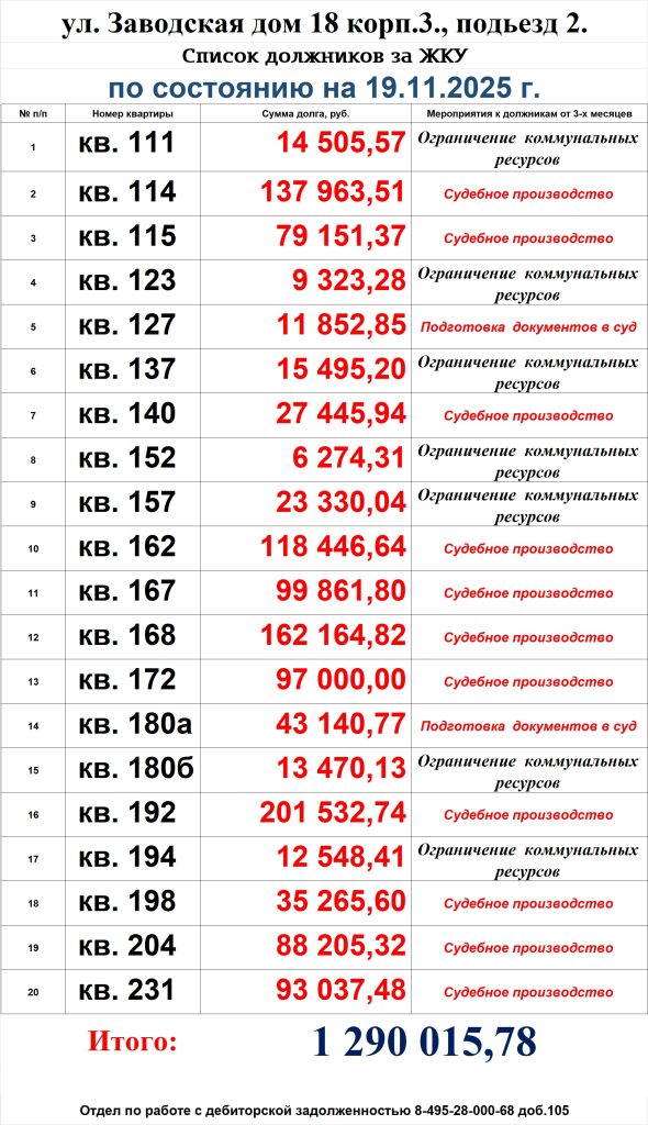 Список должников по коммунальным платежам ЖК Южный (ул. Заводская, 18к1, 18к2, 18к3)