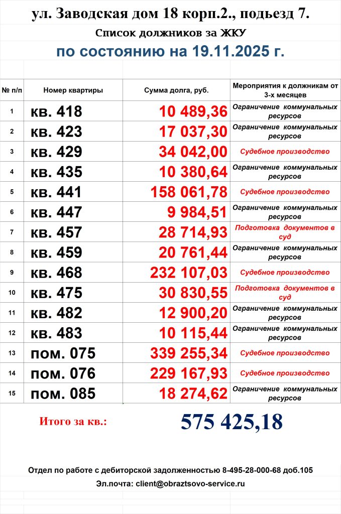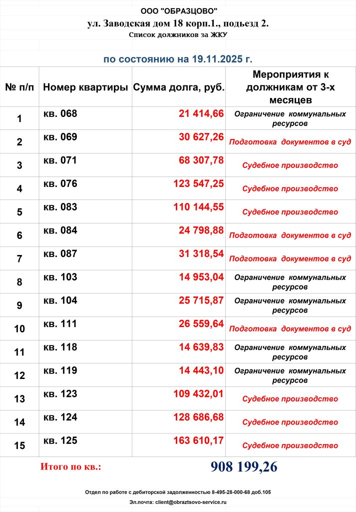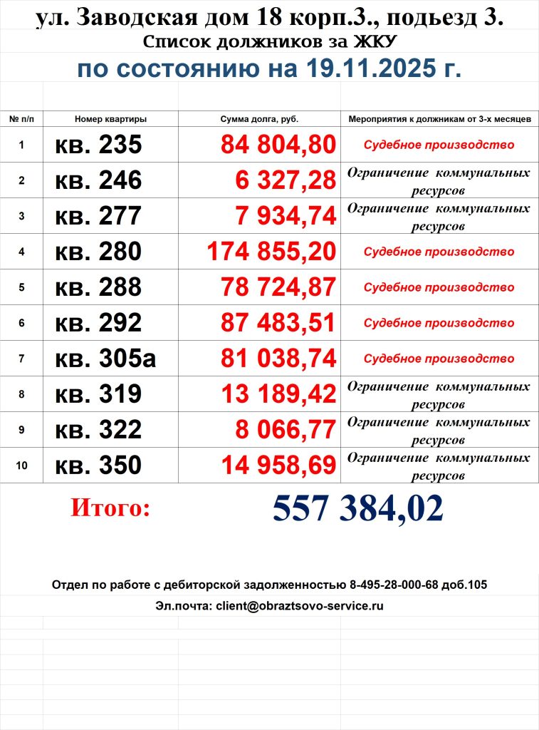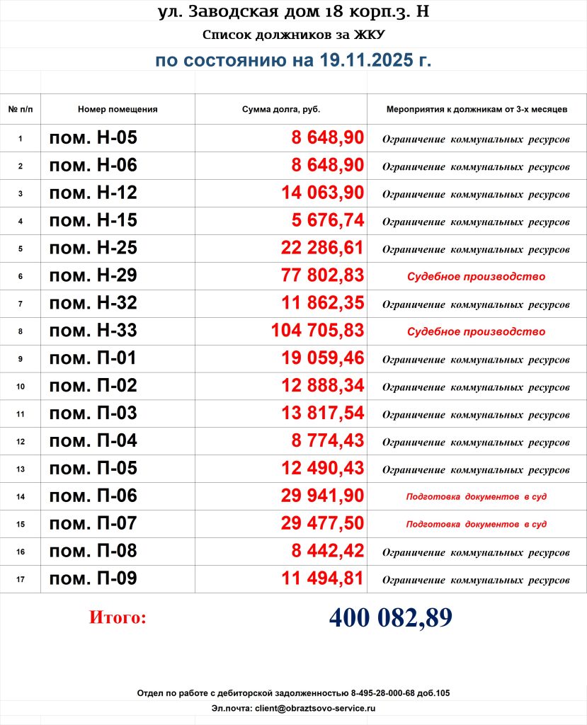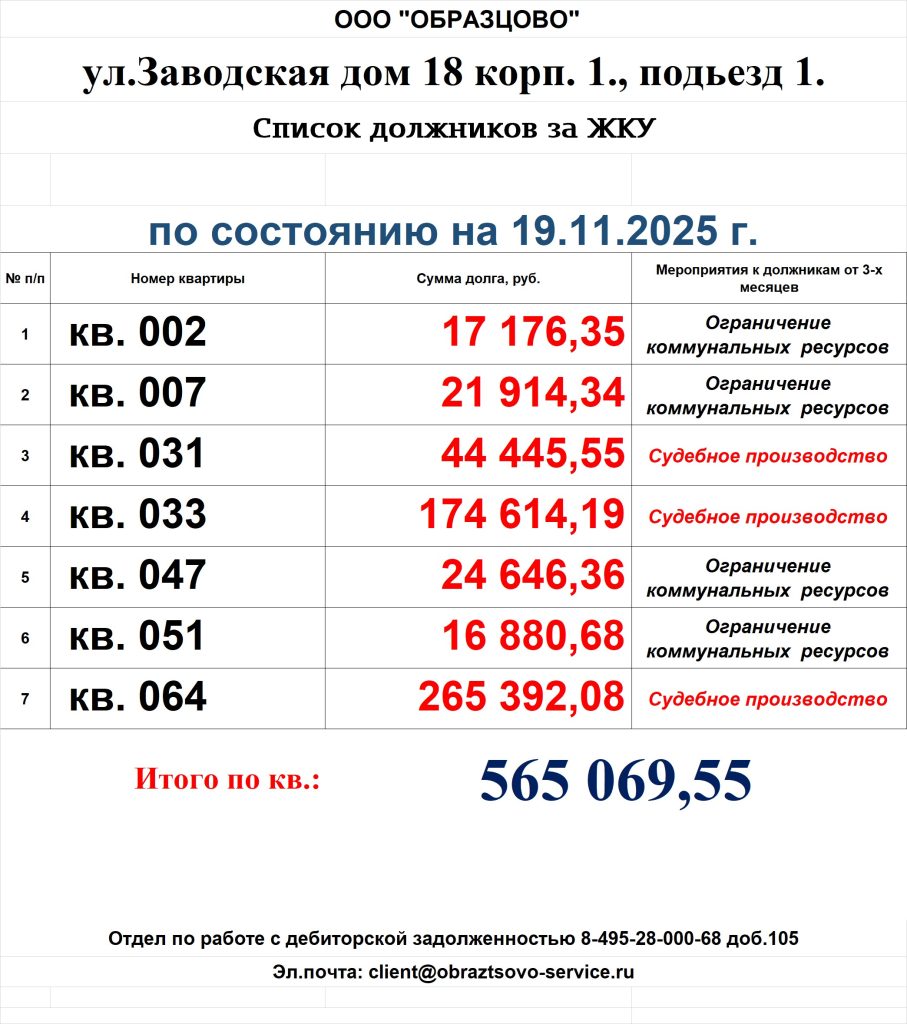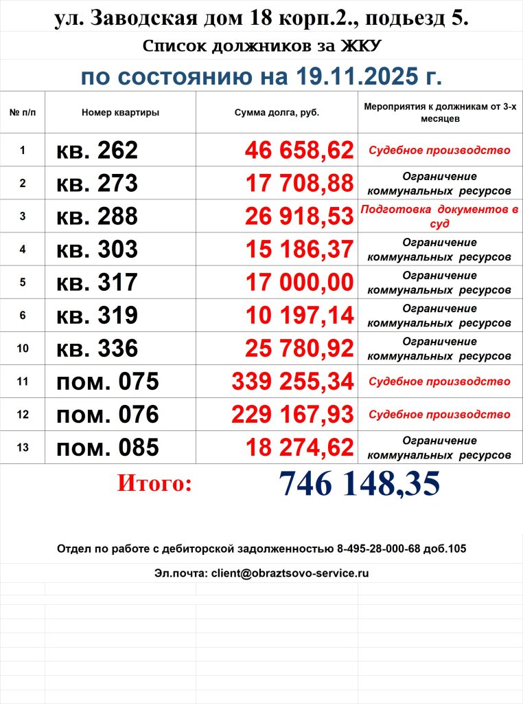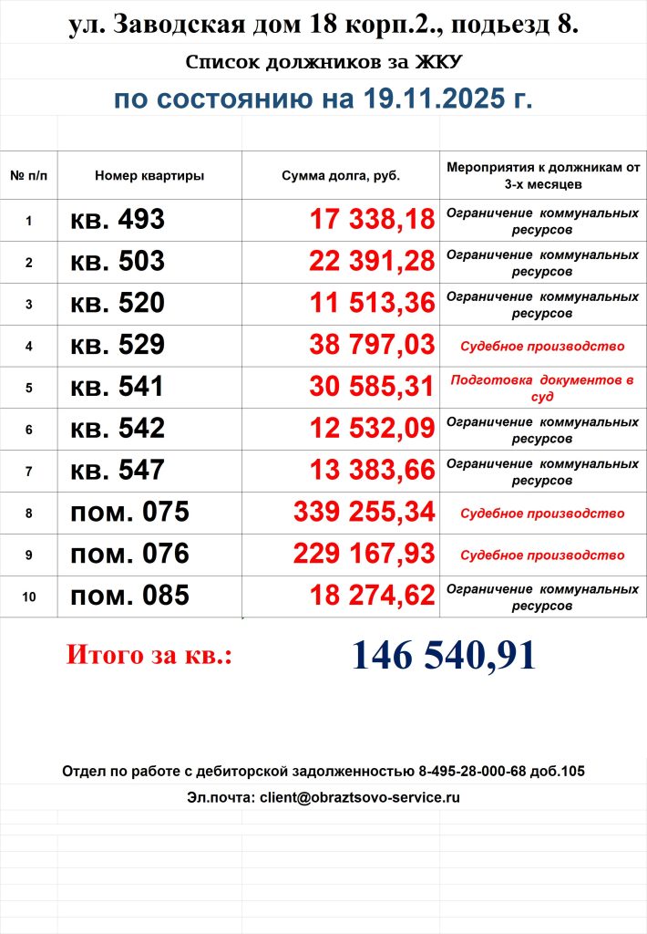 Список должников по коммунальным платежам ЖК Южный (ул. Заводская, 18к1, 18к2, 18к3)