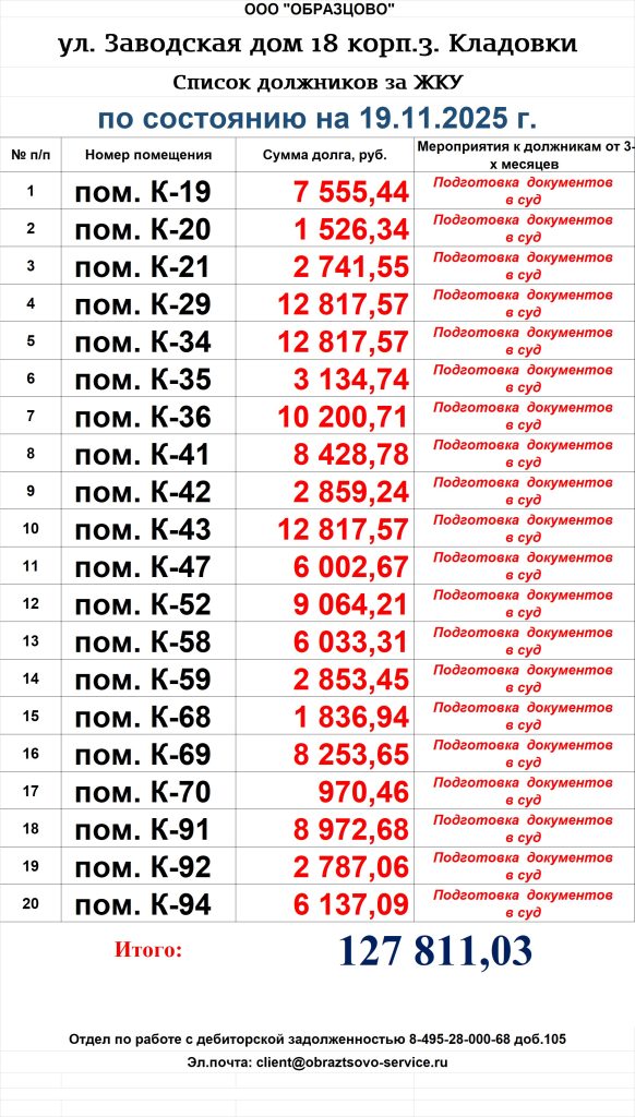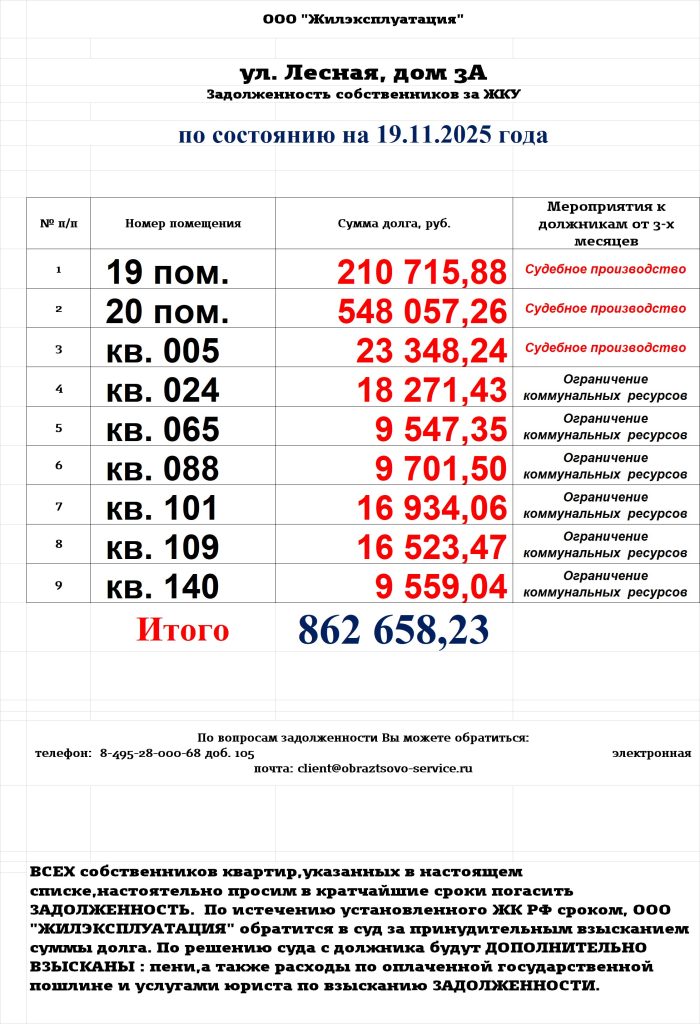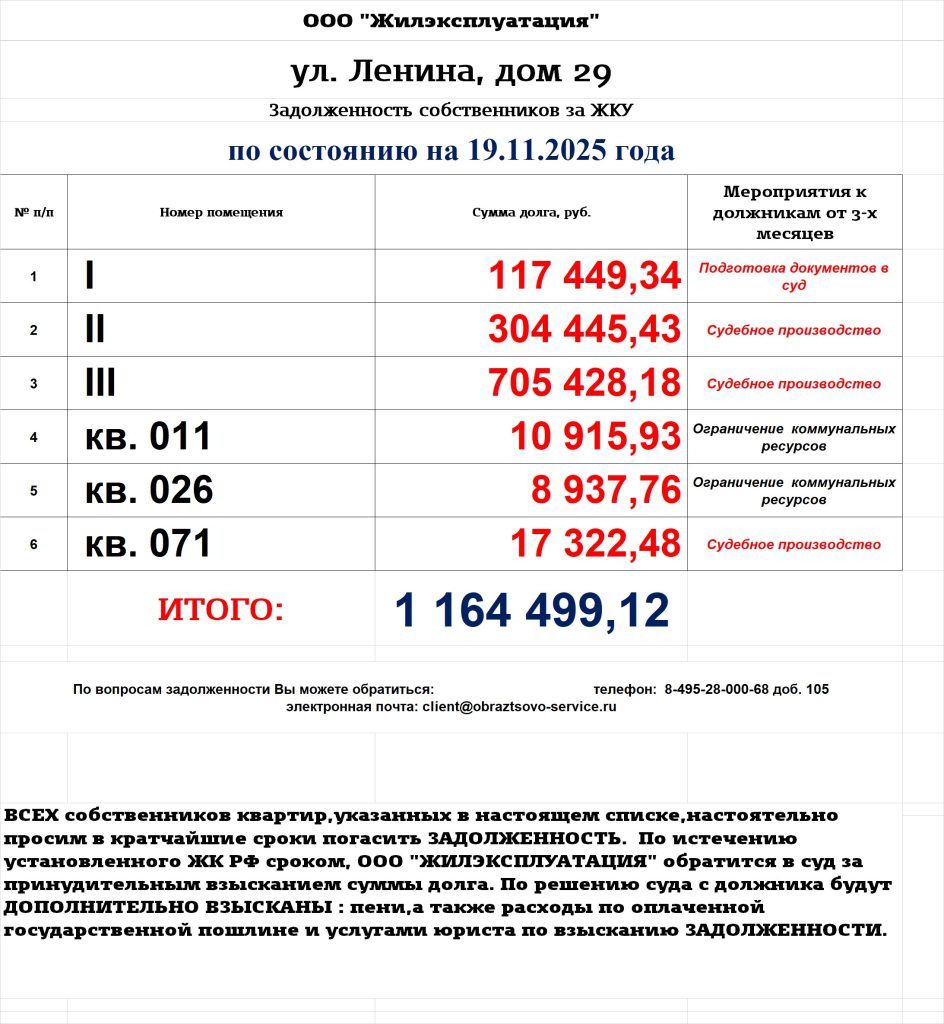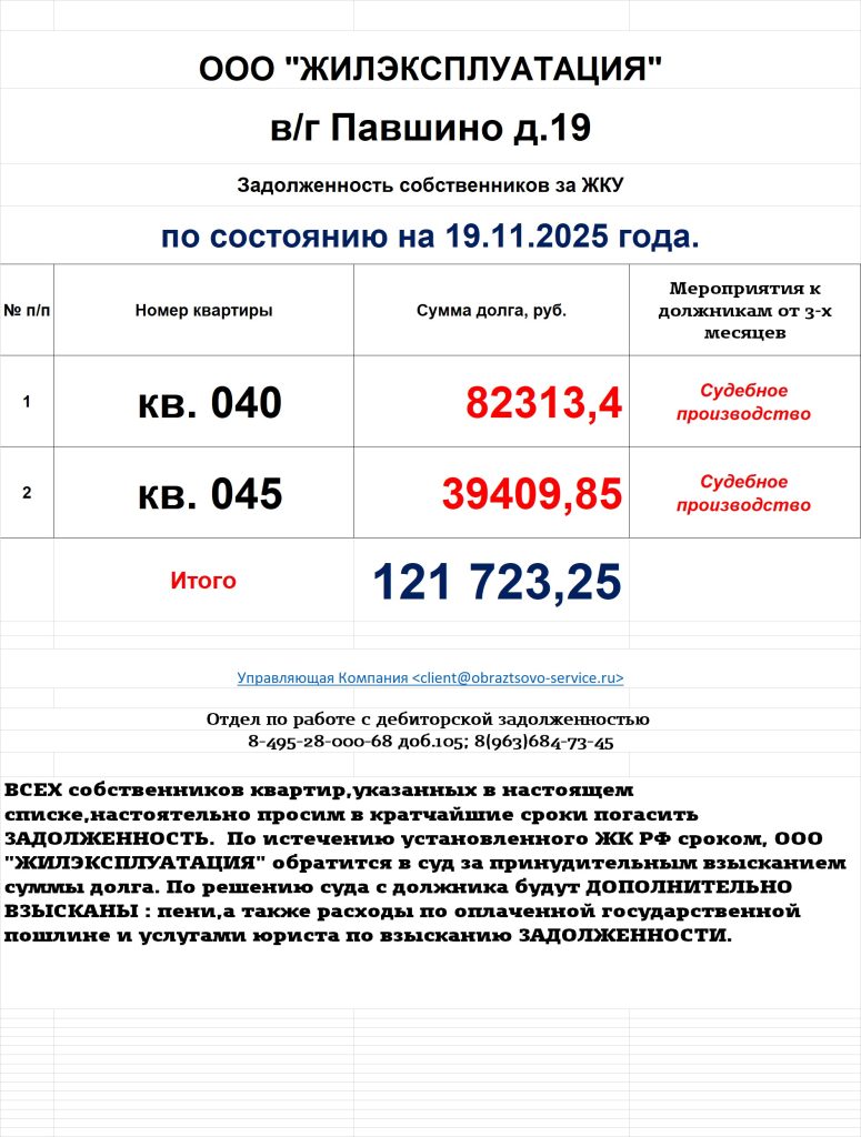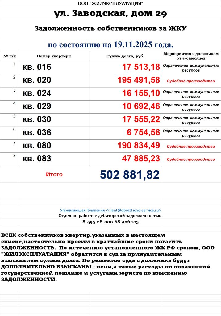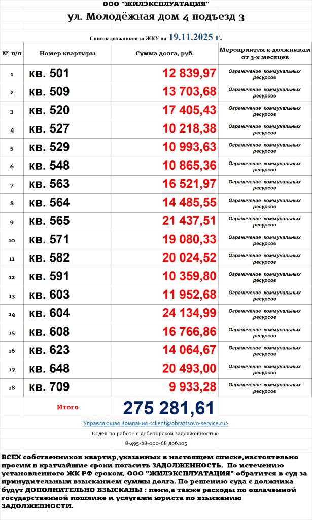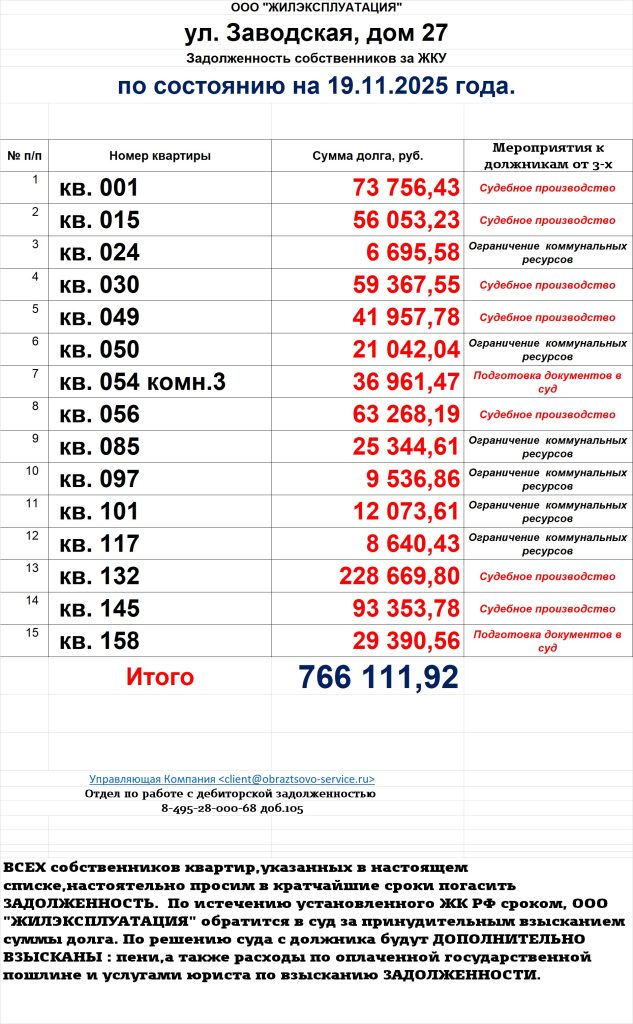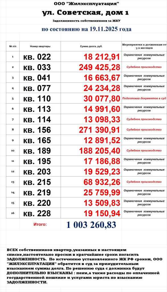 Список должников по коммунальным платежам ЖК Южный (ул. Заводская, 18к1, 18к2, 18к3)