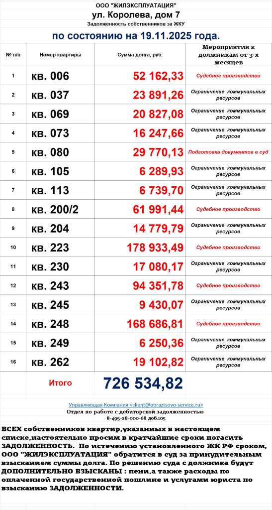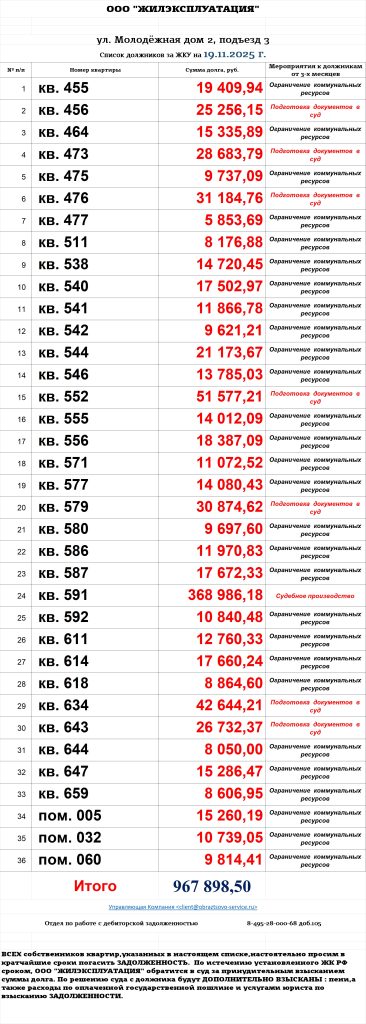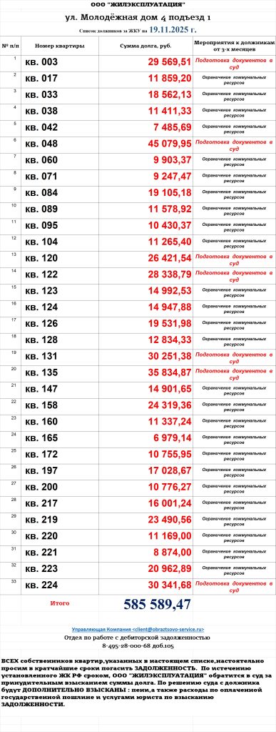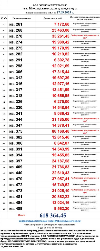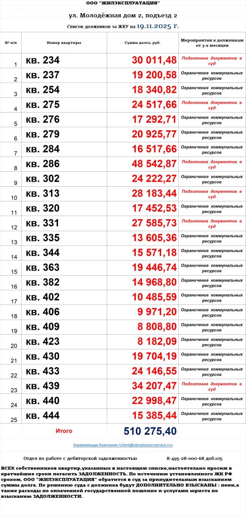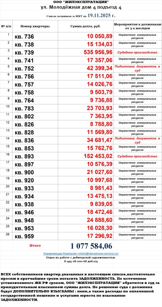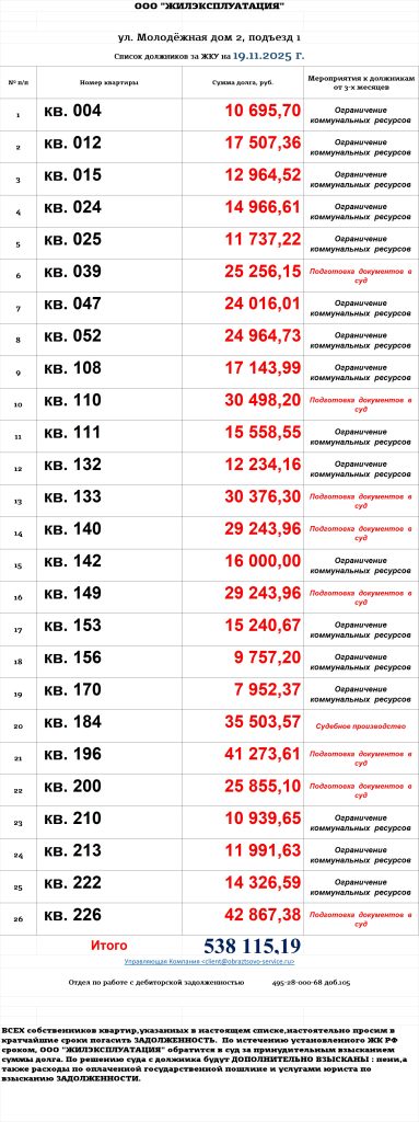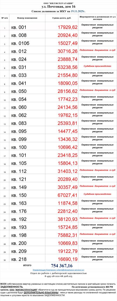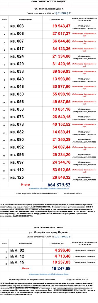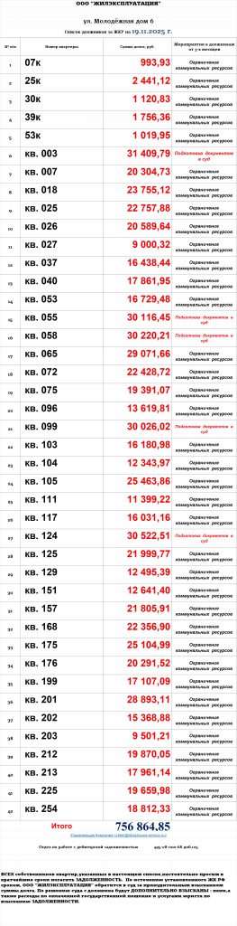 Список должников по коммунальным платежам ЖК Молодежный (ул. Почтовая,16; ул. Молодежная, 2, 3, 4, 5, 6)