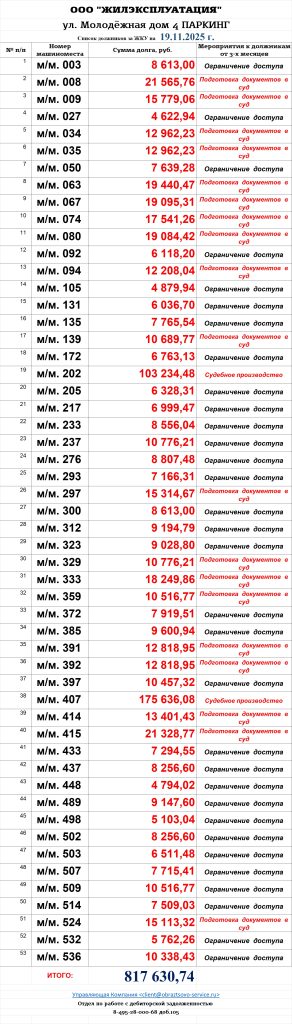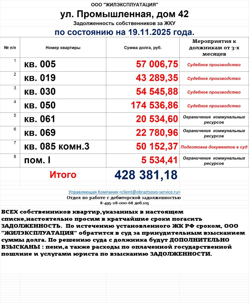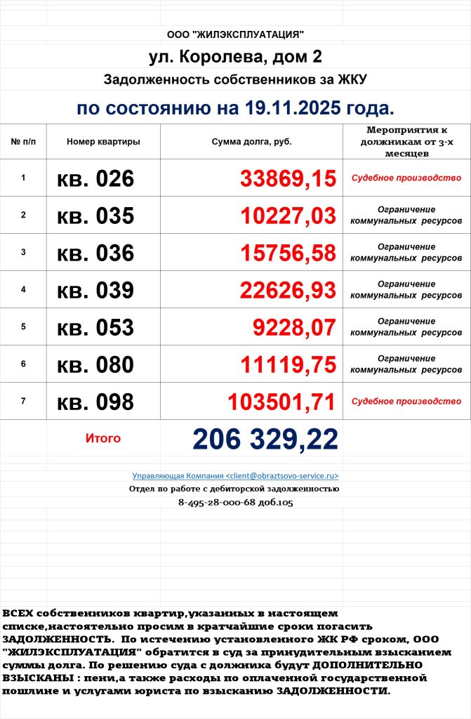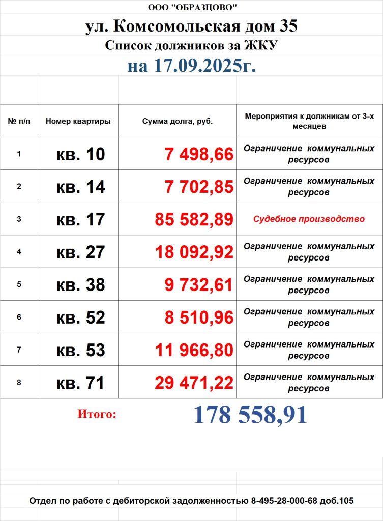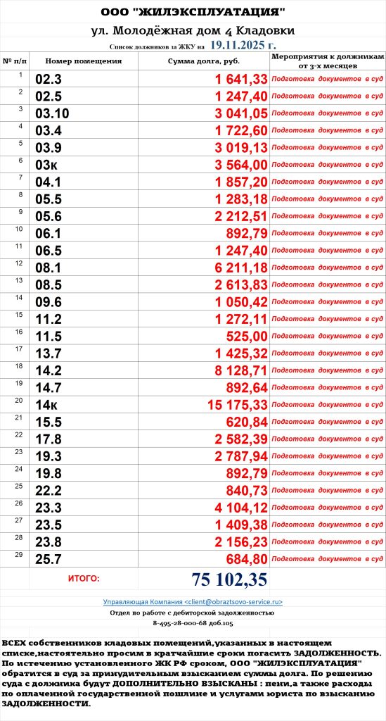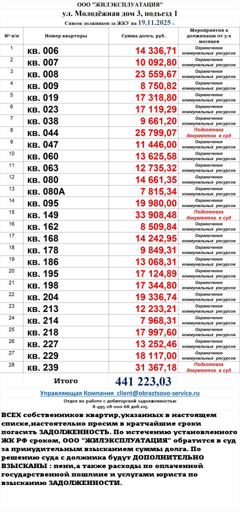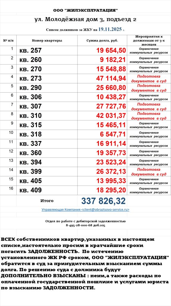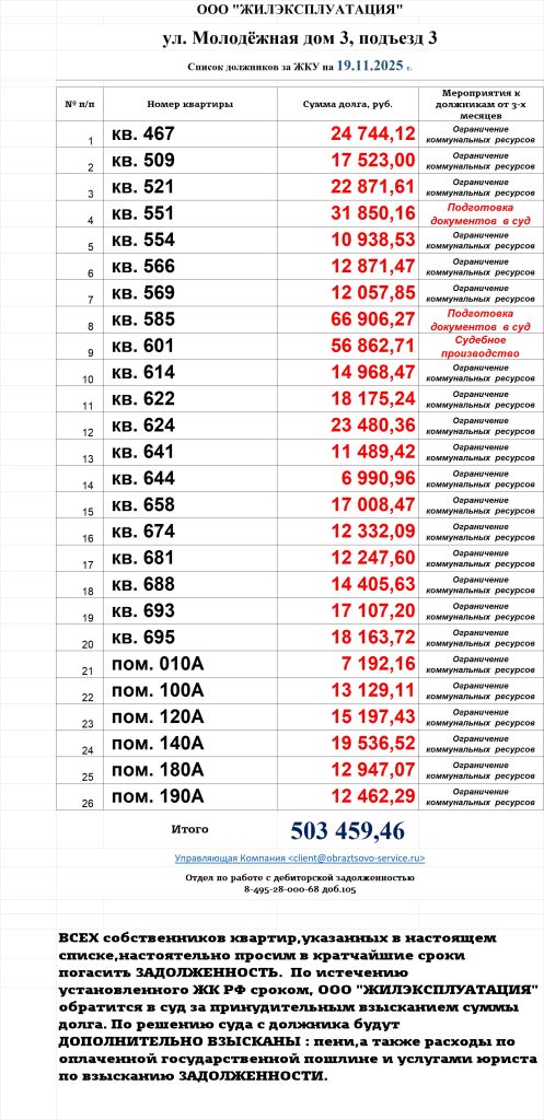 Список должников по коммунальным платежам ЖК Молодежный (ул. Почтовая,16; ул. Молодежная, 2, 3, 4, 5, 6)