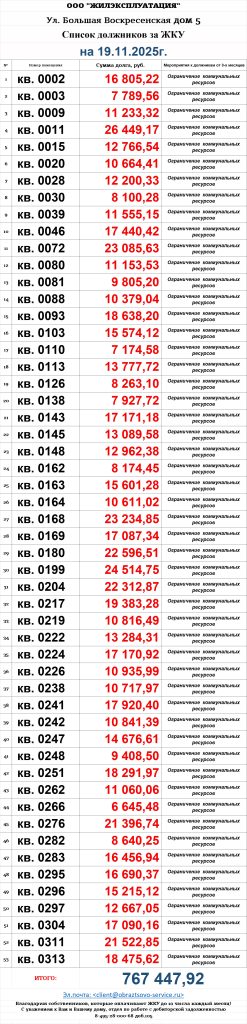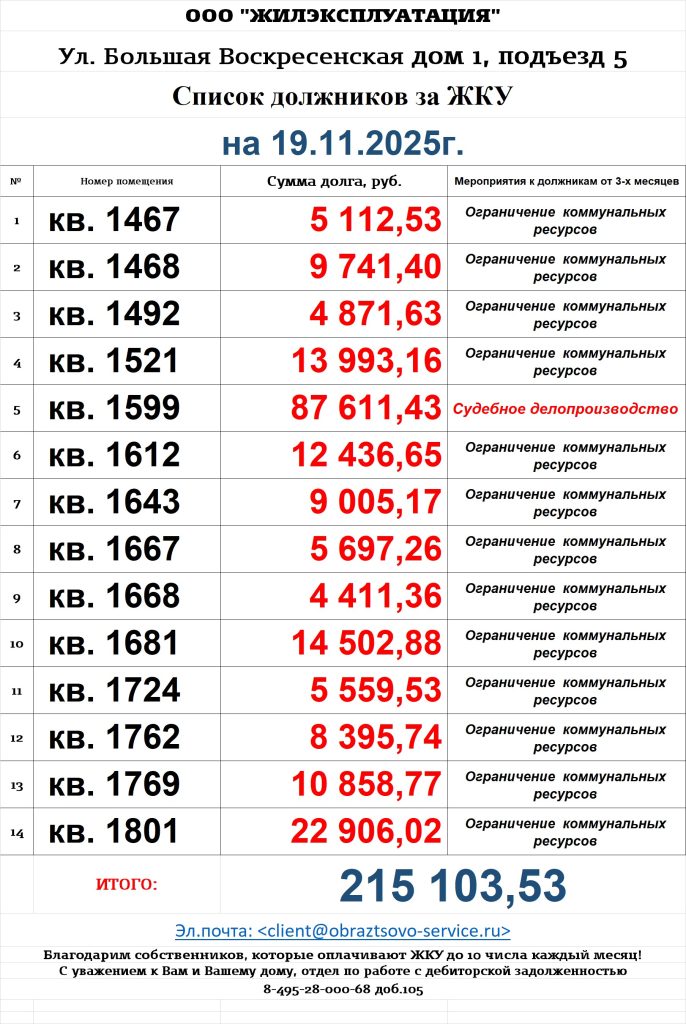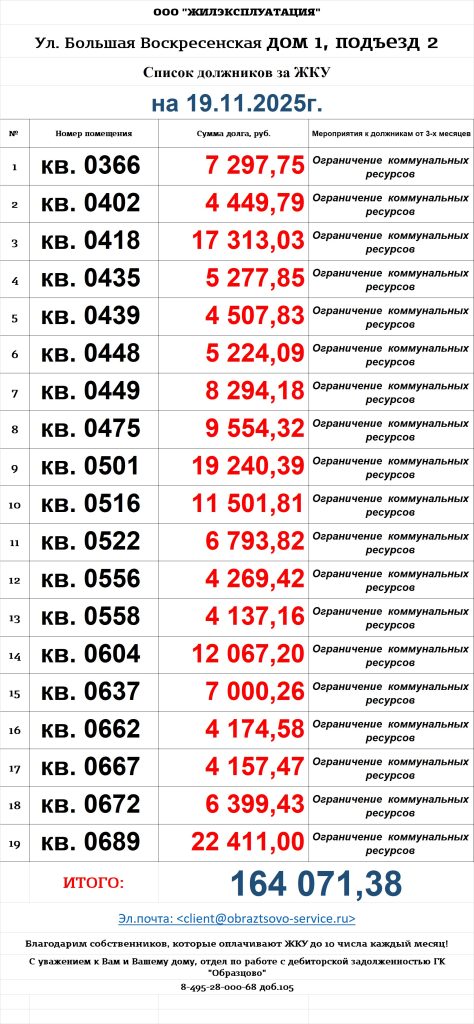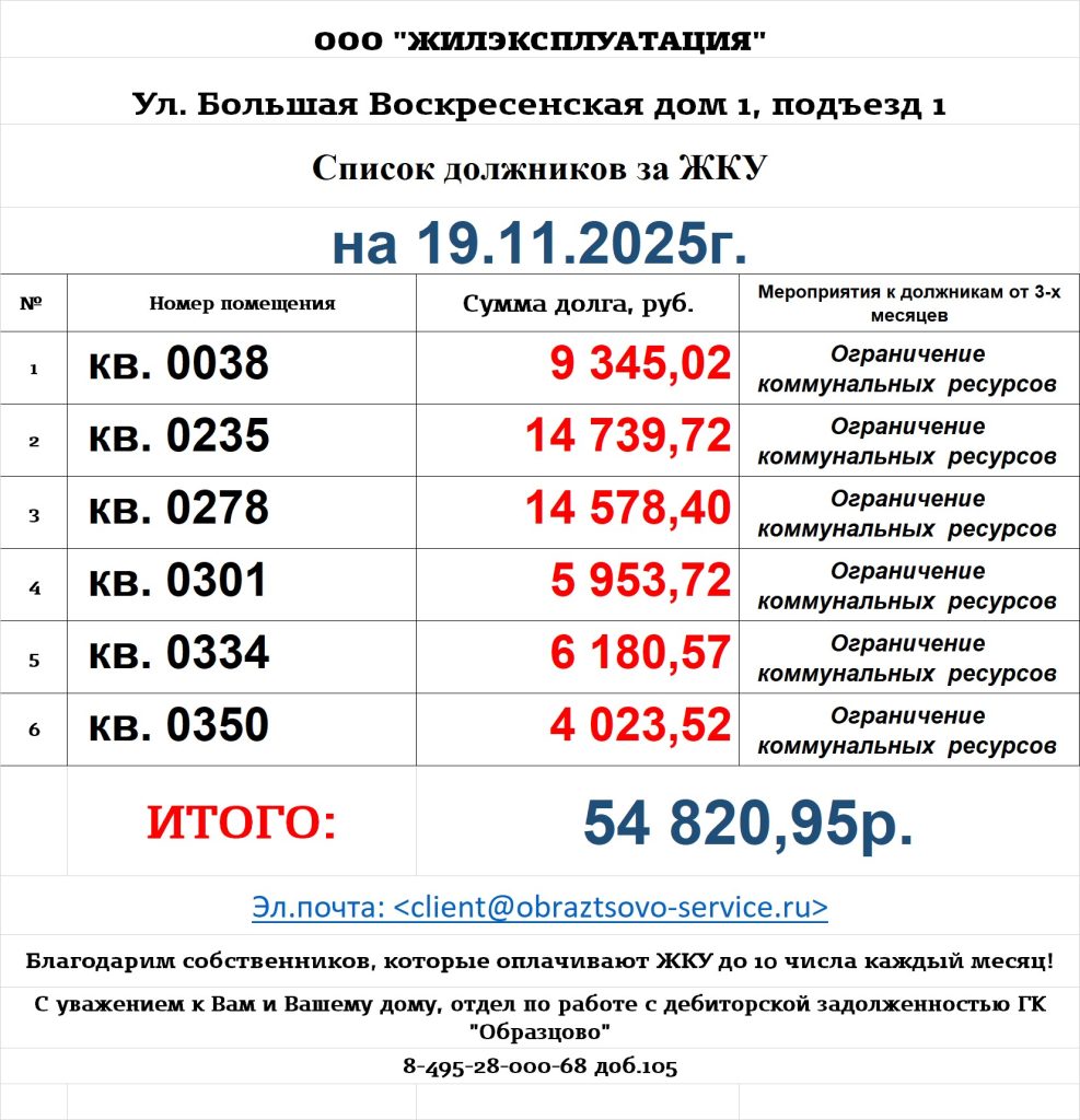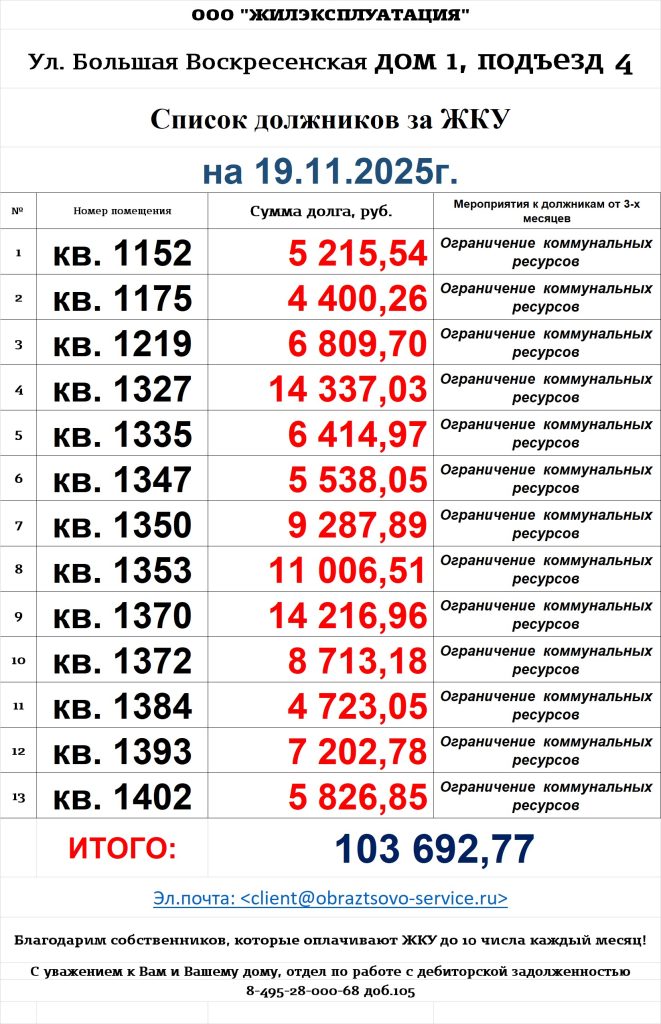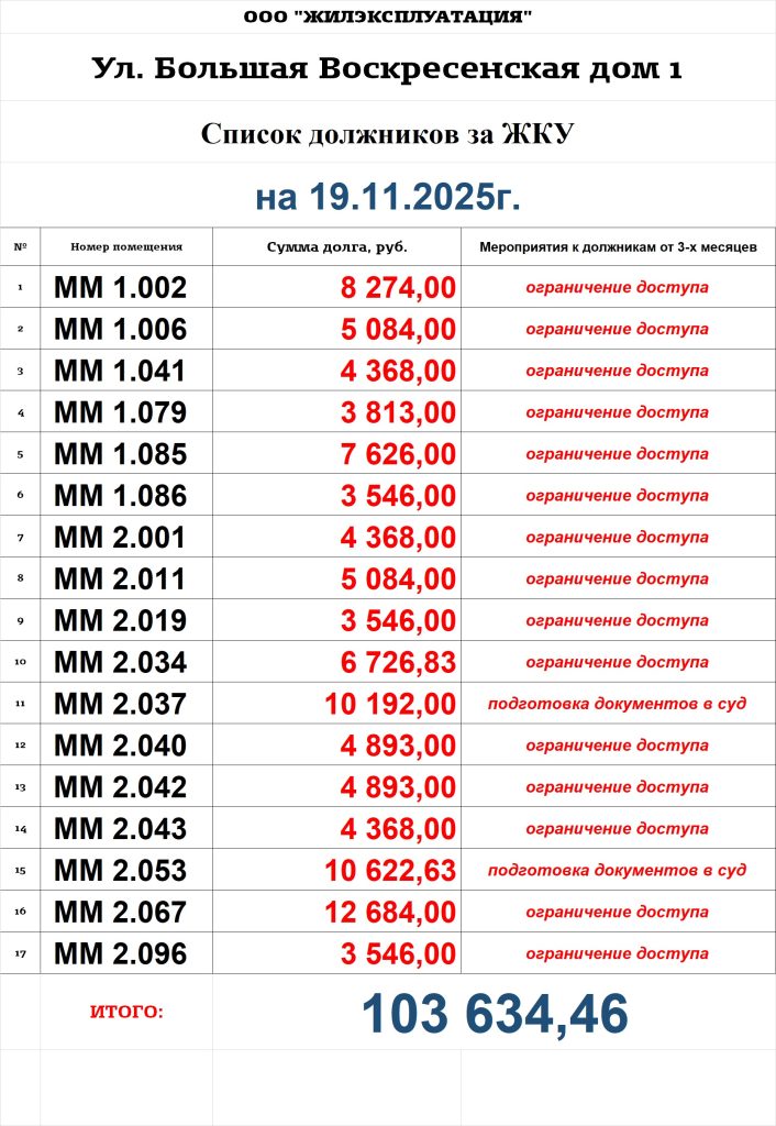 Список должников по коммунальным платежам ЖК Тетрис (ул. Большая Воскресенская, 1)
