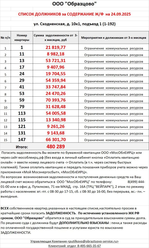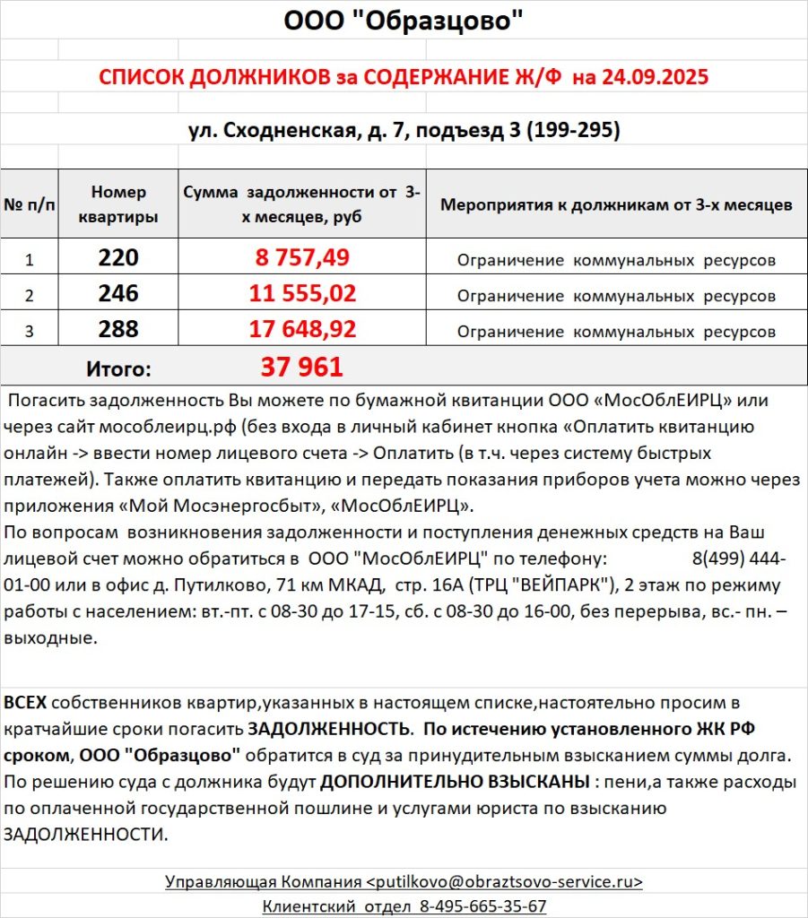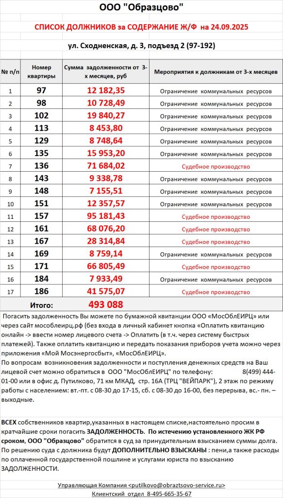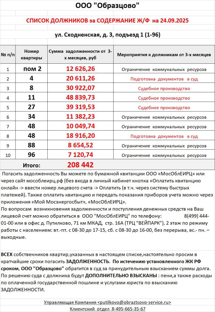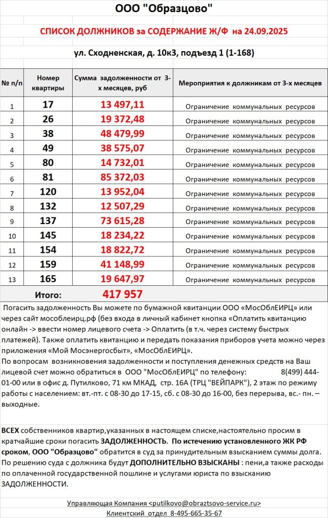 Список должников по коммунальным платежам ул. Сходненская, 10к1, 10к2, 10к3