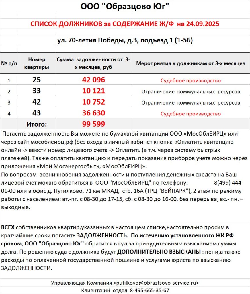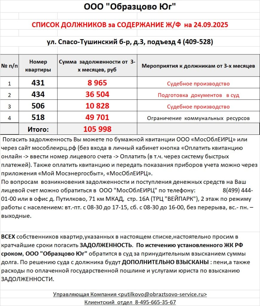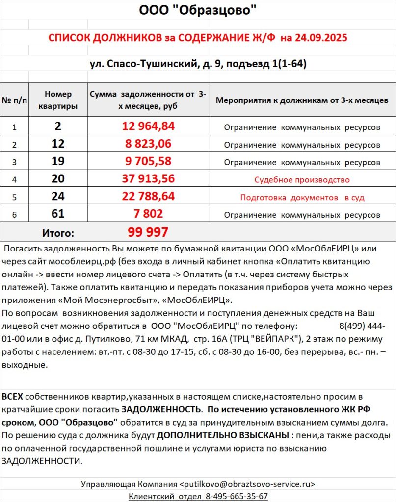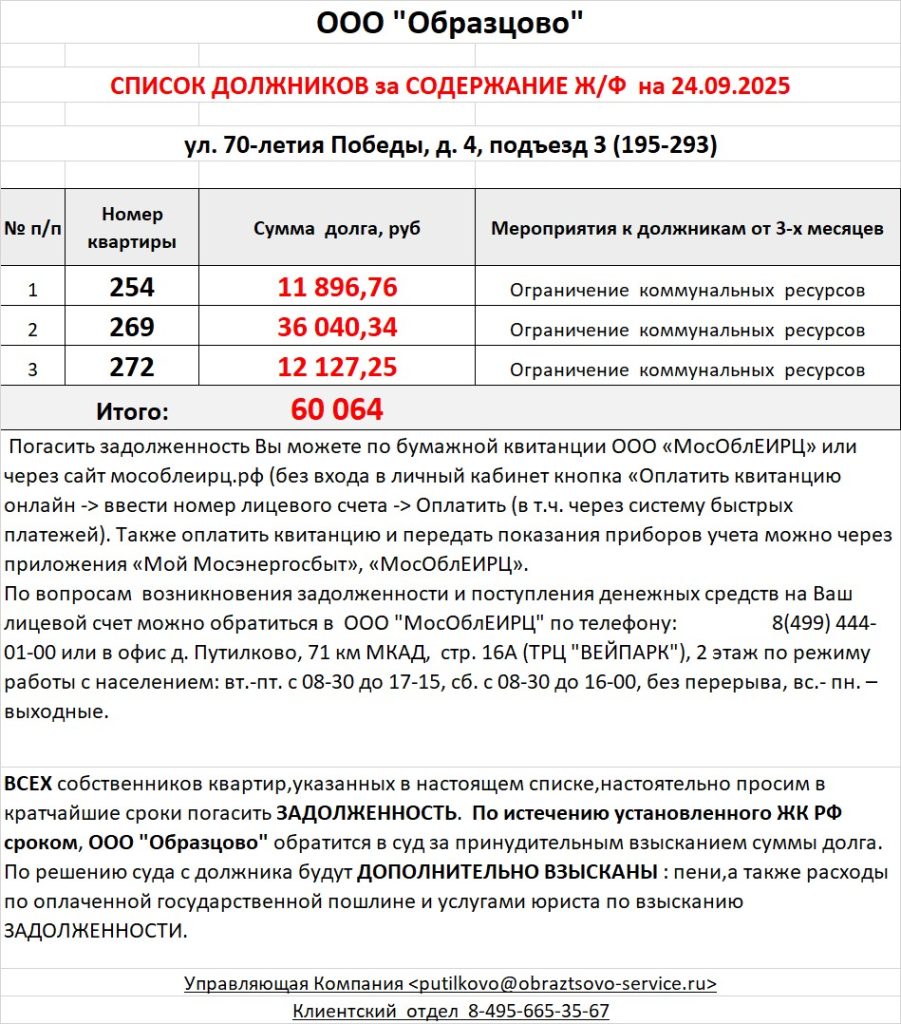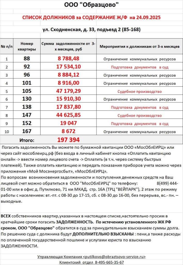 Список должников по коммунальным платежам ул. Сходненская, 10к1, 10к2, 10к3