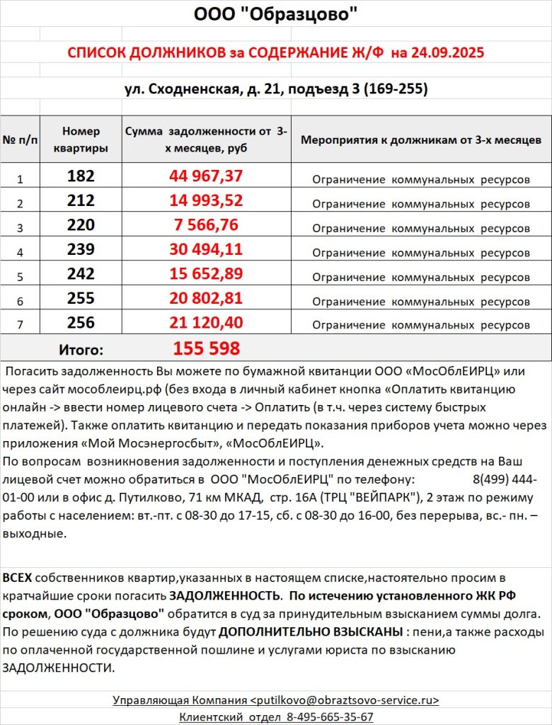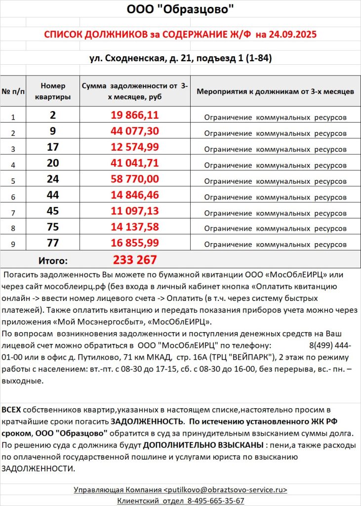 Список должников по коммунальным платежам ул. Сходненская, 21