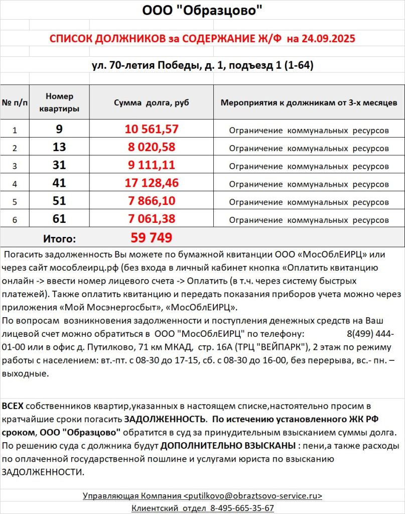 Список должников по коммунальным платежам ул. 70-летия Победы, 1