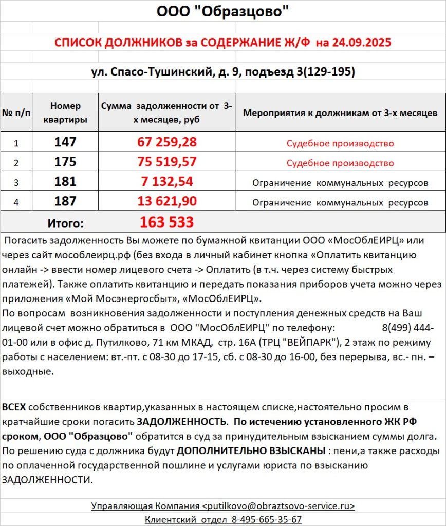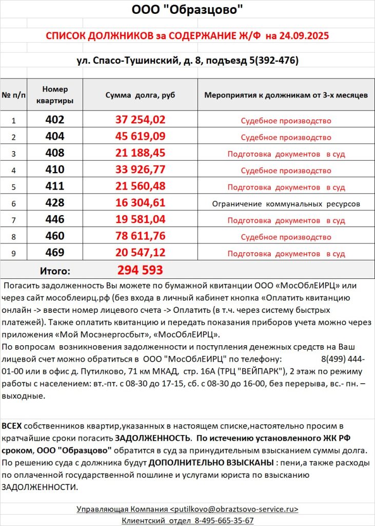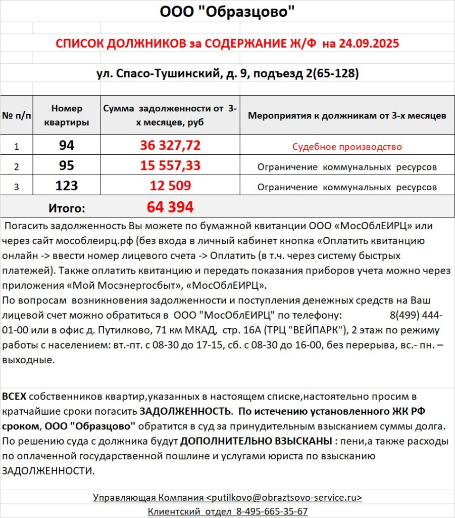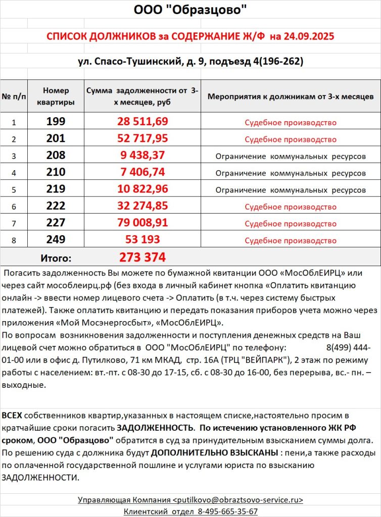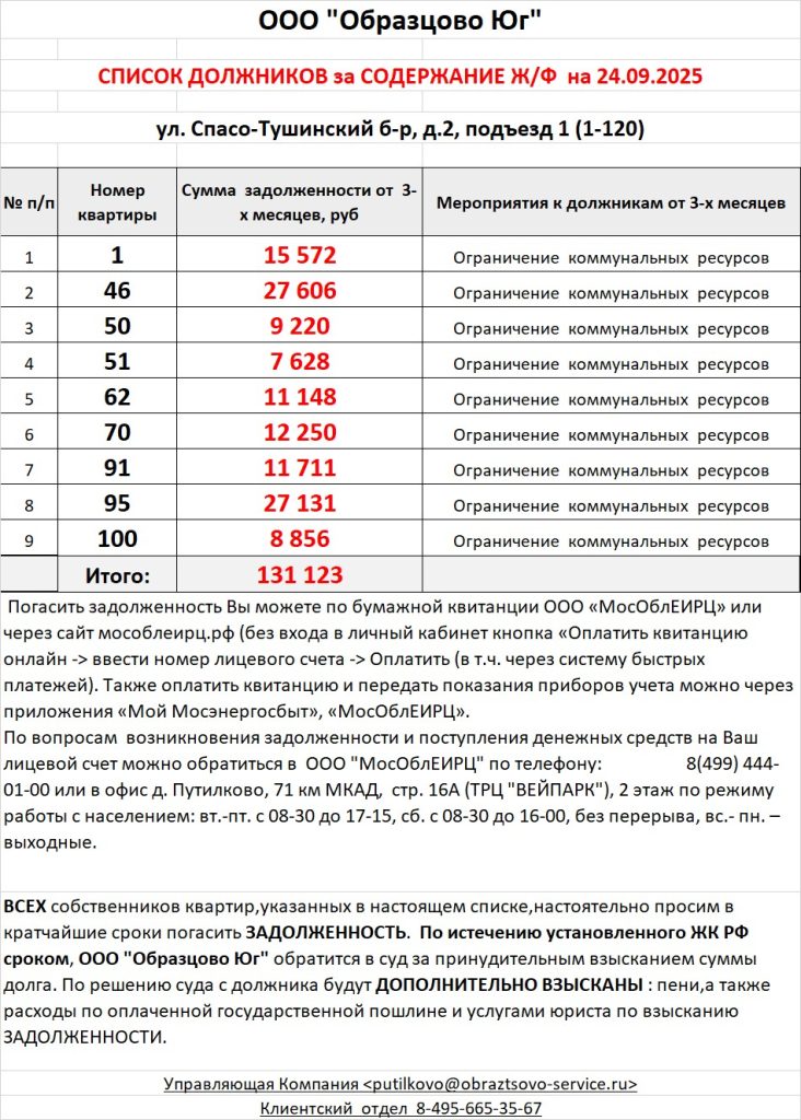 Список должников по коммунальным платежам Спасо-Тушинский бульвар, 9