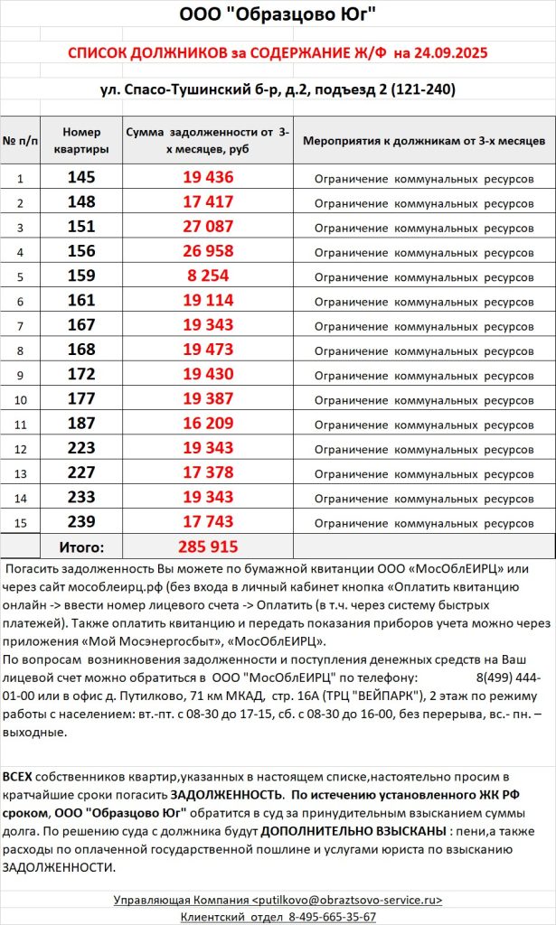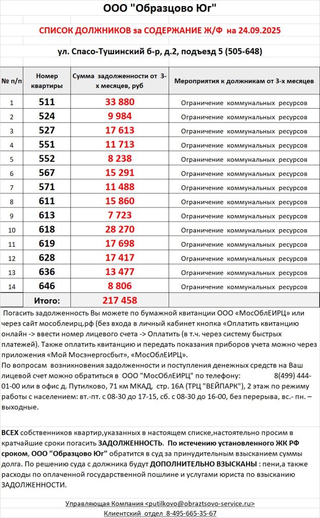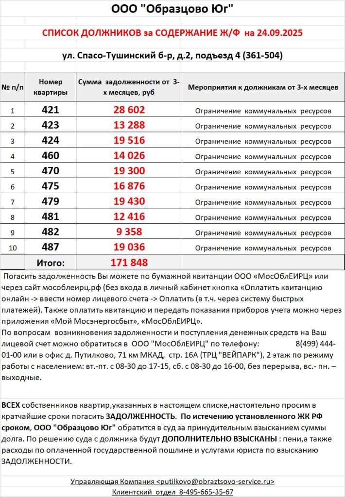 Список должников по коммунальным платежам Спасо-Тушинский бульвар, 2