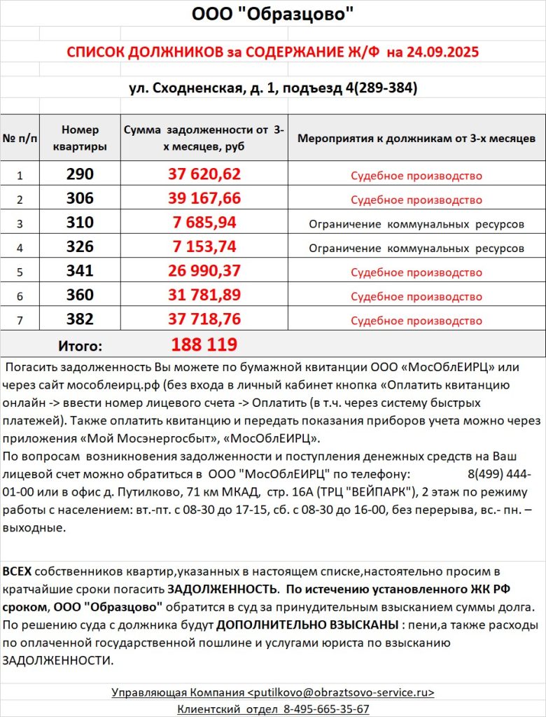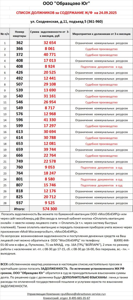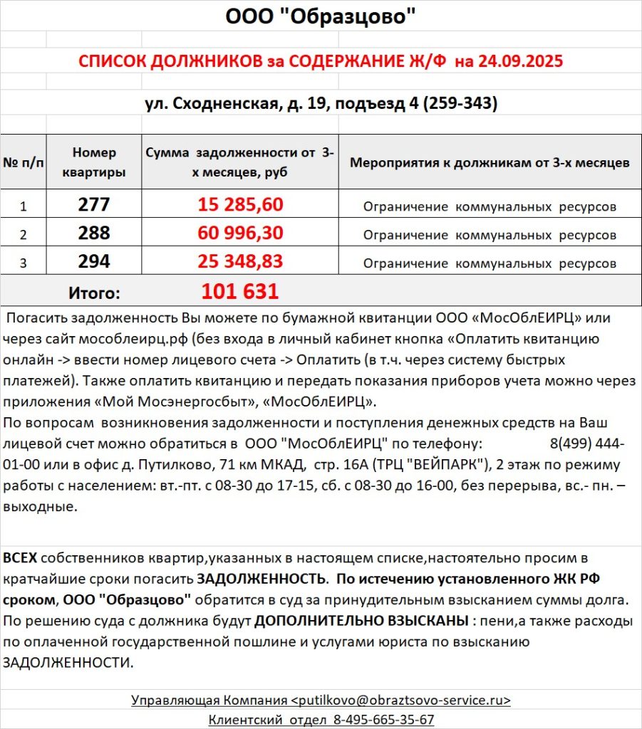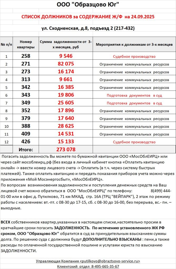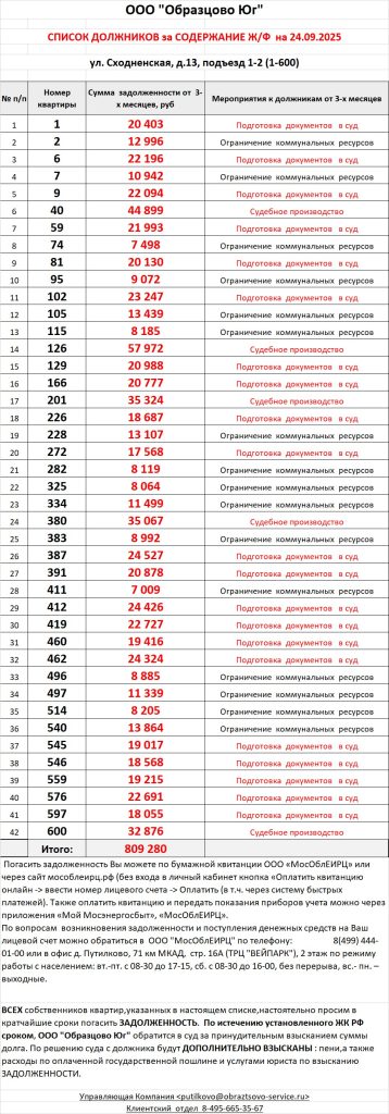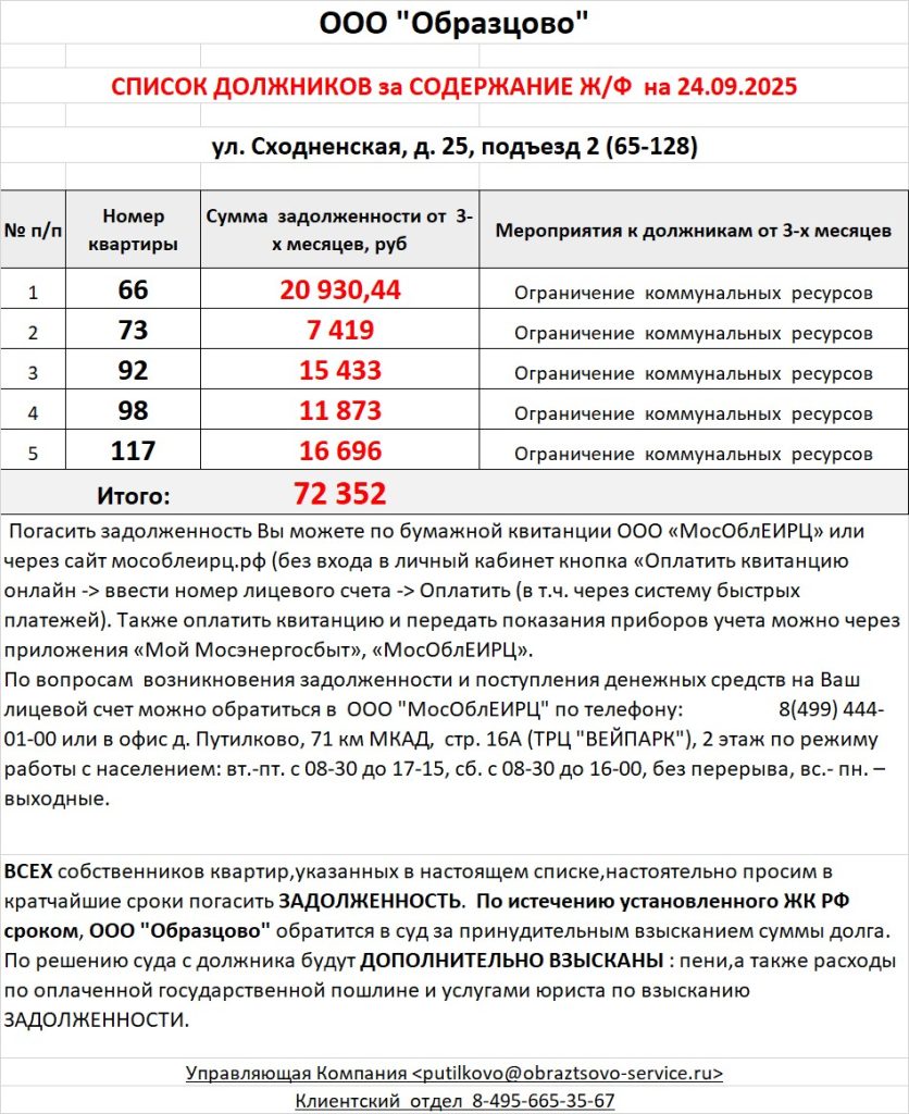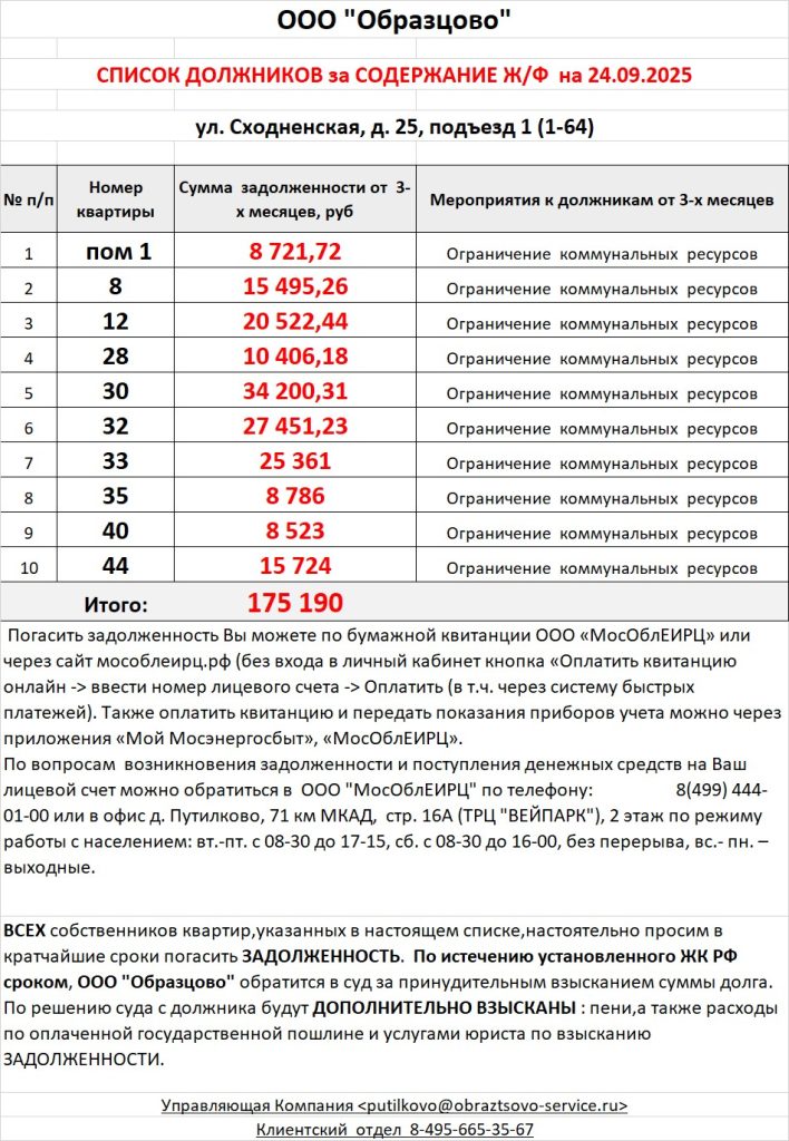 Список должников по коммунальным платежам ул. Сходненская, 25