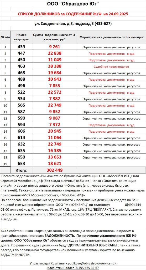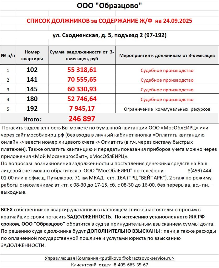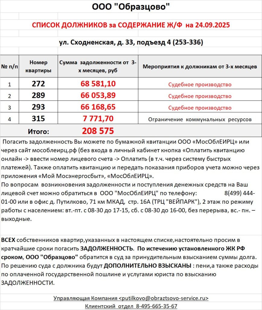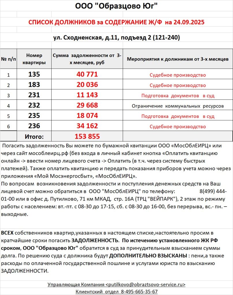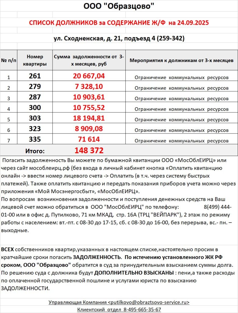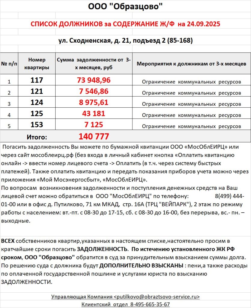 Список должников по коммунальным платежам ул. Сходненская, 25
