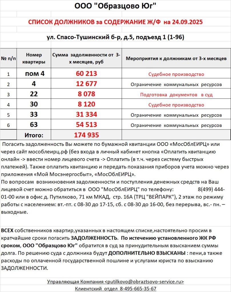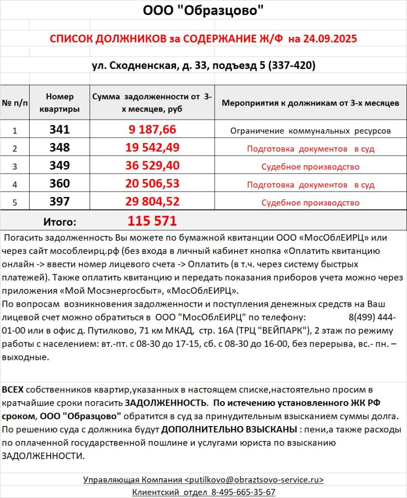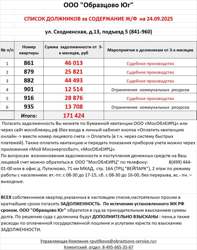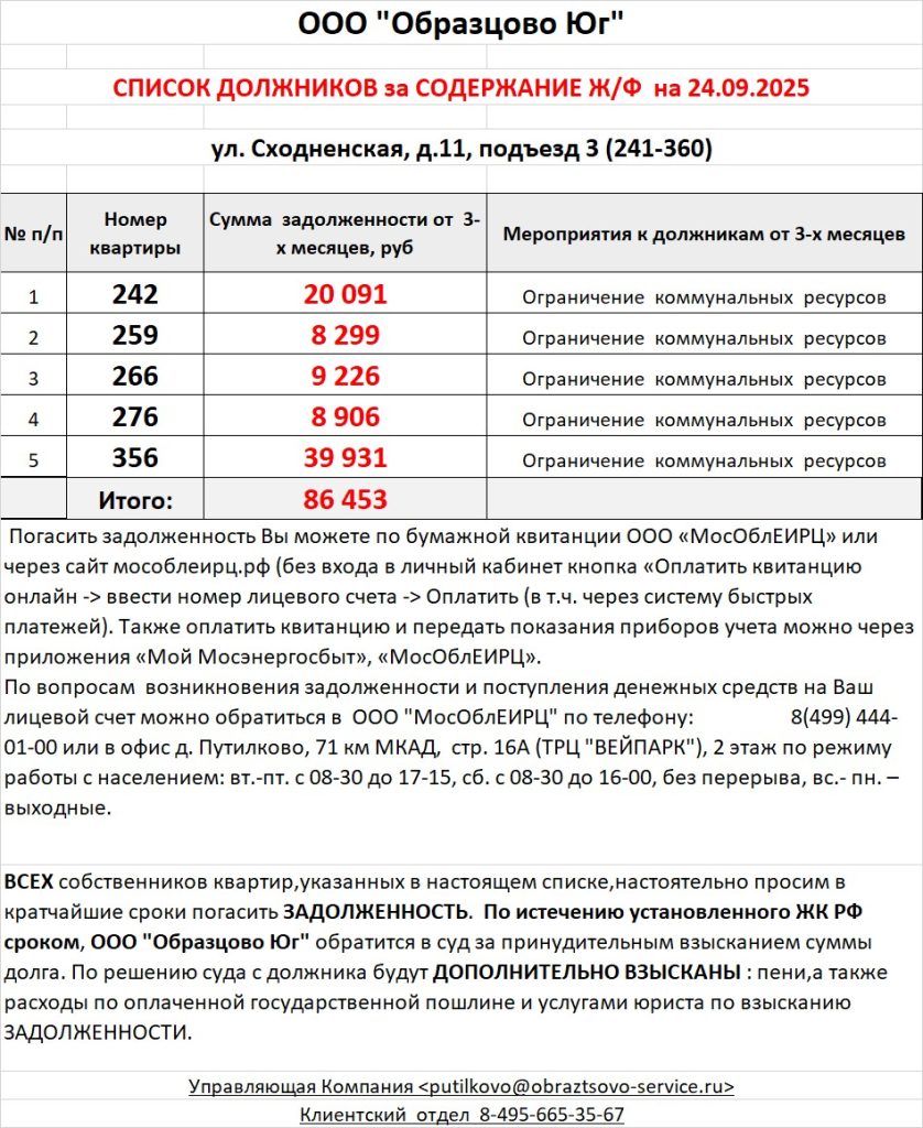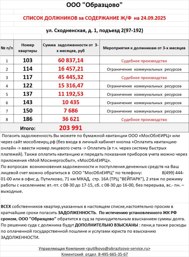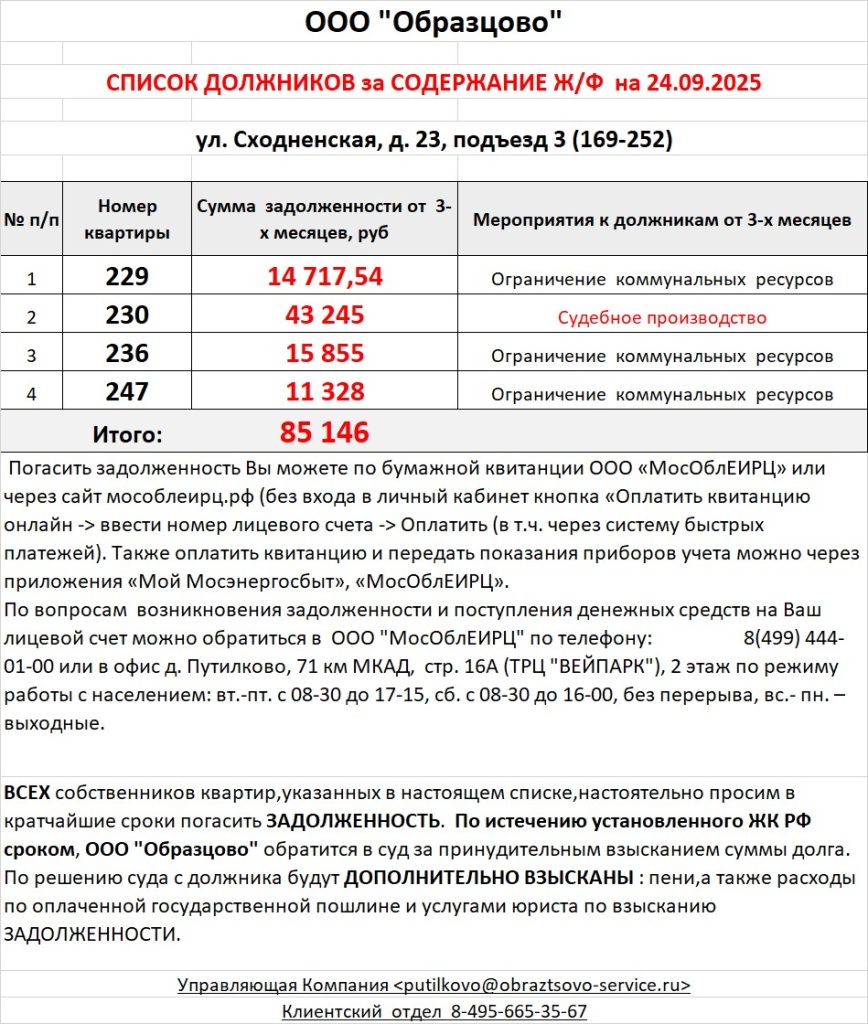 Список должников по коммунальным платежам ул. Сходненская, 25