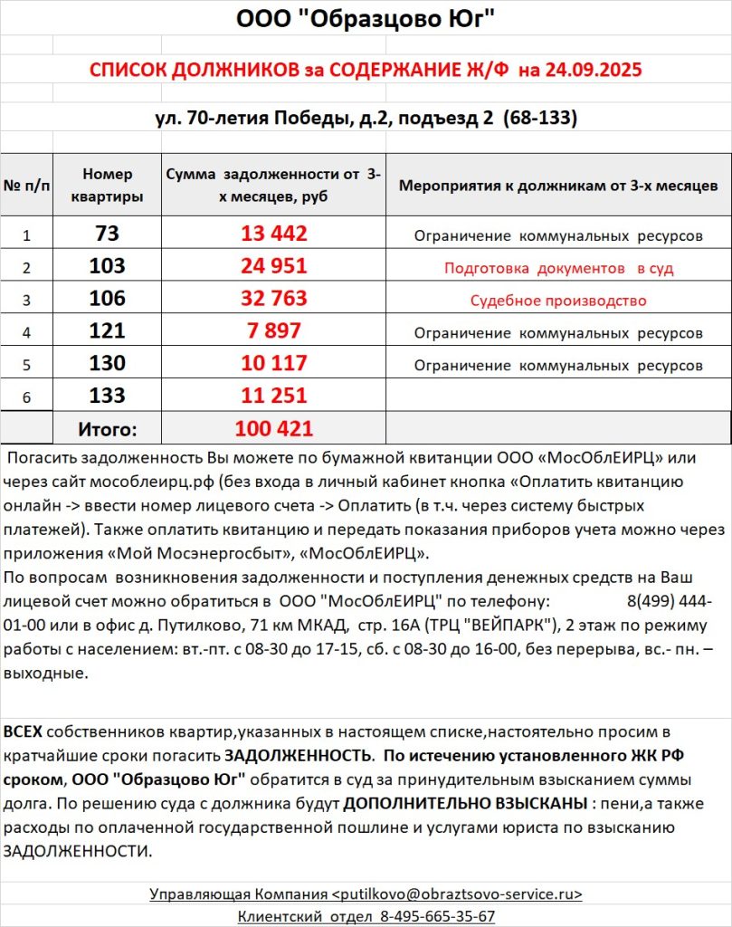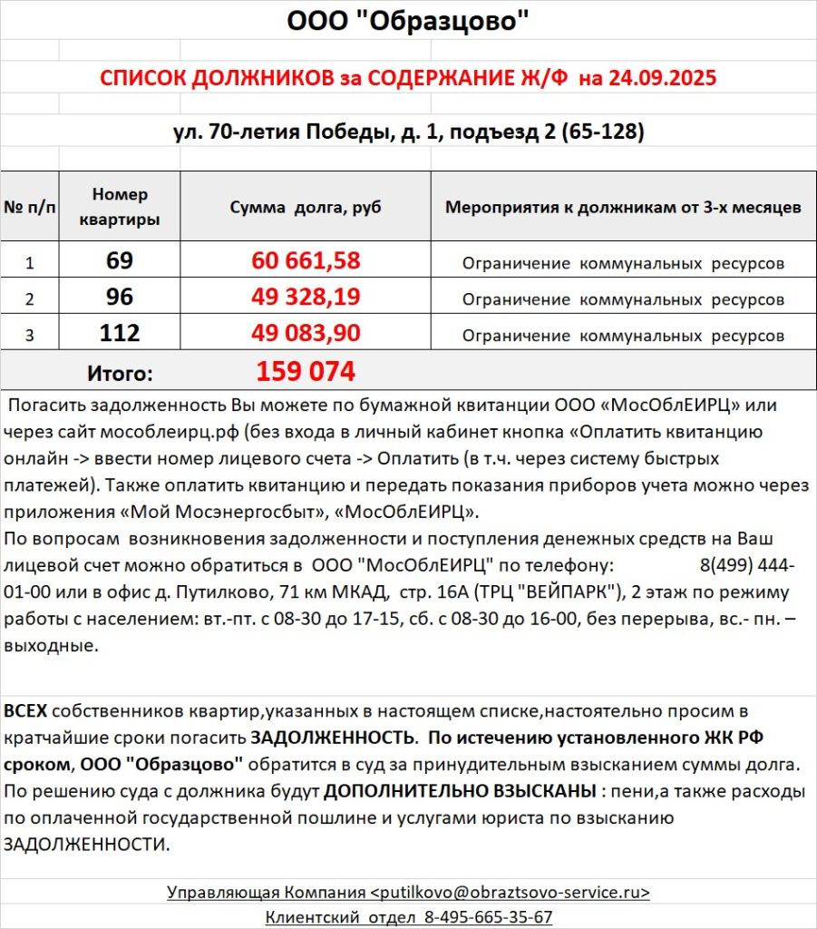 Список должников по коммунальным платежам ул. 70-летия Победы, 2