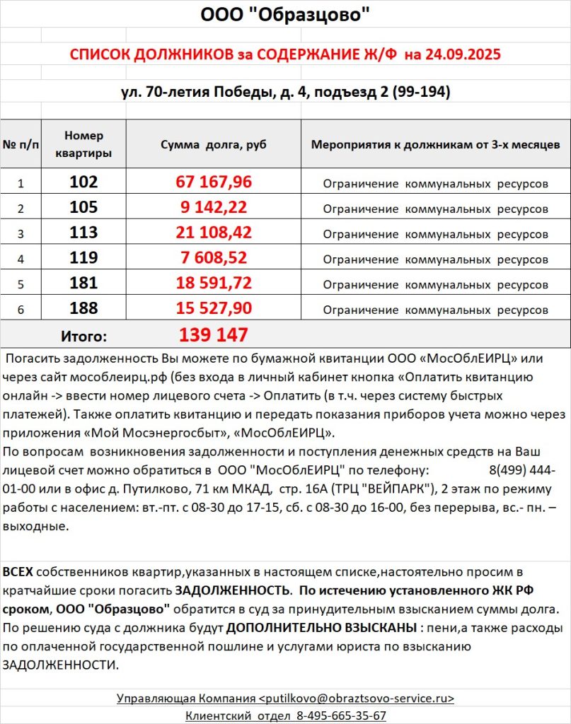 По вопросам имеющейся дебиторской задолженности и начислениям просим обращаться в МособлЕИРЦ, ТЦ «ВЭЙ Парк», 2 этаж.