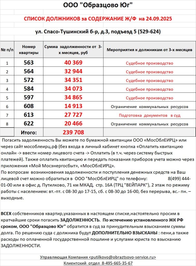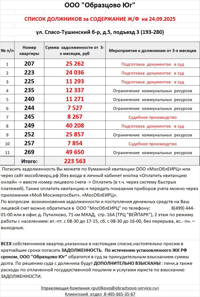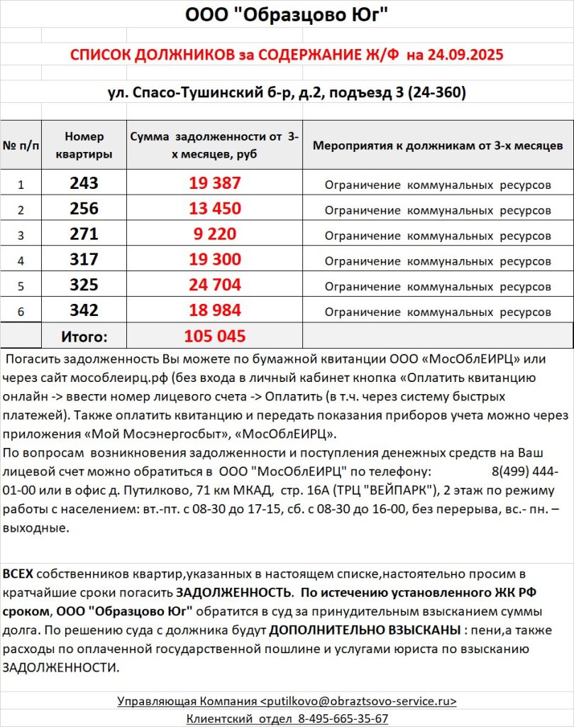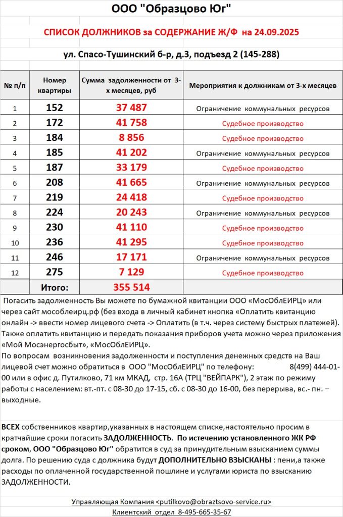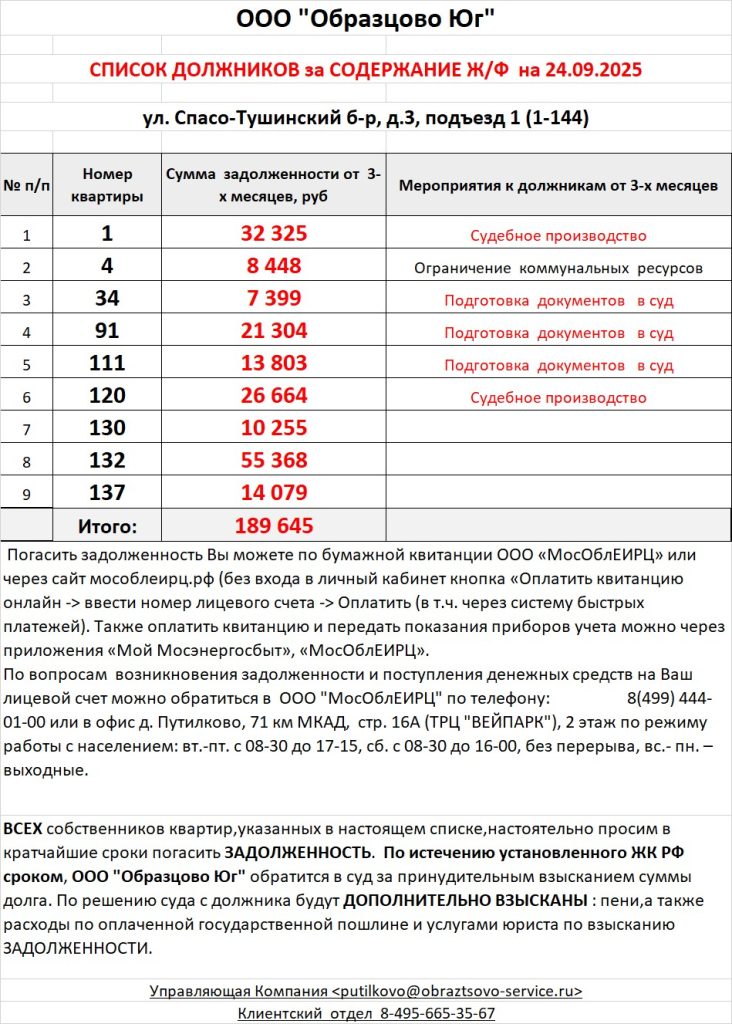 Список должников по коммунальным платежам Спасо-Тушинский бульвар, 3