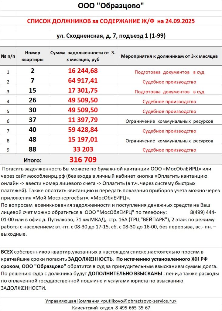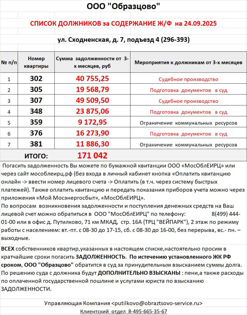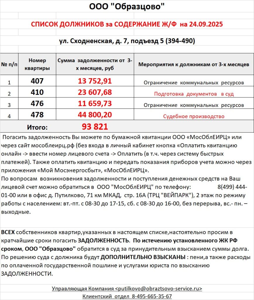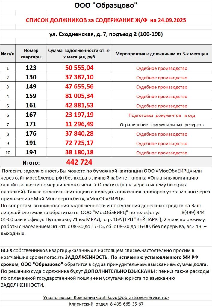 Список должников по коммунальным платежам ул. Сходненская, 7