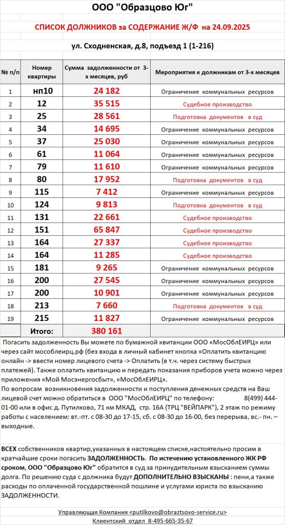 Список должников по коммунальным платежам ул. Сходненская, 8