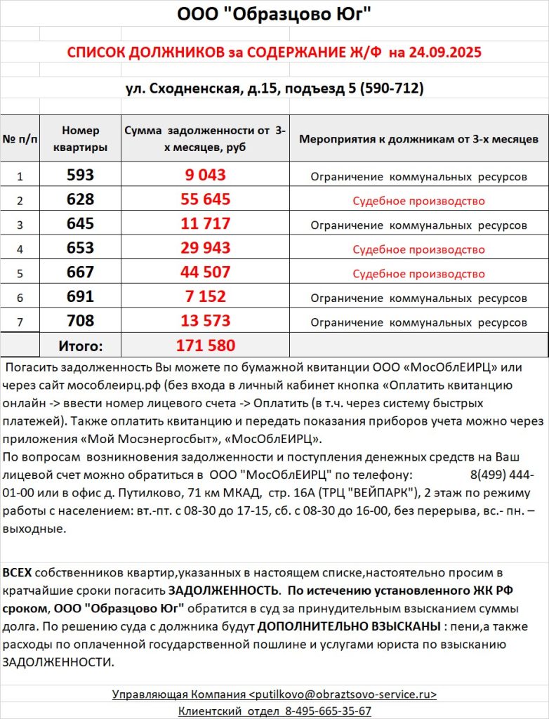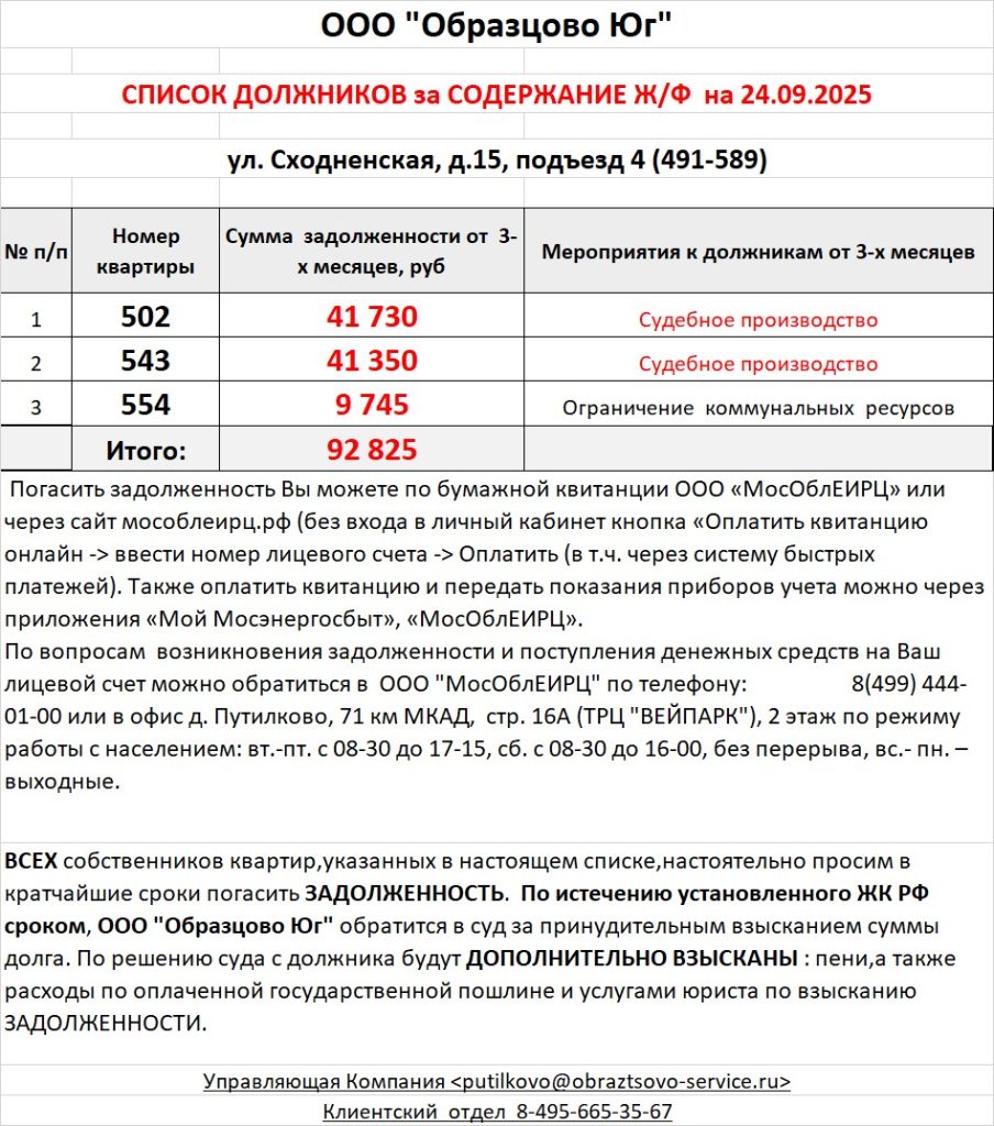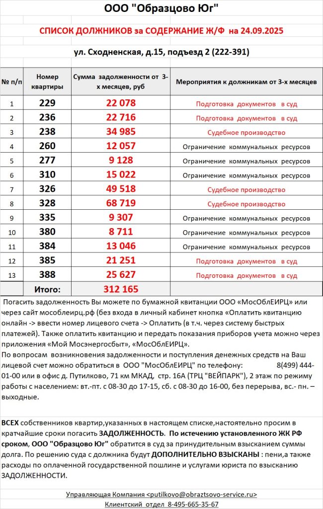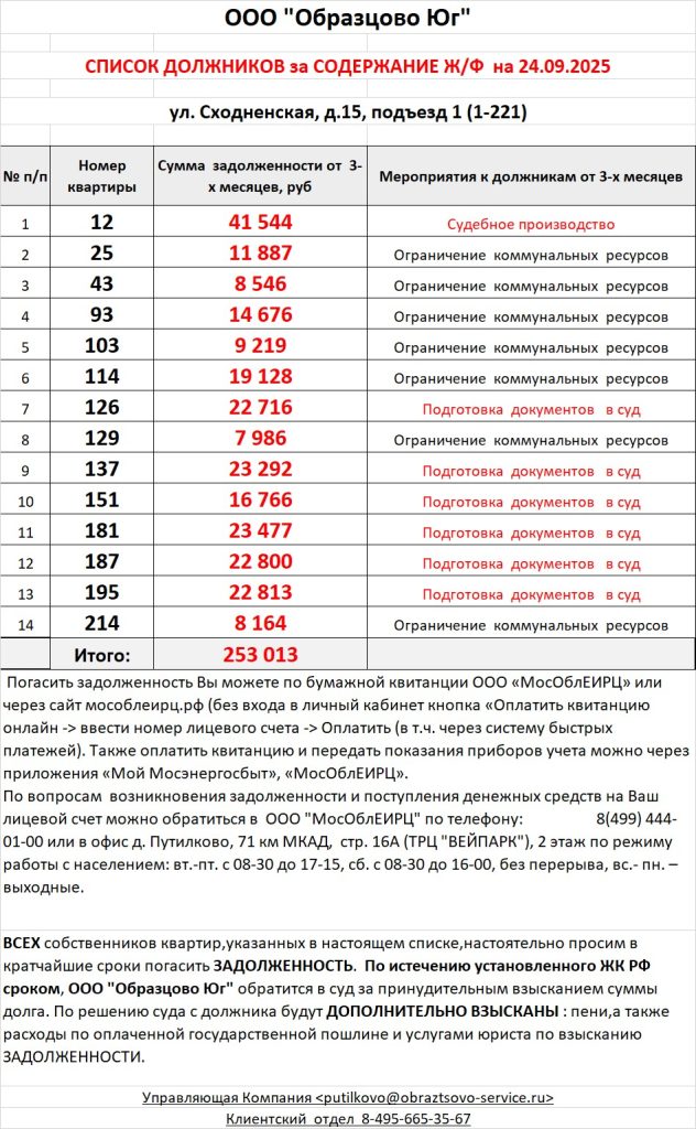 Список должников по коммунальным платежам ул. Сходненская, 15