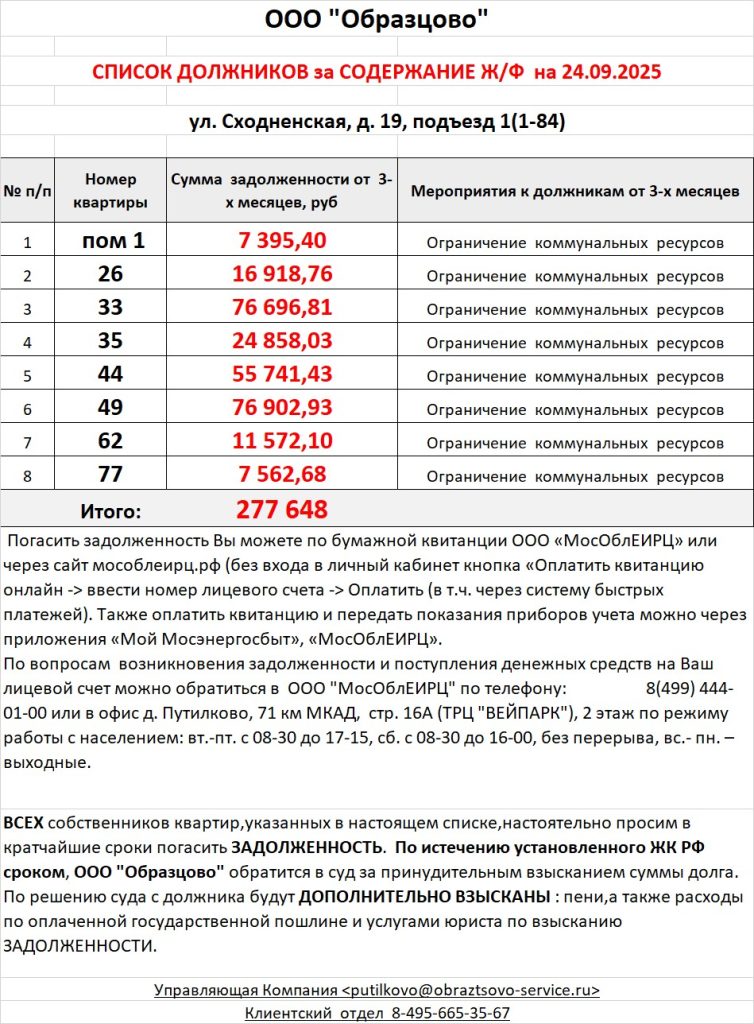 Список должников по коммунальным платежам ул. Сходненская, 19
