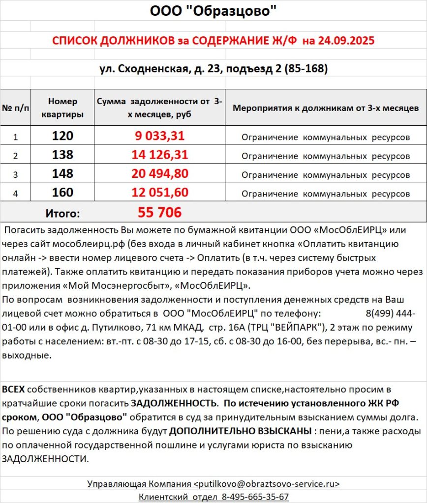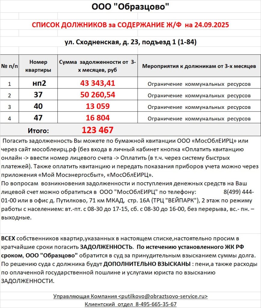 Список должников по коммунальным платежам ул. Сходненская, 23