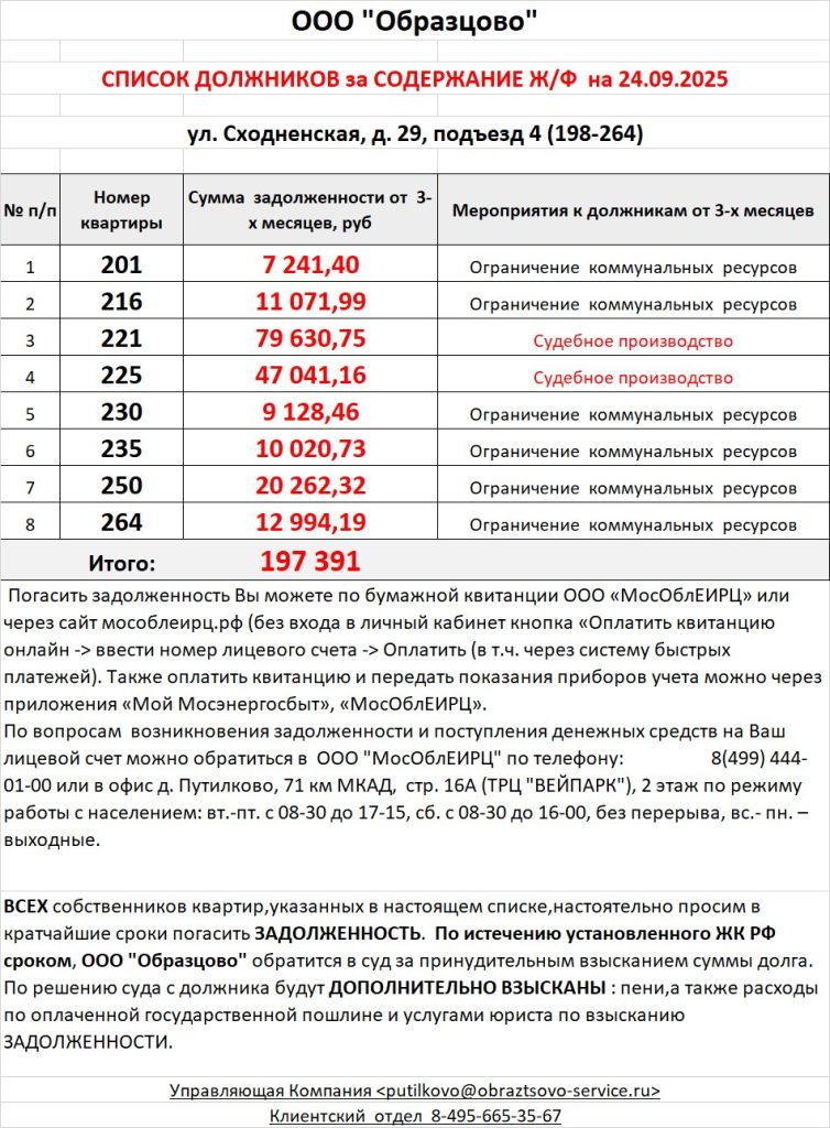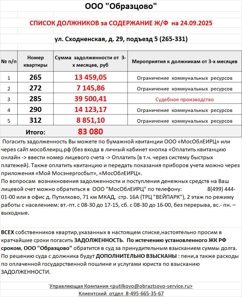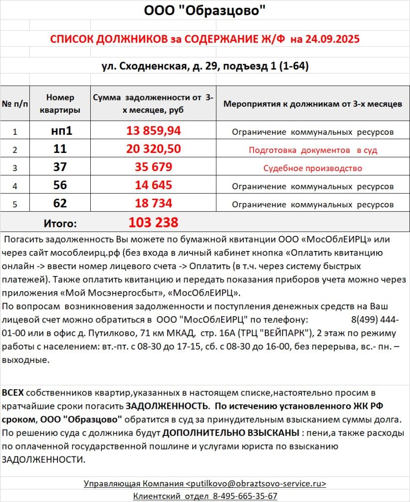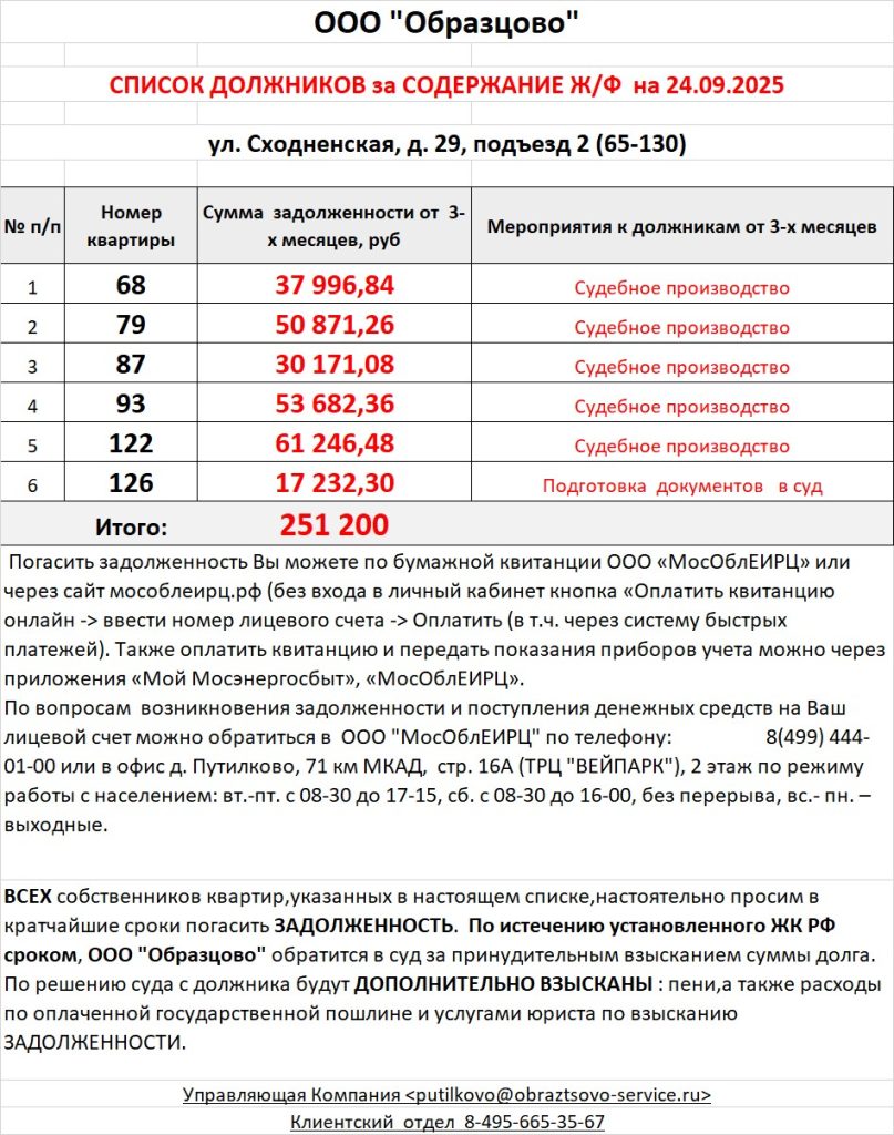 Список должников по коммунальным платежам ул. Сходненская, 29