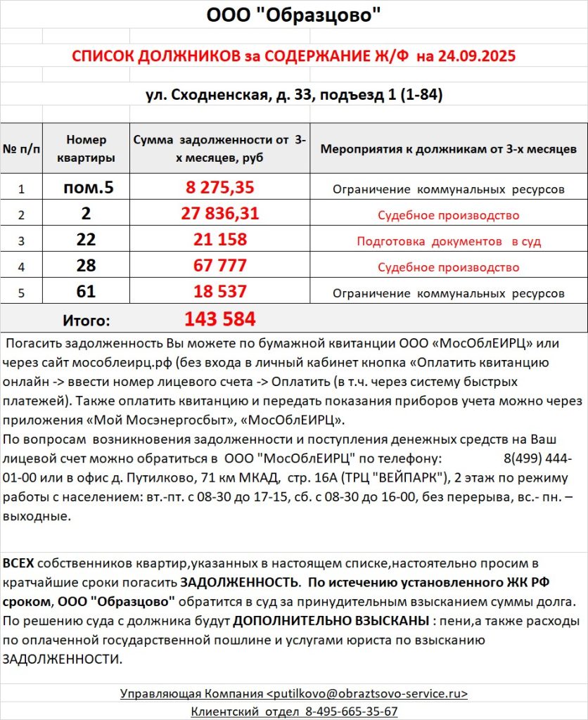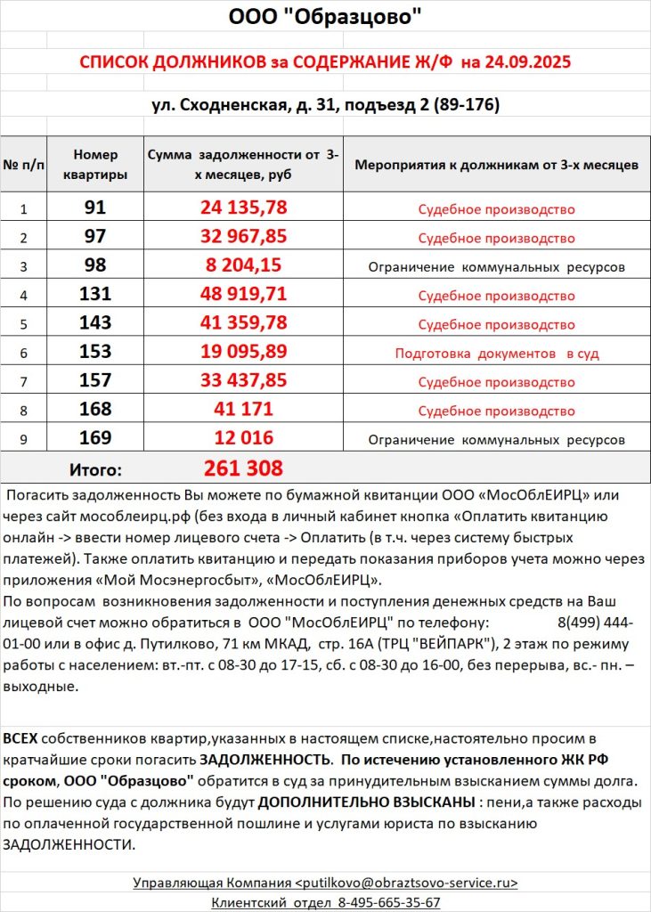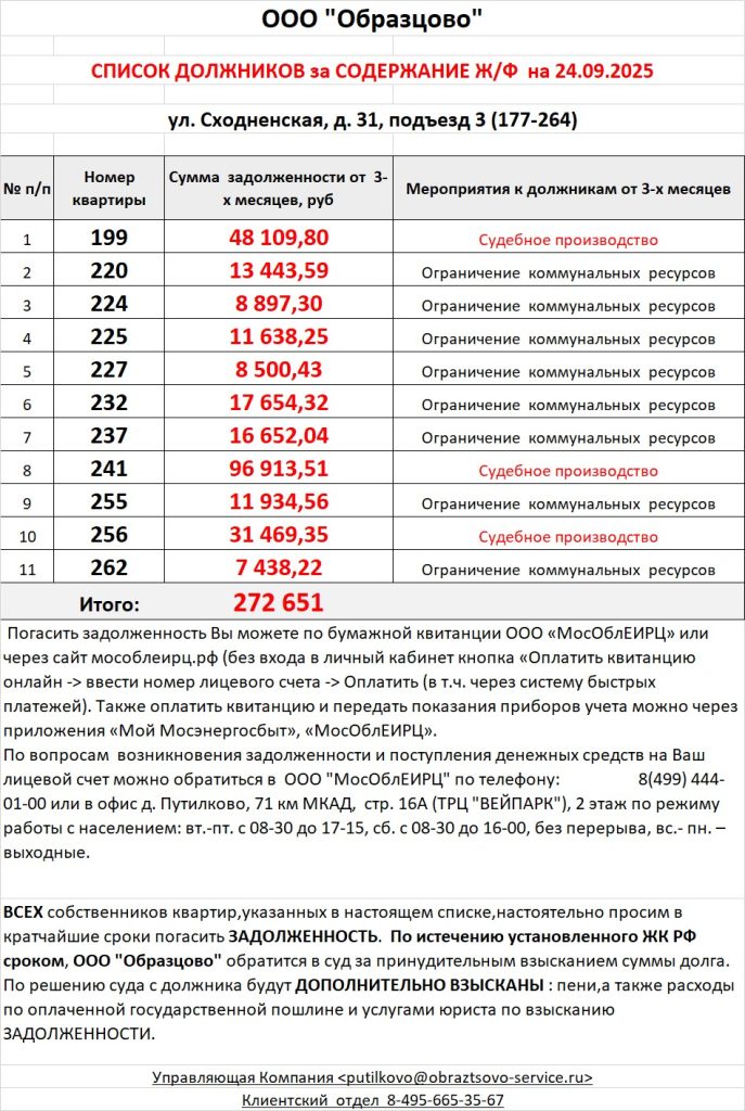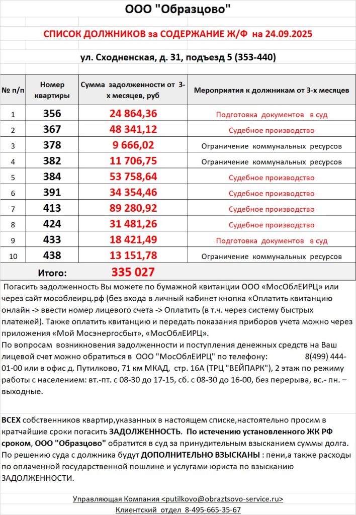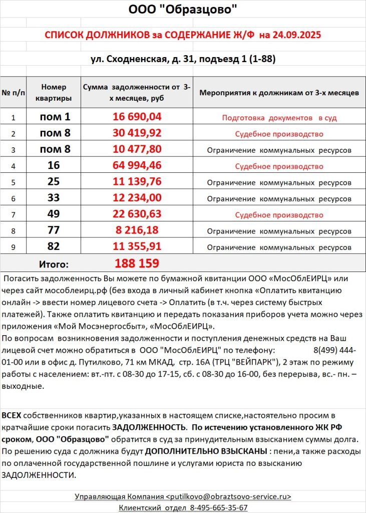 Список должников по коммунальным платежам ул. Сходненская, 31