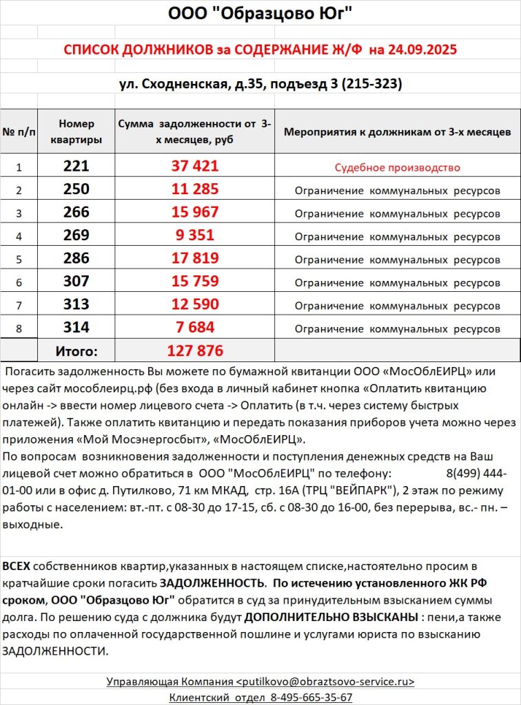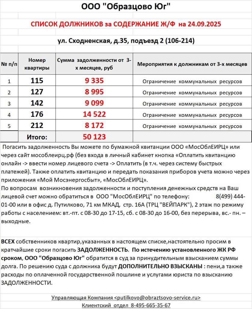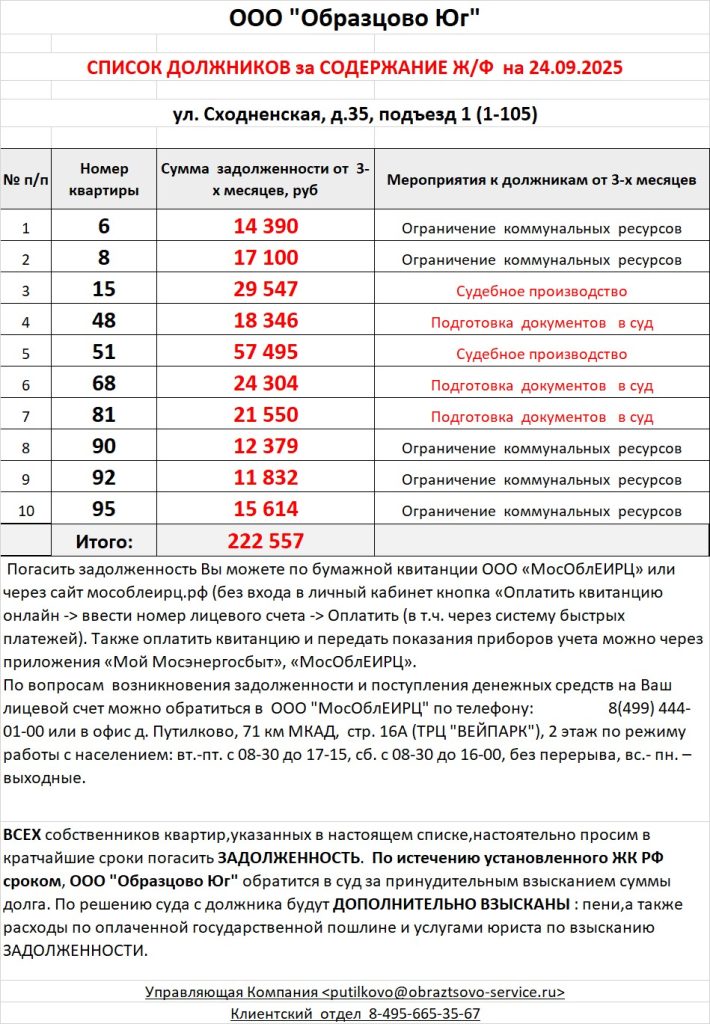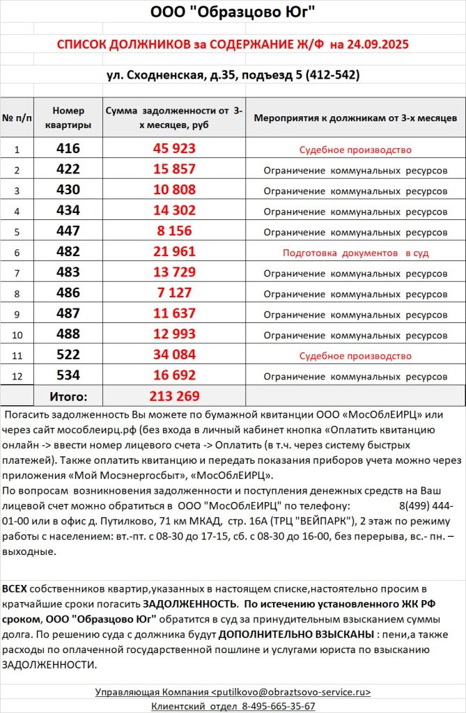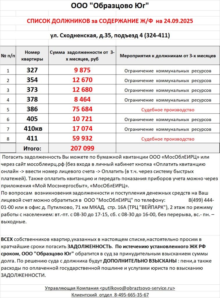 Список должников по коммунальным платежам ул. Сходненская, 35