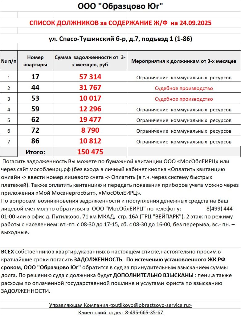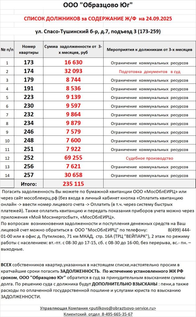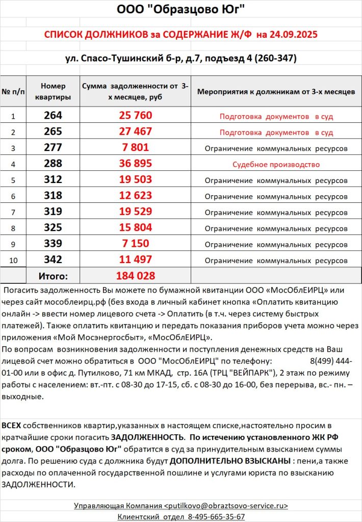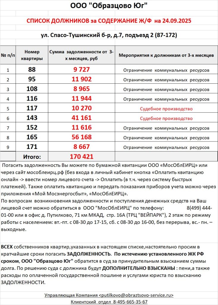 Список должников по коммунальным платежам Спасо-Тушинский бульвар, 7
