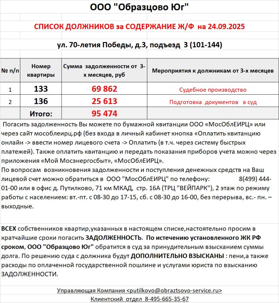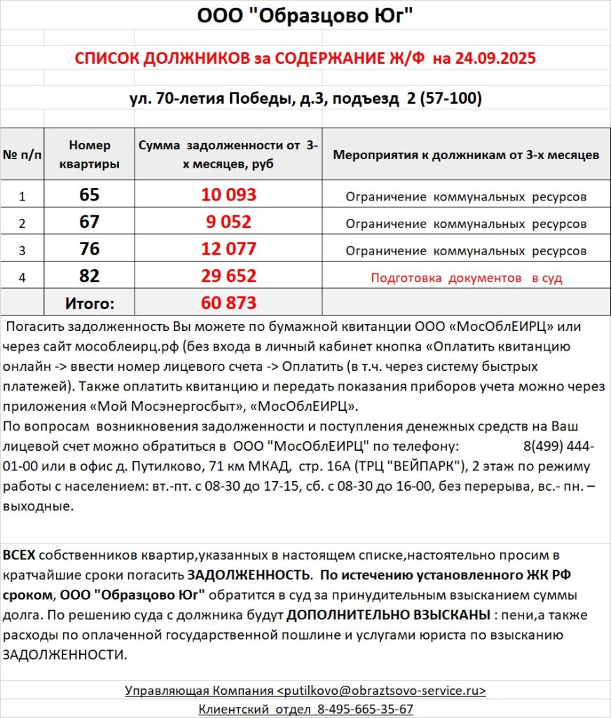 Список должников по коммунальным платежам ул. 70-летия Победы, 3