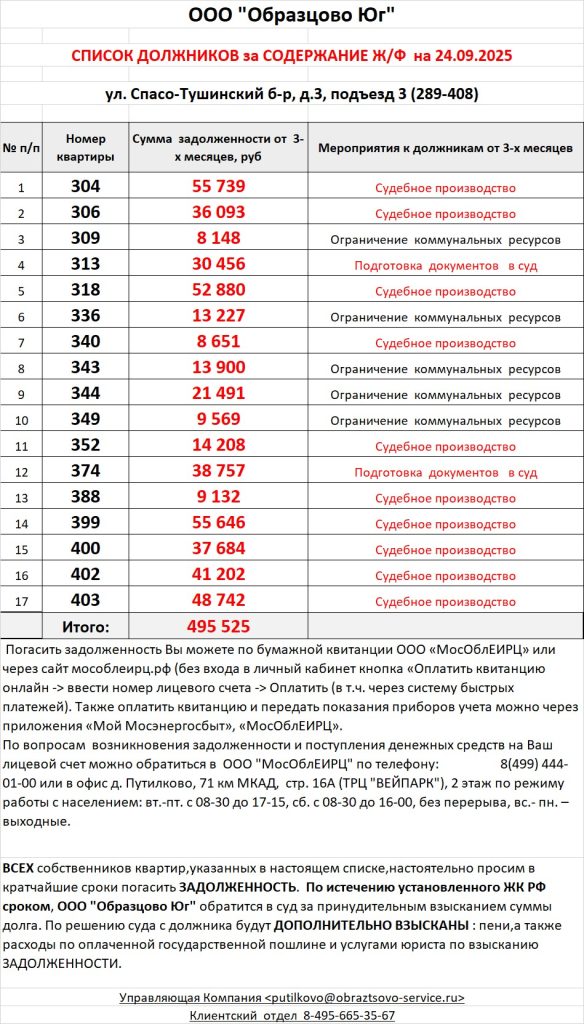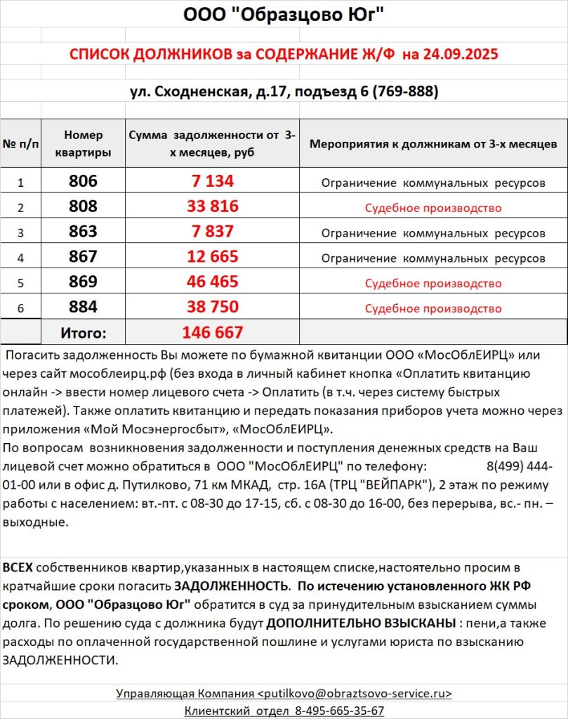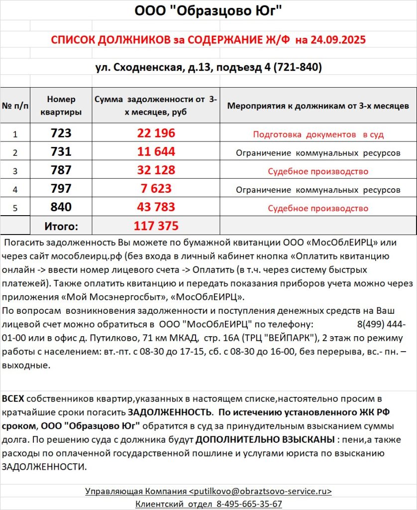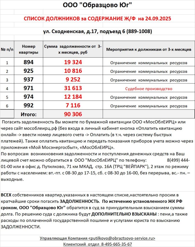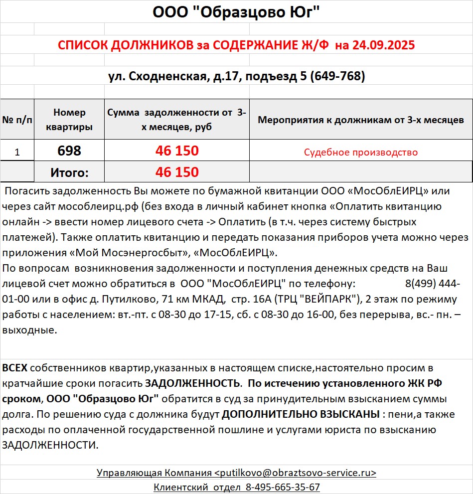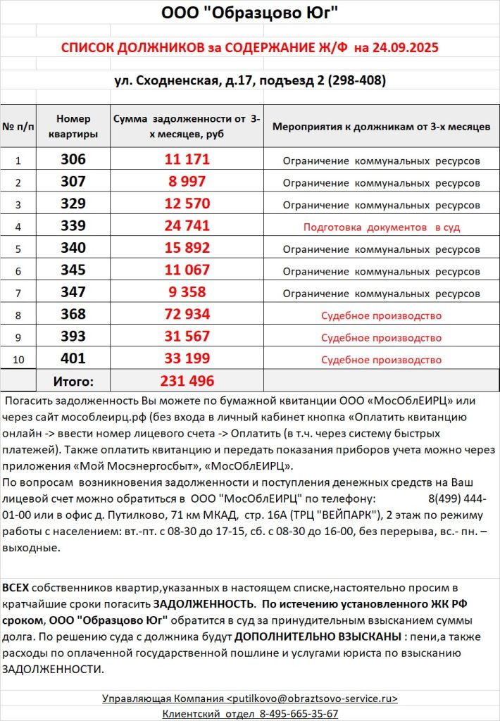Список должников по коммунальным платежам ул. Сходненская, 17