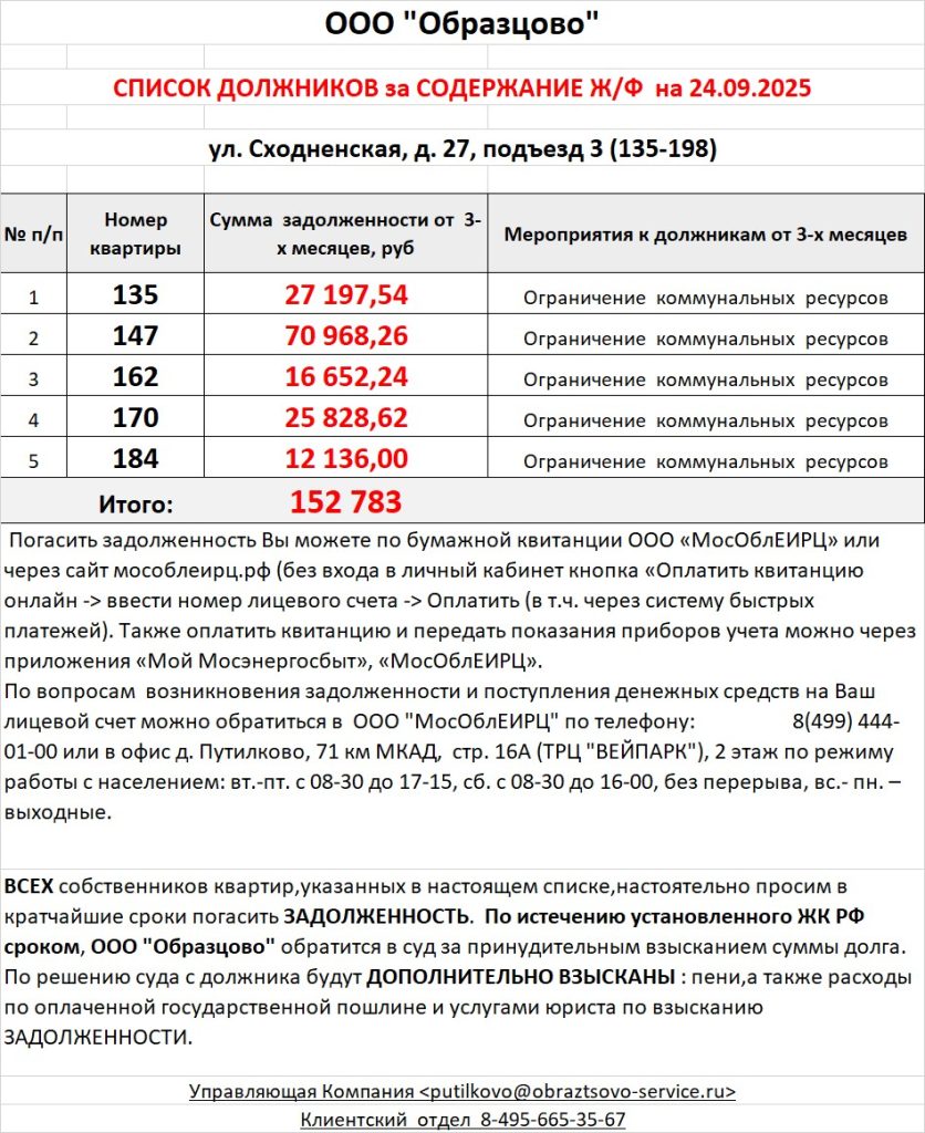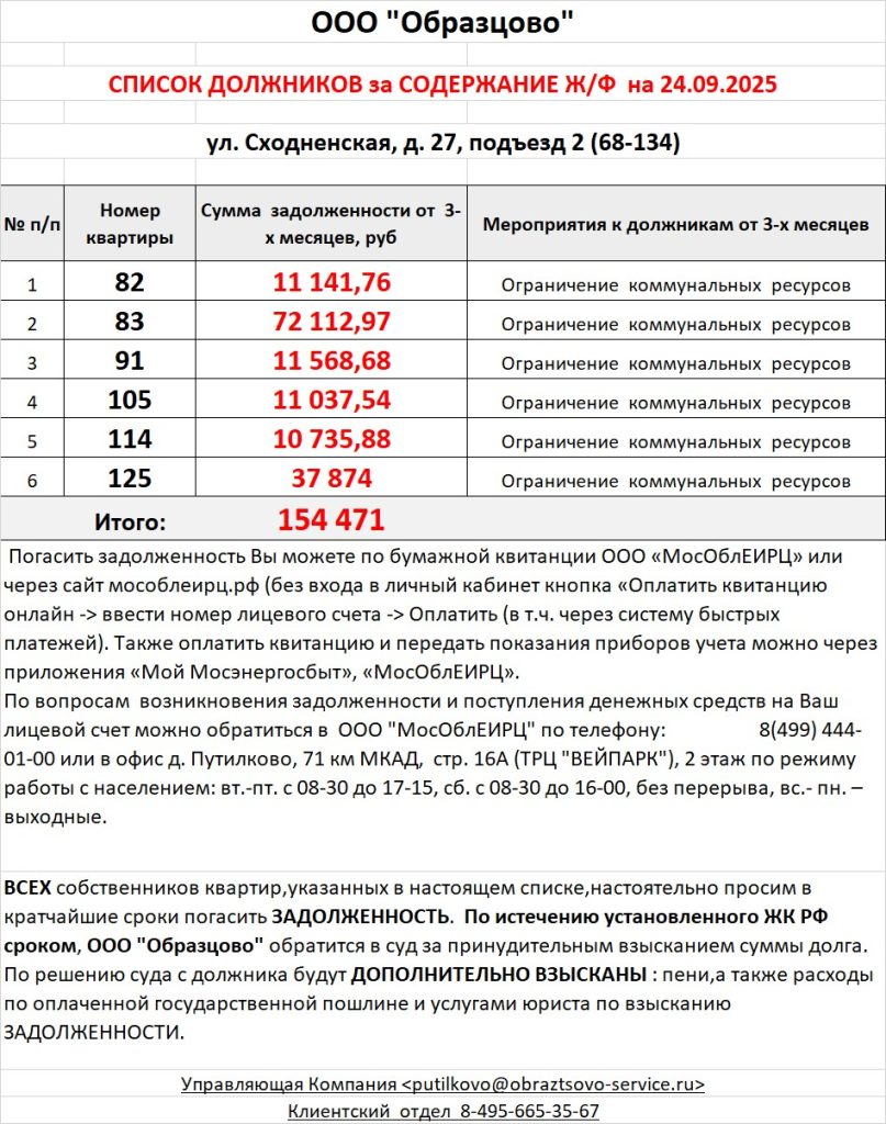 Список должников по коммунальным платежам ул. Сходненская, 27
