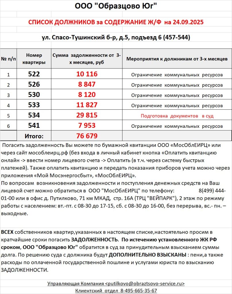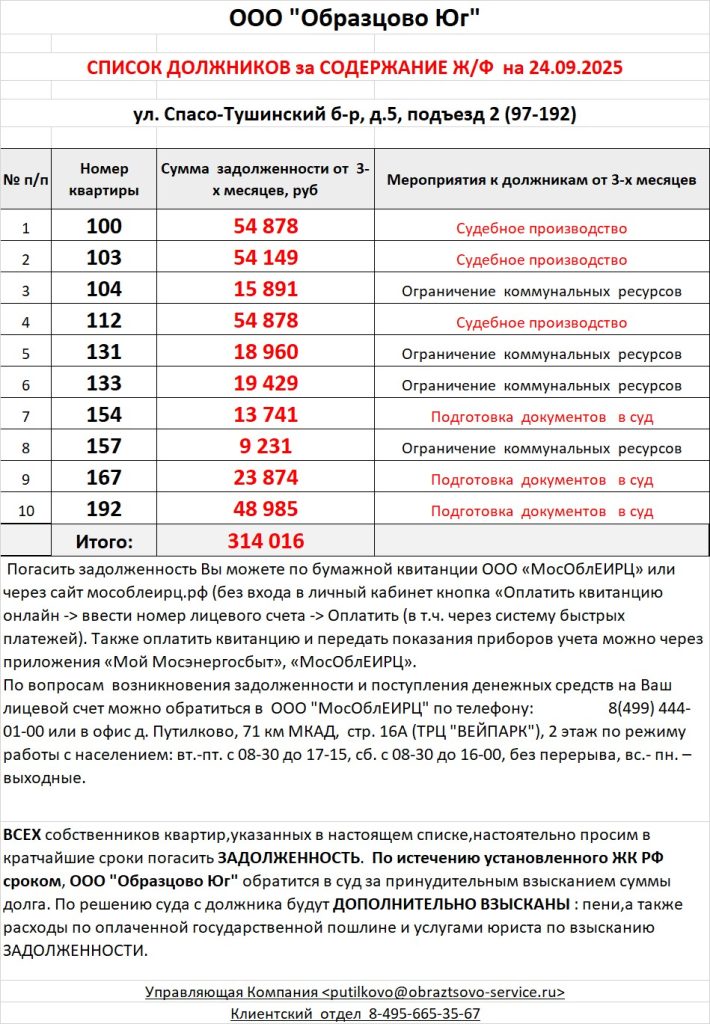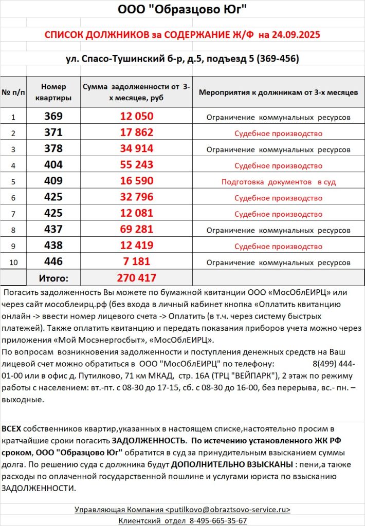 Список должников по коммунальным платежам Спасо-Тушинский бульвар, 5