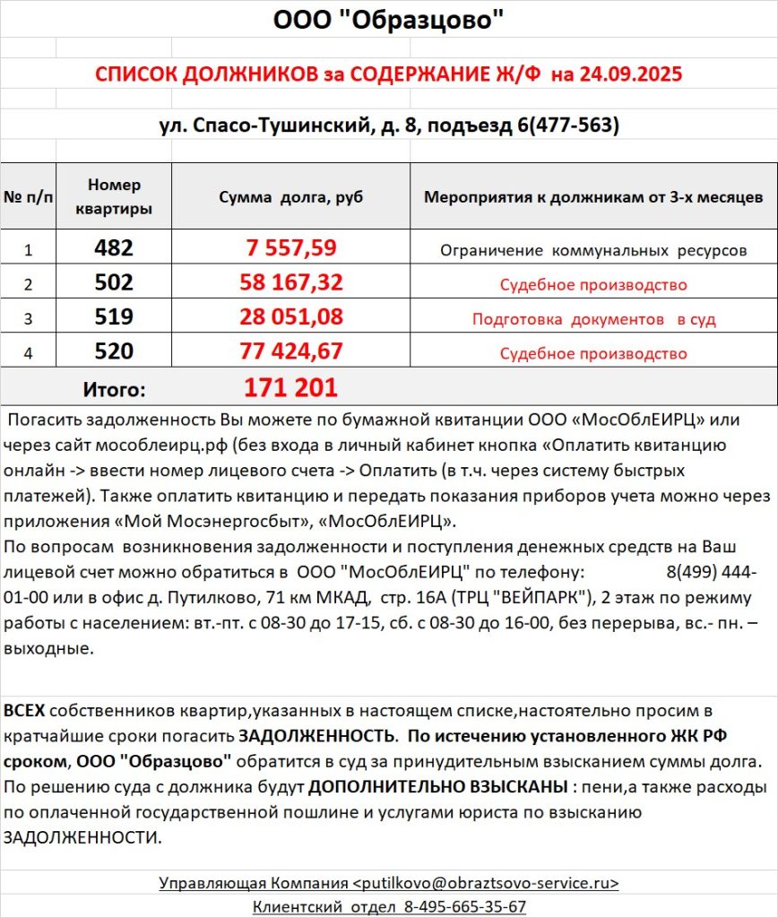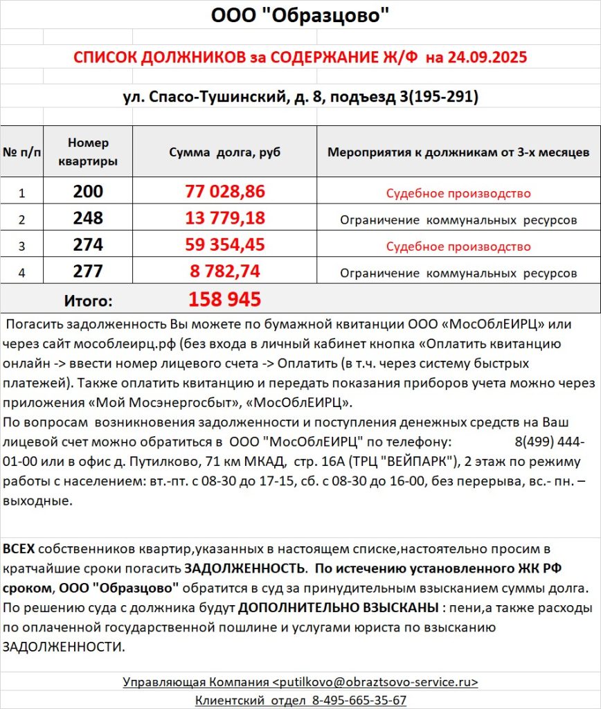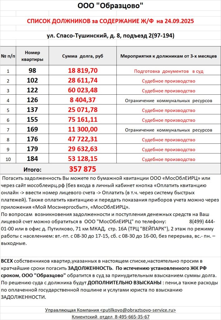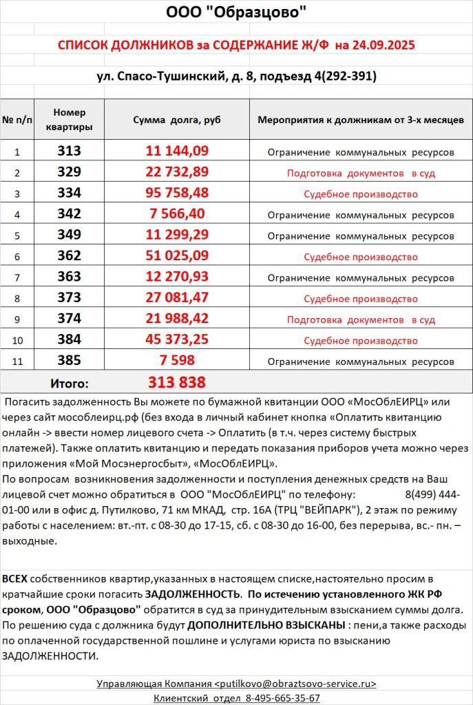 Список должников по коммунальным платежам Спасо-Тушинский бульвар, 8