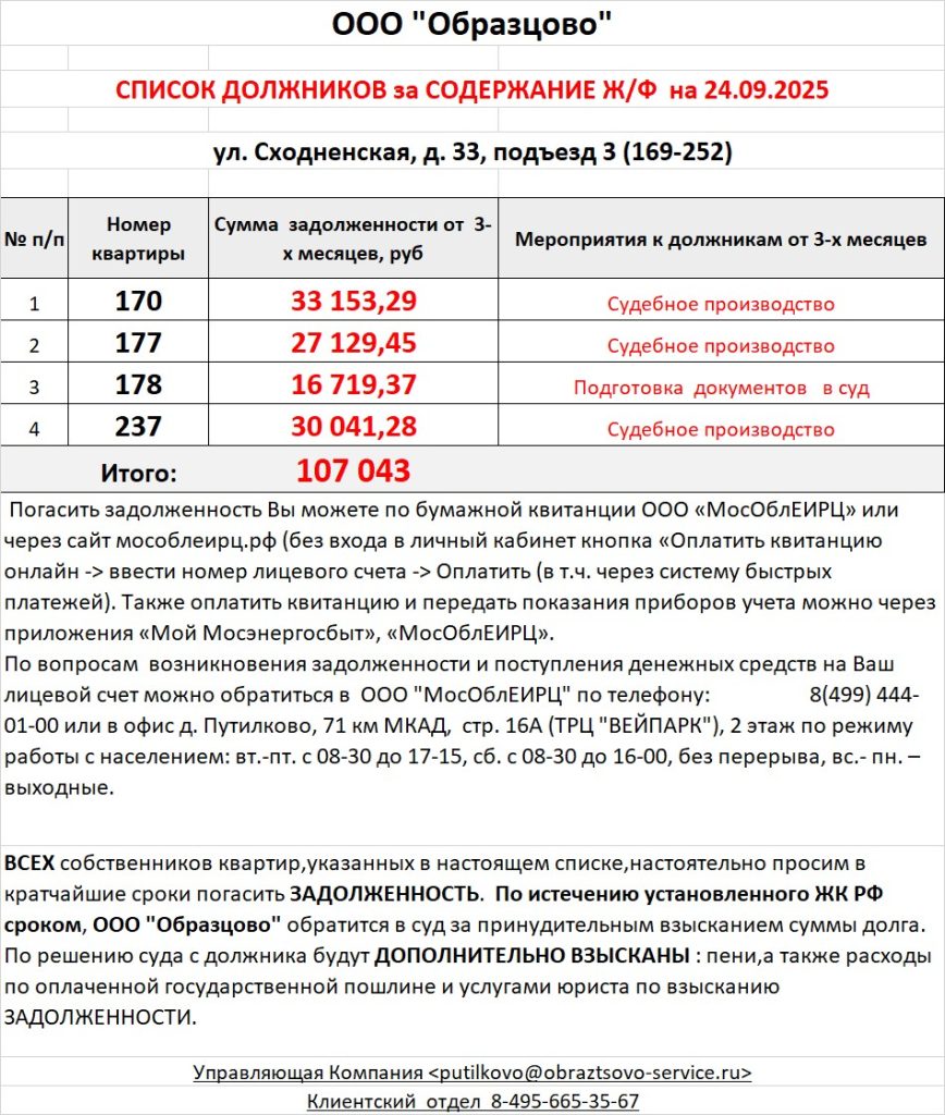 Список должников по коммунальным платежам ул. Сходненская, 33