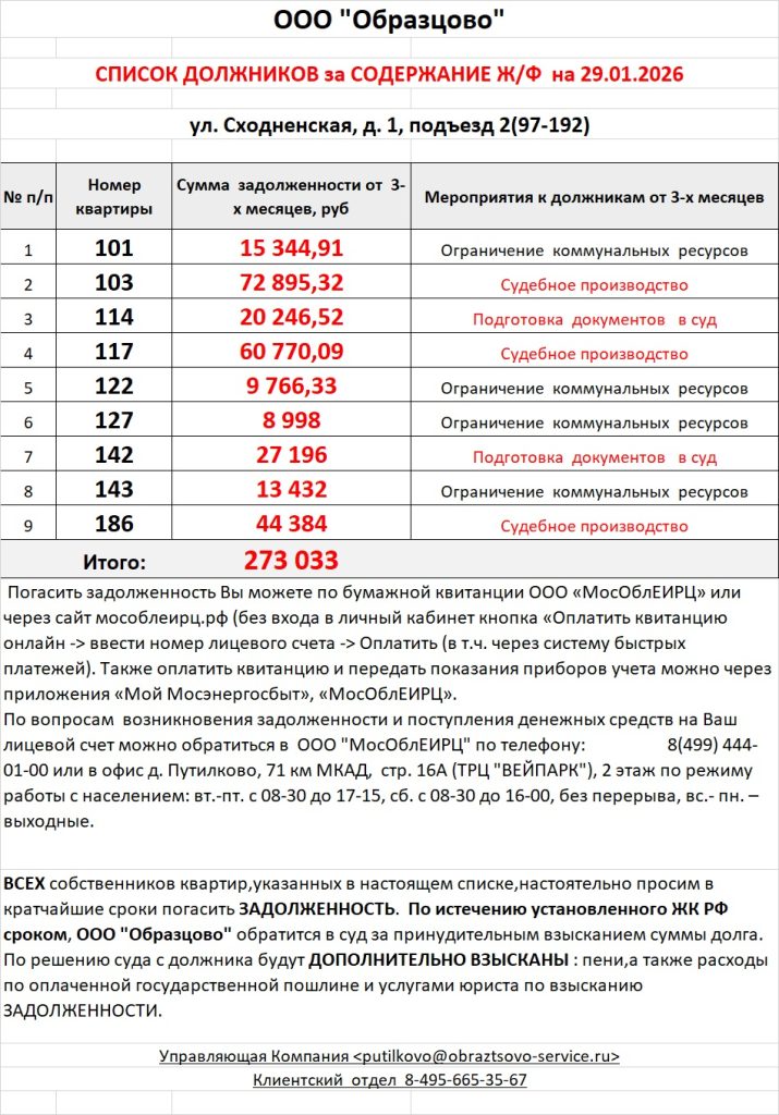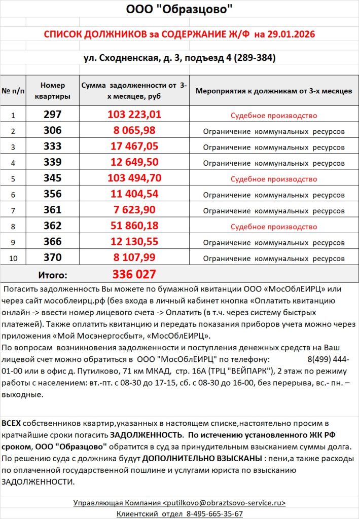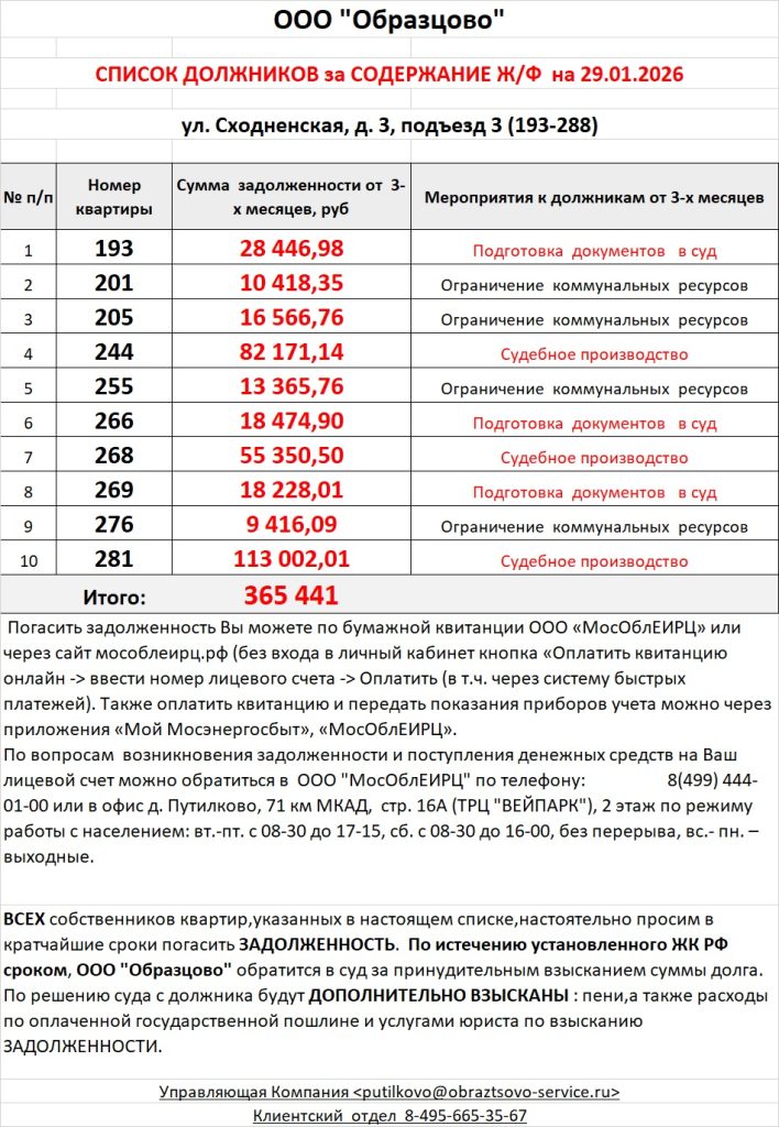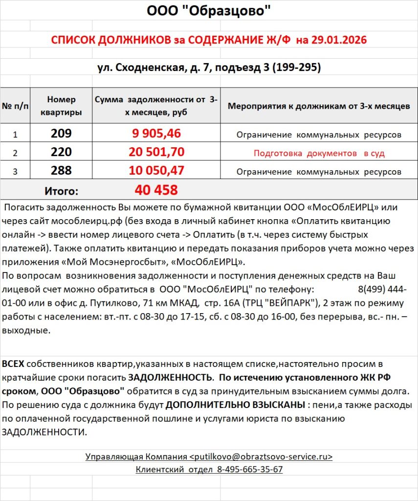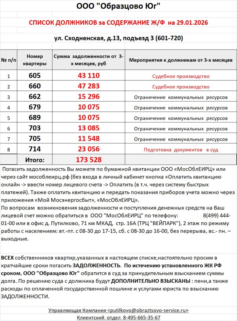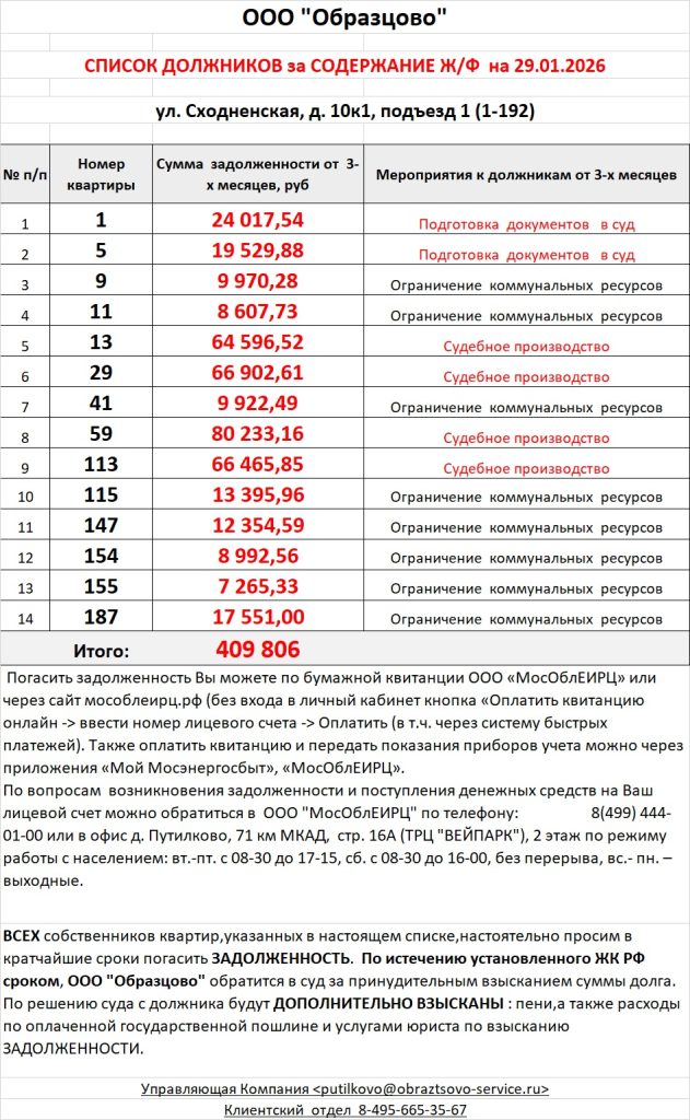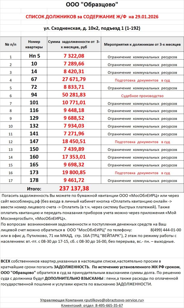 Список должников по коммунальным платежам ул. Сходненская, 10к1, 10к2, 10к3